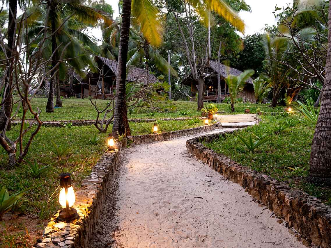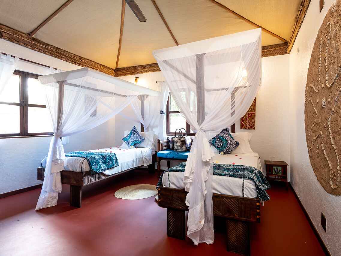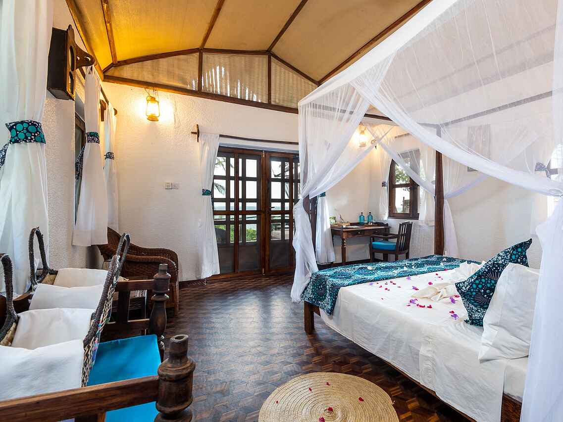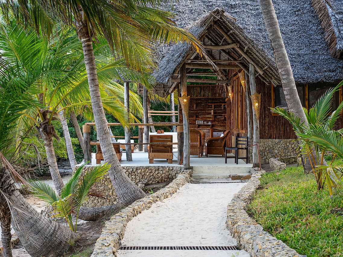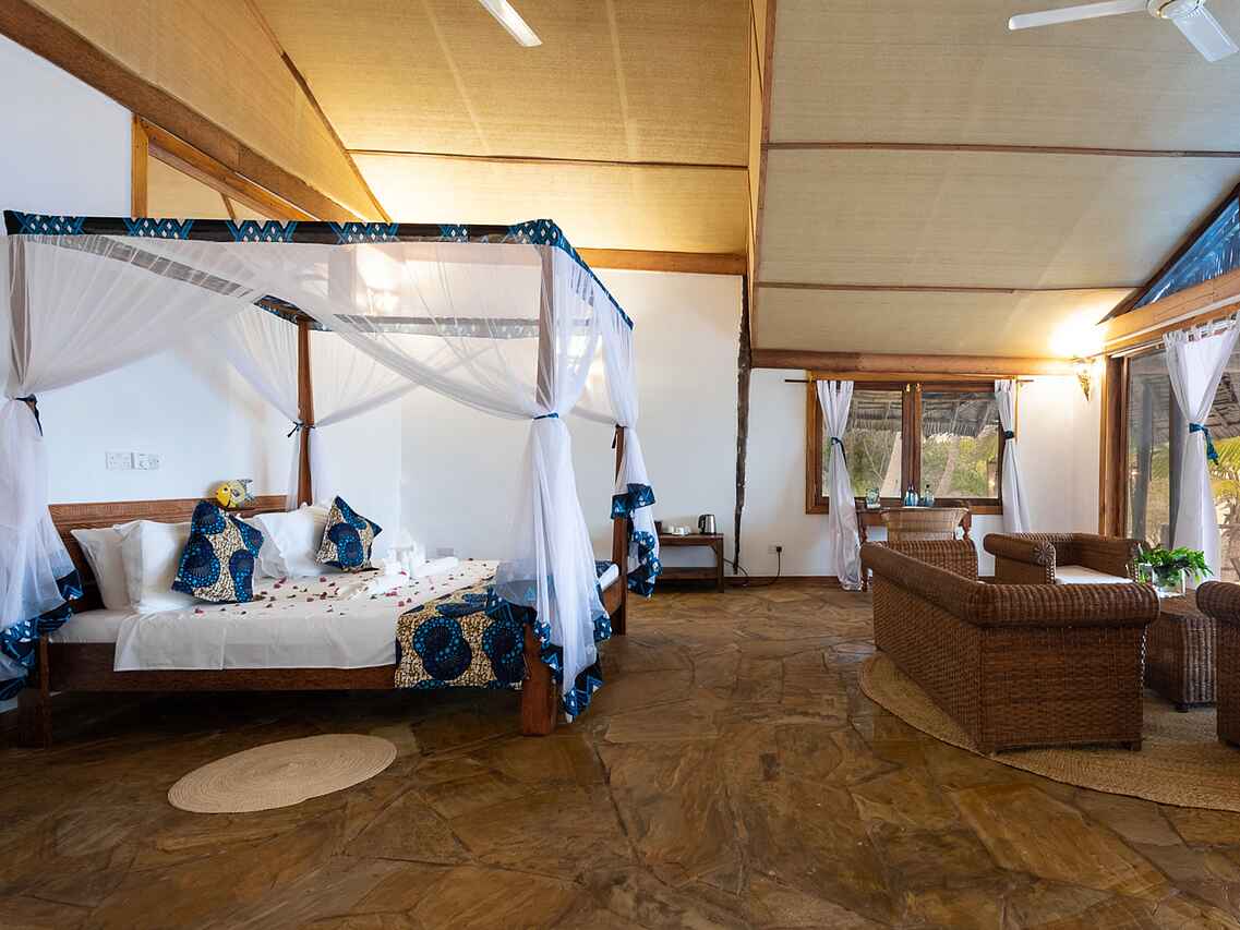 Die neun luxuriösen Bungalow-Suiten sind zwischen Kokospalmen gelegen und bieten einen wunderbaren Blick auf die Bucht. Sie sind geschmackvoll eingerichtet und verbinden traditionellen Swahili-Stil mit modernem Komfort. Jeder Bungalow verfügt über ein großes Doppelbett, wobei auch zwei Einzelbetten möglich sind, jeweils mit Moskitonetz versehen. Dank der kühlen Meeresbrise herrscht stets ein angenehmes Klima, zusätzlich sorgen Deckenventilatoren für Kühlung.