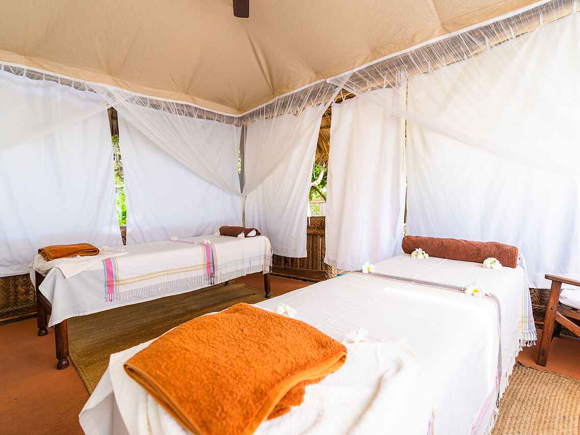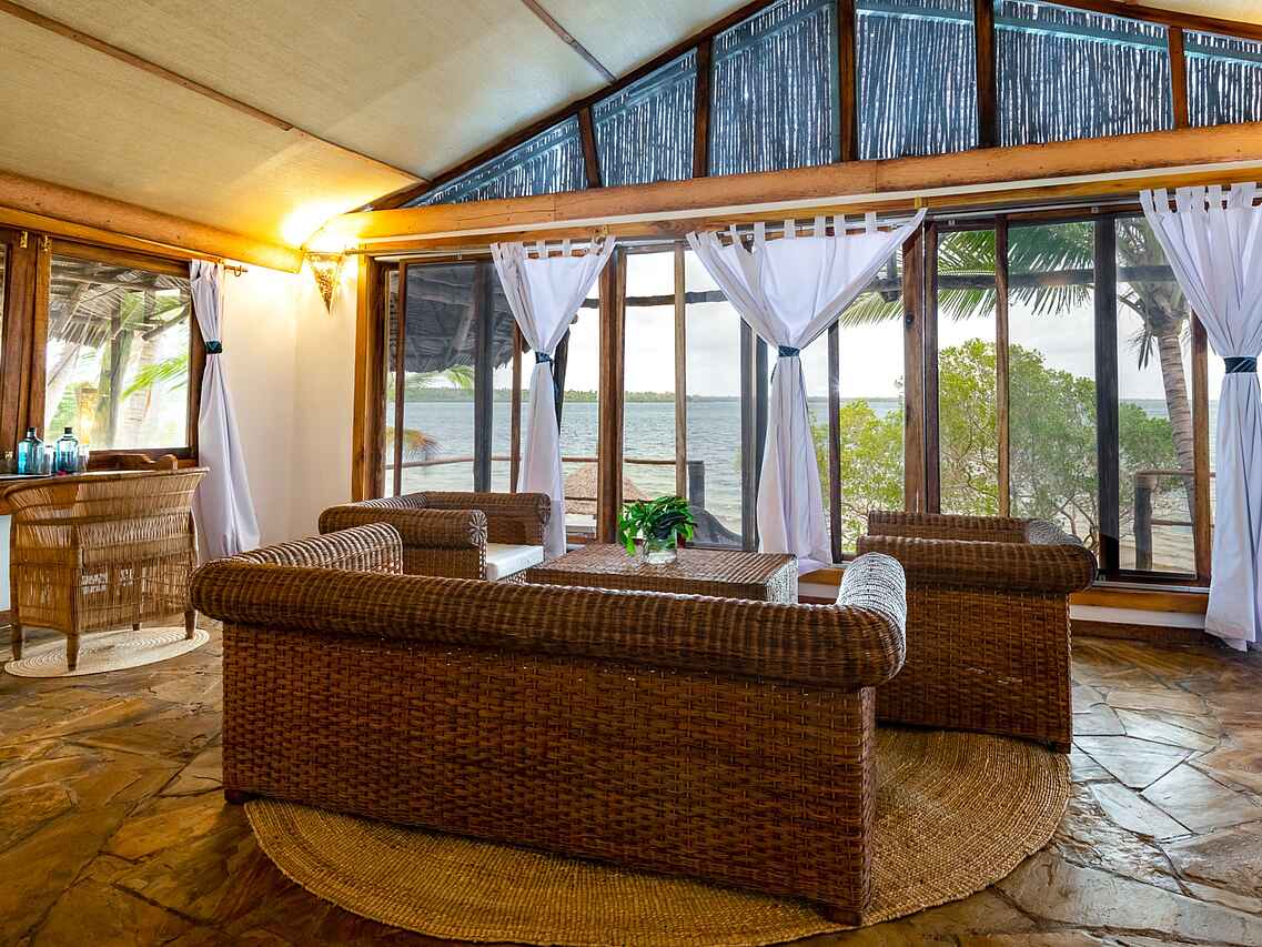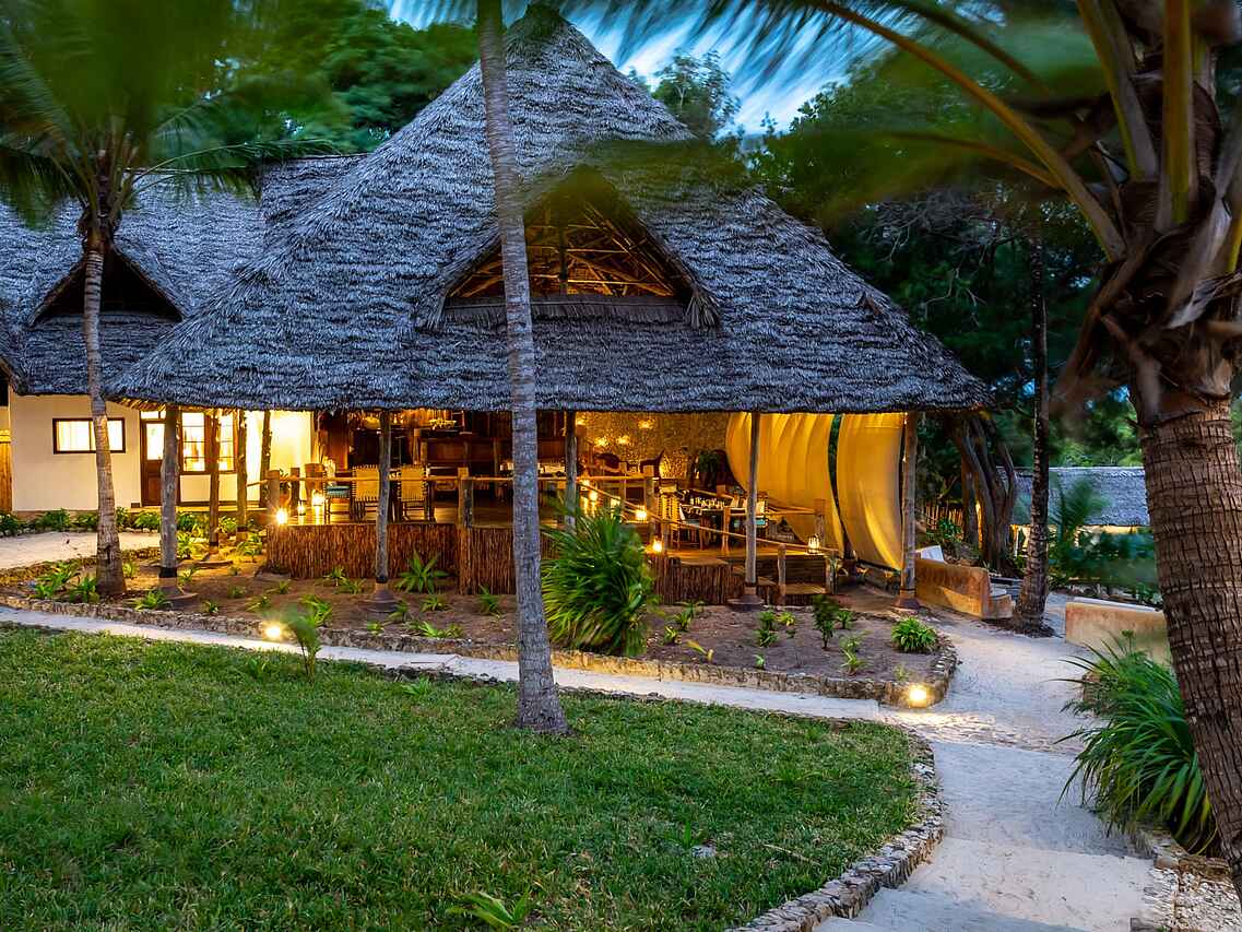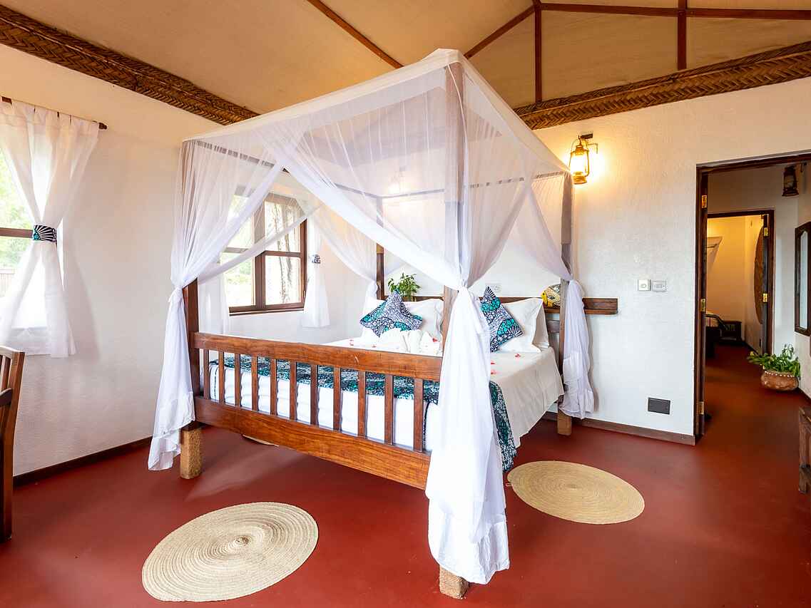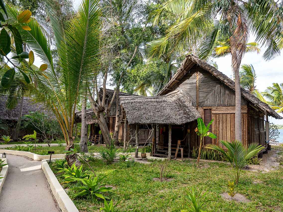 Die neun luxuriösen Bungalow-Suiten sind zwischen Kokospalmen gelegen und bieten einen wunderbaren Blick auf die Bucht. Sie sind geschmackvoll eingerichtet und verbinden traditionellen Swahili-Stil mit modernem Komfort. Jeder Bungalow verfügt über ein großes Doppelbett, wobei auch zwei Einzelbetten möglich sind, jeweils mit Moskitonetz versehen. Dank der kühlen Meeresbrise herrscht stets ein angenehmes Klima, zusätzlich sorgen Deckenventilatoren für Kühlung.