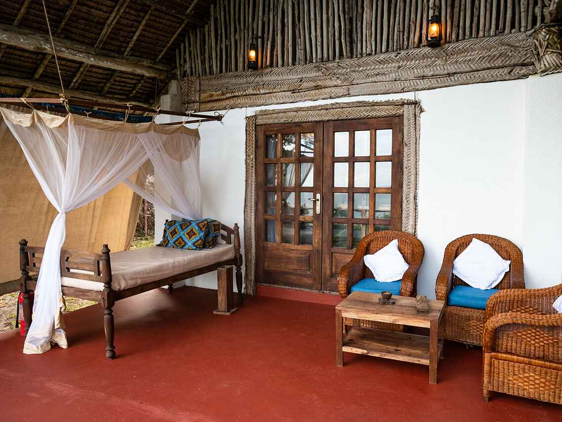 Alle Bungalows sind mit einer Minibar sowie Kaffee- und Teezubereitungsmöglichkeiten ausgestattet. Die En-suite-Badezimmer bieten hochwertige Ausstattungen wie WC, Doppelwaschbecken und eine geräumige Dusche. Vor jedem Bungalow befindet sich eine eigene Veranda, die mit einem Zanzibari-Tagesbett, Stühlen und einem Couchtisch möbliert ist, ideal zum Entspannen und Genießen der Aussicht.