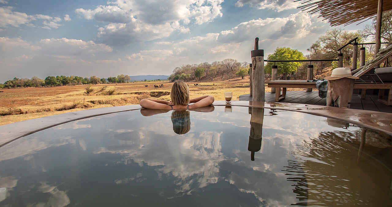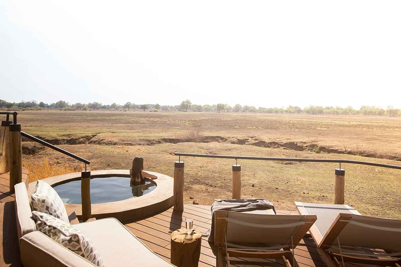 Das Puku Ridge Camp wurde auf einer Anhöhe errichtet, die einen hervorragenden Blick über die umliegende grüne Ebene ermöglicht. Diese lockt viele Pflanzenfresser, wie Elefanten und Antilopen und deren Jäger, also Löwen und Leoparden an. Durch eine Flutlichtbeleuchtung können die beiden Wasserlöcher sogar nachts von der eigenen Terrasse aus beobachtet werden.