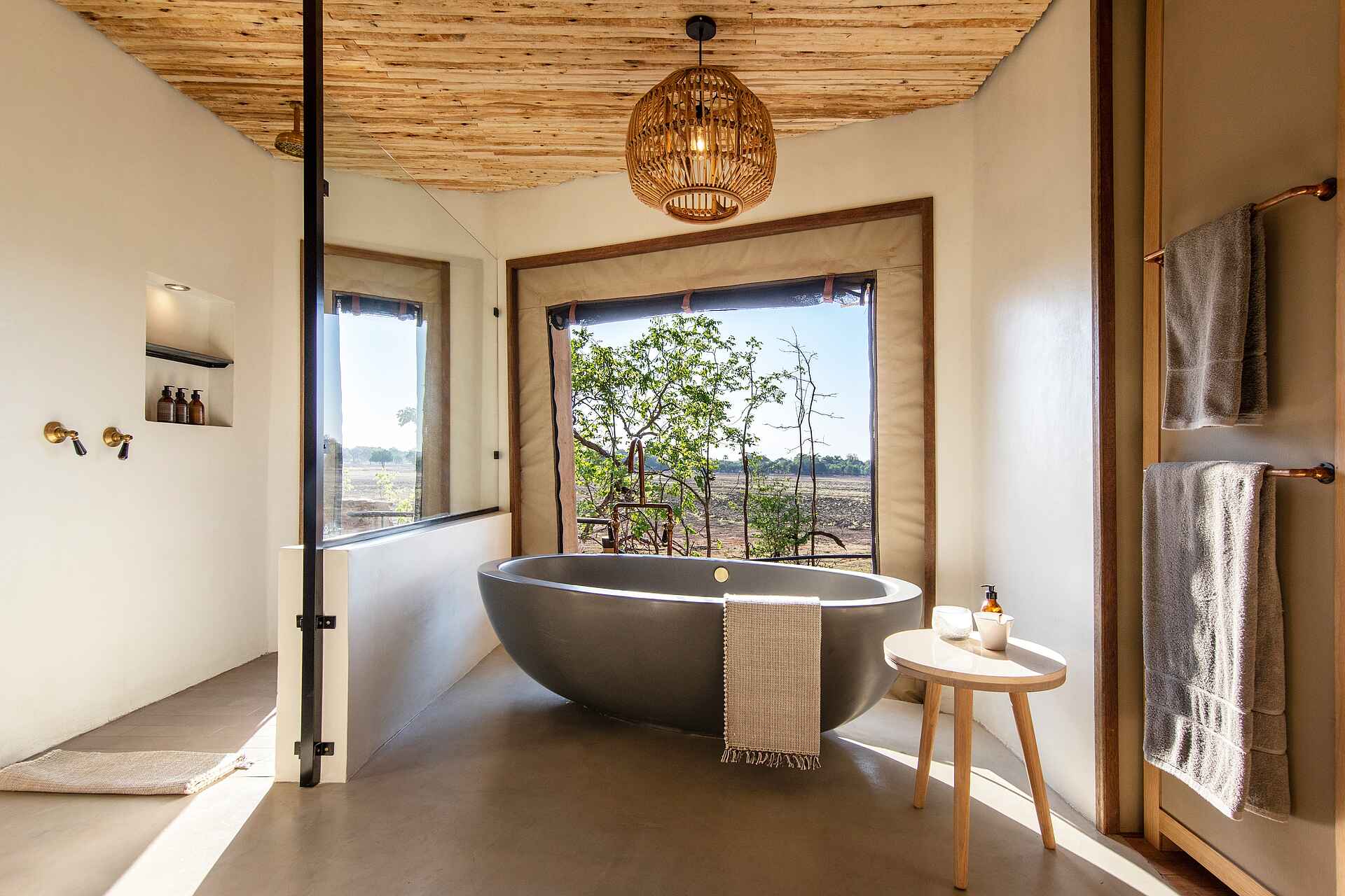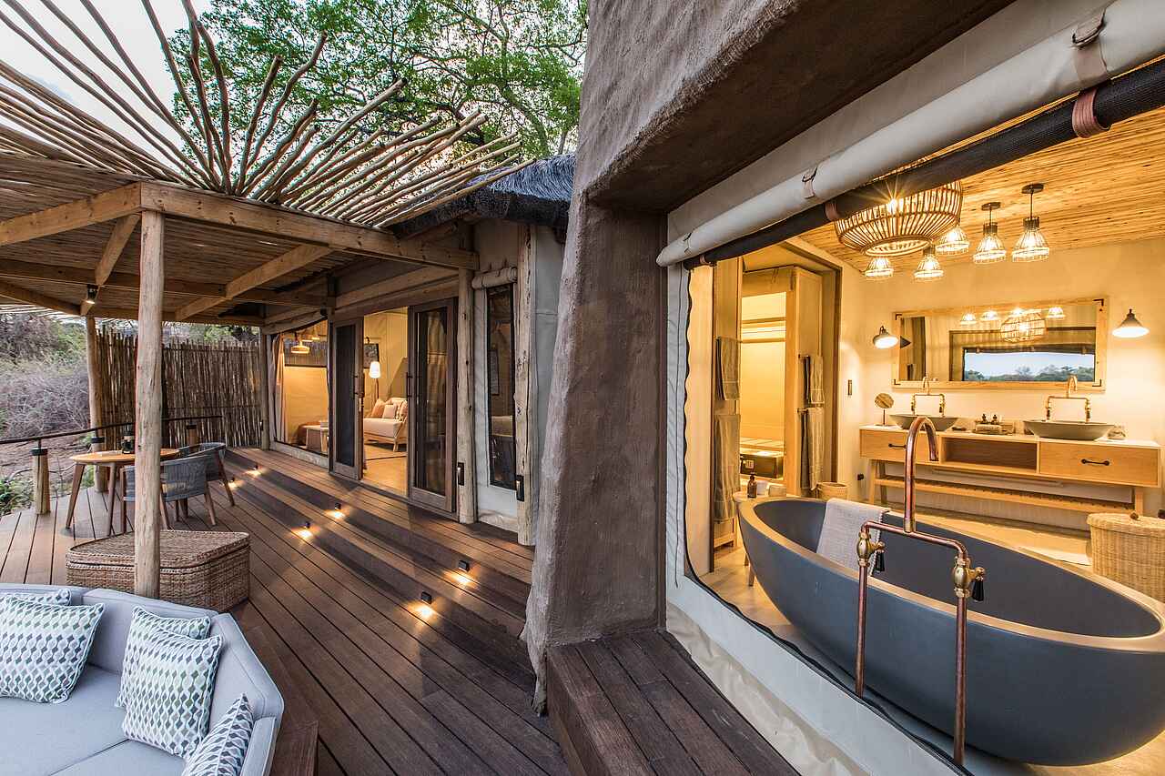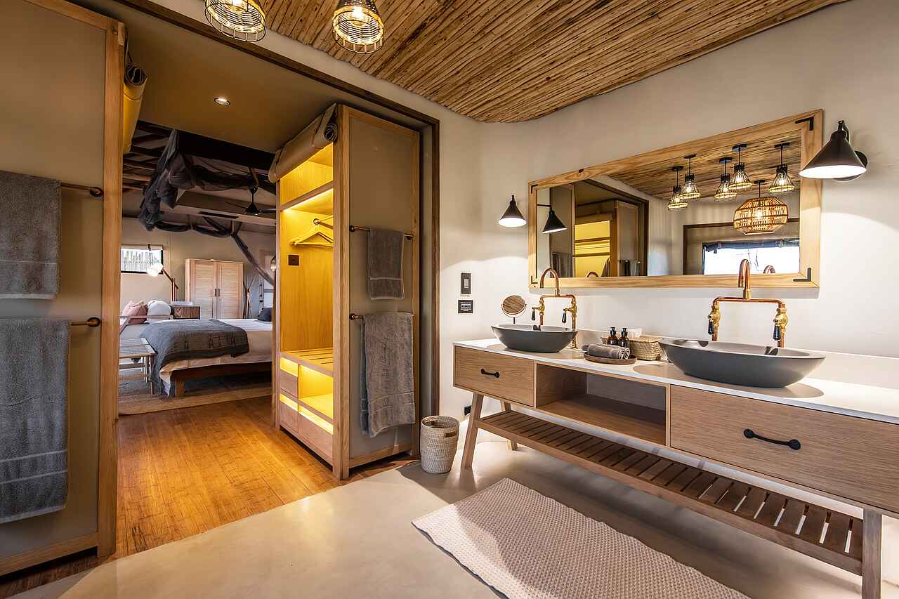 Alle Zelte sind großzügig und komfortabel eingerichtet und besitzen ein eigenes Bad mit zwei Waschbecken, einer Spültoilette und einer Dusche. Die Außendusche bietet die Möglichkeit schon während der Körperpflege die Tiere am Wasserloch zu beobachten. Die Zimmer selbst sind sehr großzügig eingerichtet. Das riesige Bett besteht aus zwei zusammengeschobenen Doppelbetten und wird von einem Moskitonetz beschützt. Auch die Fenster haben Netze, um die Gäste vor Insekten zu schützen. Ein Deckenventilator sorgt für angenehme Temperaturen.