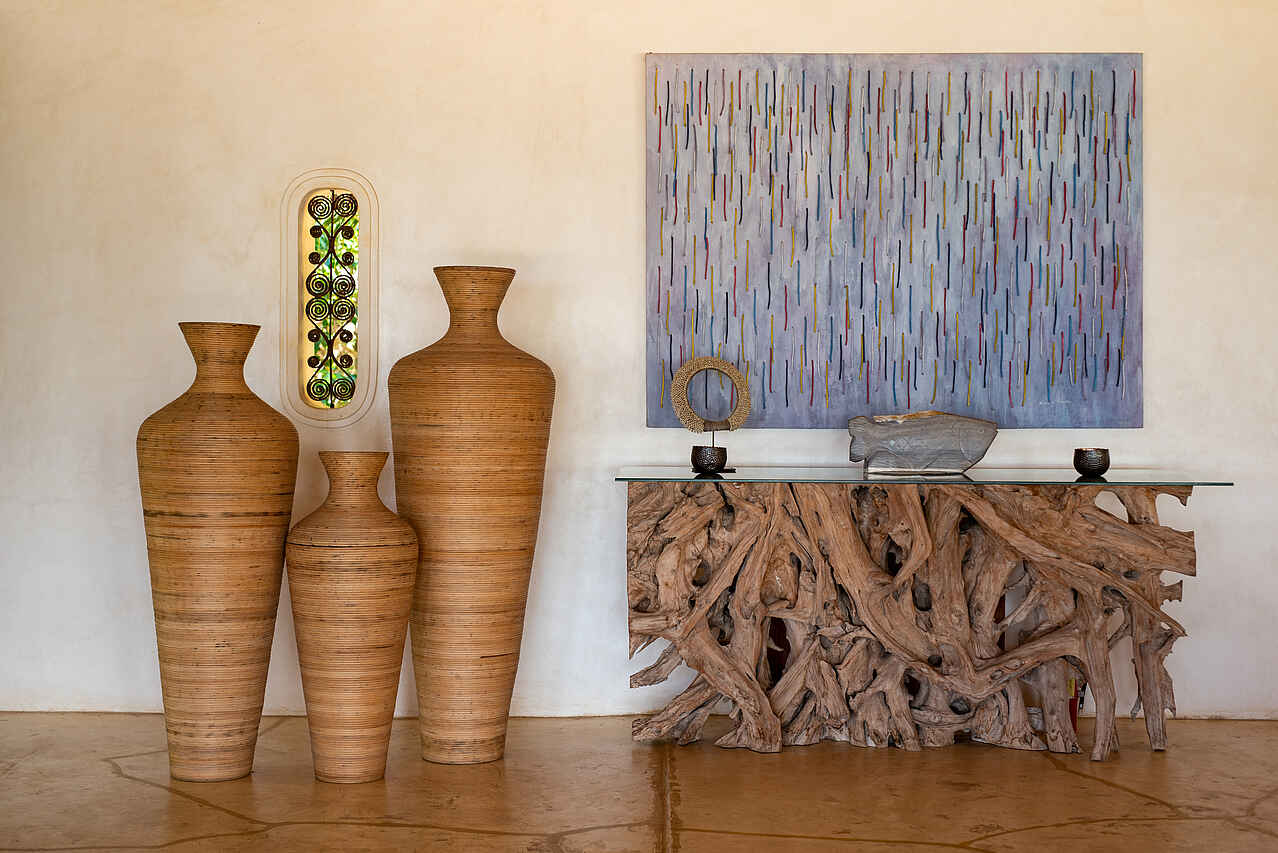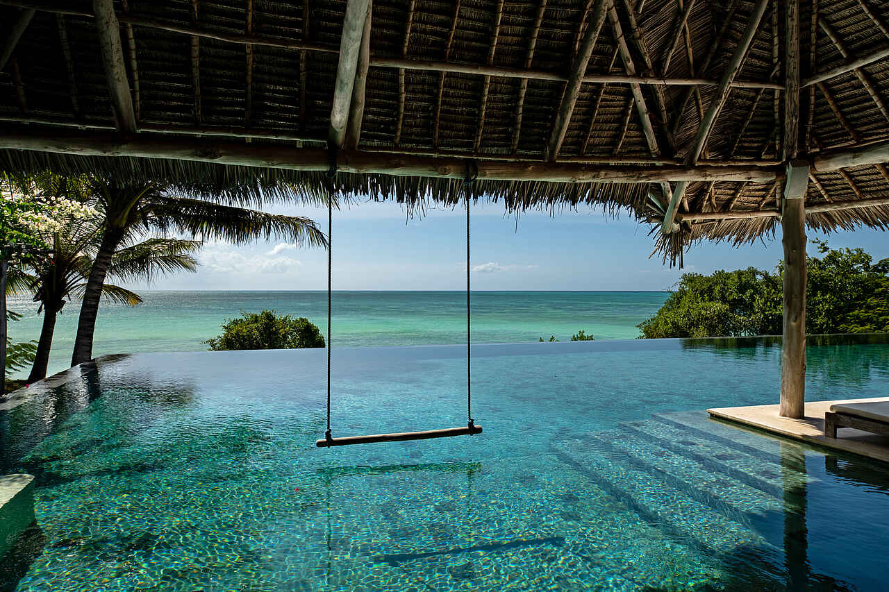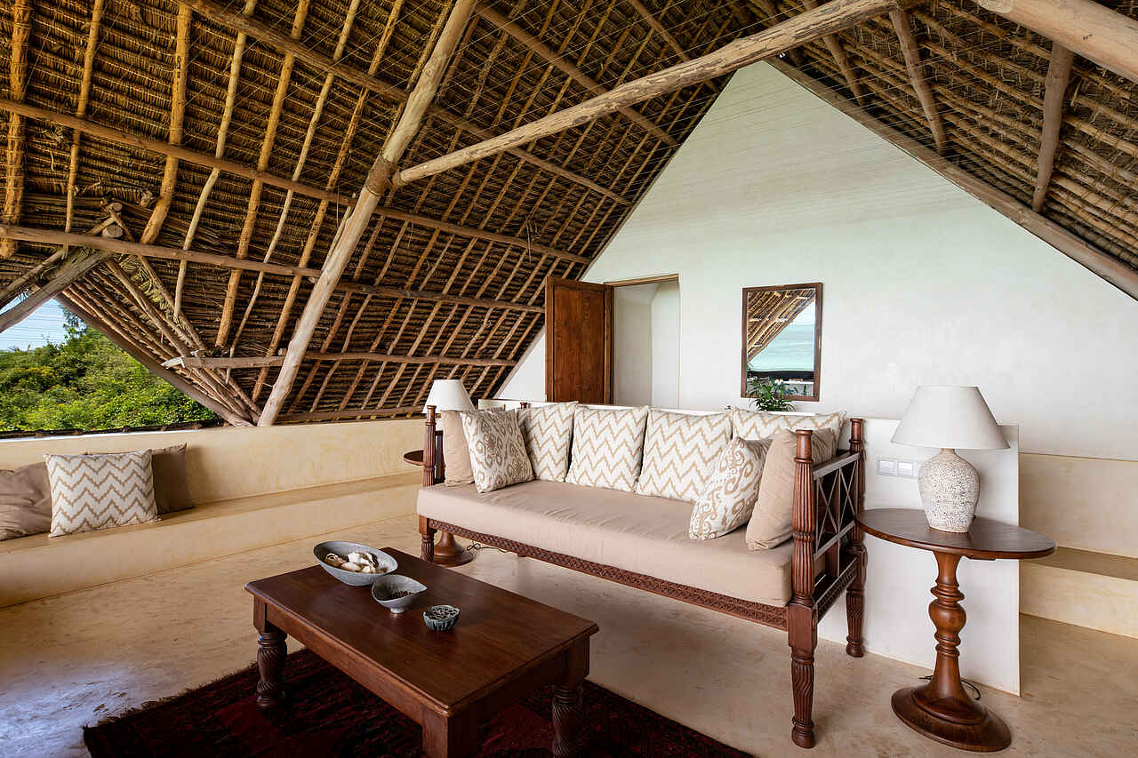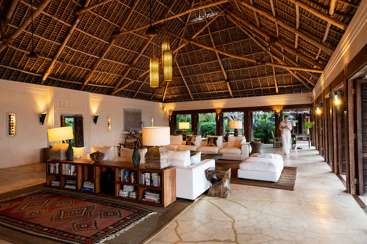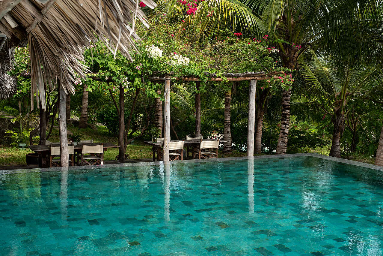Die Gemeinschaftsbereiche des Qambani Luxury Resort sind harmonisch in den tropischen Garten eingebettet. Herzstück ist ein großzügiger Loungebereich mit offener Architektur, bequemen Sofas und stilvoller Dekoration. Von hier bietet sich ein weiter Blick auf das Meer. Zwei Swimmingpools laden zum Entspannen ein - ein Infinity-Pool direkt an der Klippe mit atemberaubendem Panoramablick sowie ein Salzwasser-Pool. Ein gut ausgestatteter Fitnessraum, ein TV- und Medienraum sowie ein Massagepavillon bieten Rückzugsorte und Abwechslung. Die offene Bar ist zentraler Treffpunkt für den Sundowner. Die gesamte Anlage ist von liebevoll gepflegten Gärten umgeben und sorgt für ein Gefühl von Privatsphäre inmitten einer tropischen Oase.