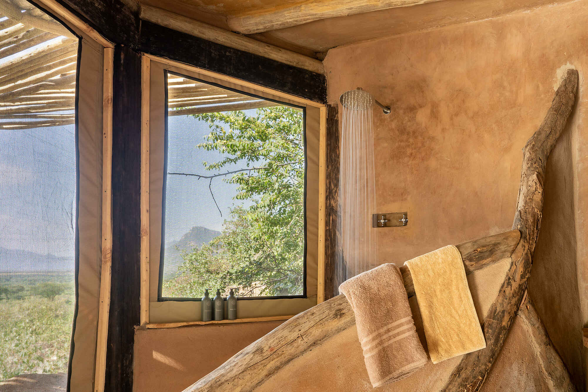 Die vier freistehenden Suiten im Reteti House bieten ein hohes Maß an Privatsphäre und sind jeweils mit einer eigenen Terrasse ausgestattet, die einen weiten Blick in die umliegende Landschaft freigibt. Im Inneren schaffen große Betten mit Moskitonetzen, stilvoll ausgewählte Möbel, komfortable Sitzgelegenheiten und durchdachter Stauraum eine warme, einladende Atmosphäre. Die En-suite-Badezimmer sind hochwertig ausgestattet und bieten neben eleganten Armaturen auch Doppelwaschbecken, Spiegel, flauschige Handtücher und sorgfältig ausgewählte Pflegeprodukte. Jede Suite verfügt zudem über eine großzügige, solarbeheizte Außendusche. Die Familiensuite verfügt über zwei separate Schlafzimmer und einen gemeinsamen Wohnbereich, der viel Platz und Rückzugsmöglichkeiten für Familien mit Kindern oder gemeinsam reisende Freunde schafft.
