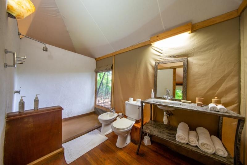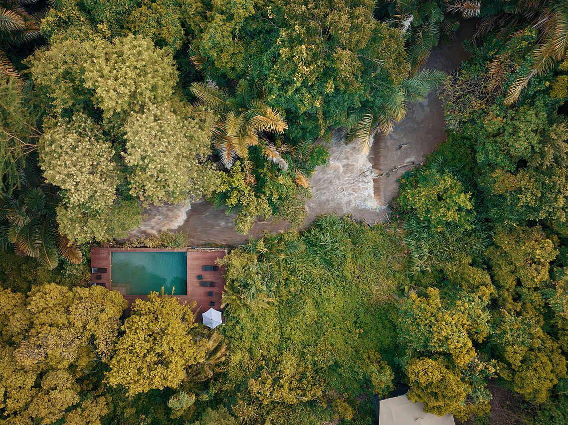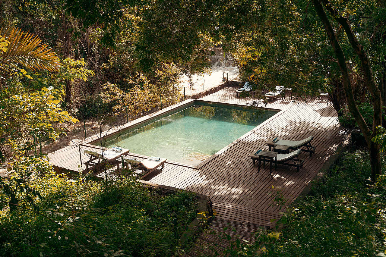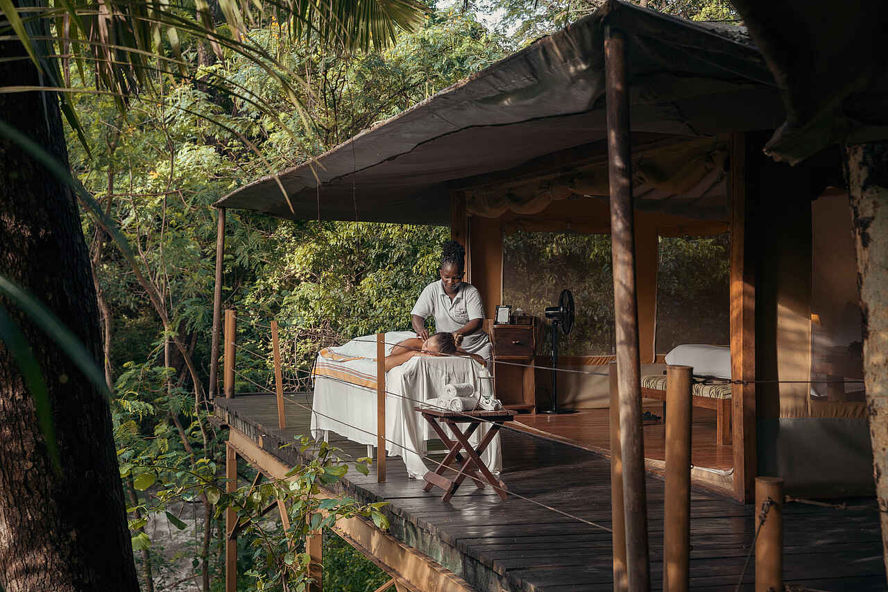 Der zentrale Bereich des Camps ist offen gestaltet und liegt erhöht über dem Flussufer, wodurch sich weite Blicke auf das umliegende Waldgebiet eröffnen. Die stilvolle Architektur setzt auf eine gelungene Kombination aus Naturmaterialien und zeitgemäßem Design. Bequeme Sitzgelegenheiten laden zum Verweilen ein, während im angrenzenden Speisepavillon unter einem luftigen Makutidach die Mahlzeiten serviert werden. An heißen Tagen bietet der Swimmingpool mit Holzdeck angenehme Erfrischung und Ausblick auf die dichte Vegetation. Ein kleiner Shop mit ausgewählten, handgefertigten Produkten aus der Region ergänzt das Angebot.
