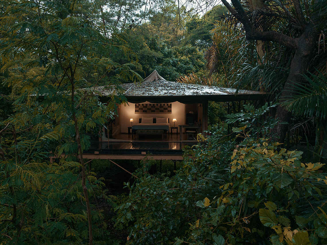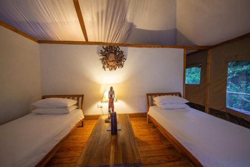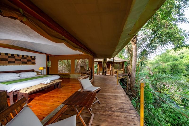 Die sieben Suiten sind großzügig dimensioniert und auf Holzplattformen errichtet. Große Fensterfronten und private Holzveranden eröffnen Ausblicke auf den Fluss oder den Wald. Die Einrichtung ist modern mit afrikanischen Akzenten und umfasst ein großes Bett, bequeme Sitzgelegenheiten, Schreibtisch, Ventilator sowie eine Kaffee- und Teestation. Die En-suite-Badezimmer verfügen über Dusche, WC, Waschbecken sowie Handtücher und Pflegeartikel. Die beiden Doppelchalets bestehen aus je zwei miteinander verbundenen Einheiten, die sich ideal für Familien oder befreundete Paare eignen.