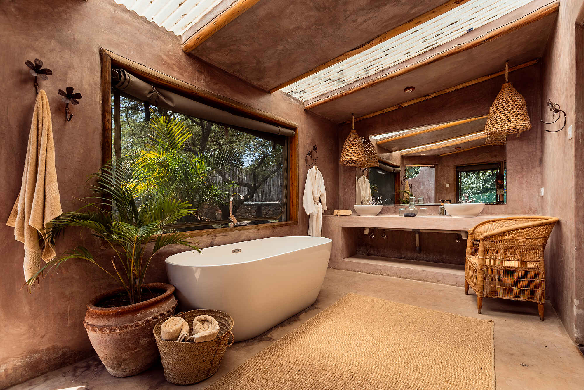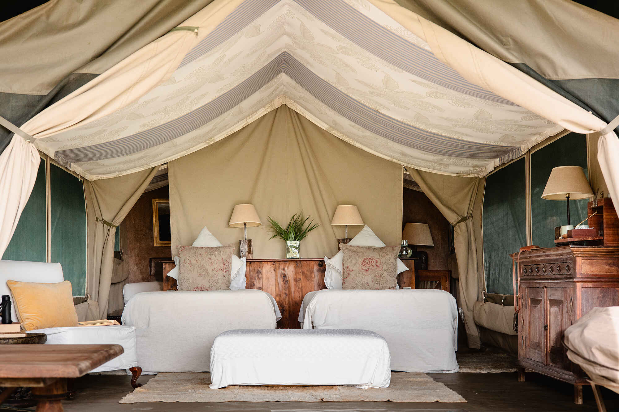 Die Zelte stehen in weiten Abständen voneinander auf leicht erhöhten Holzdecks, die mit Zeltplane bezogen und gewebten Teppichen belegt sind. Die riesigen Canvas-Zelte mit hohen, weiß-betuchten Decken bestechen durch die schlicht-elegante Einrichtung in hellen Stoffen, Gitternetze garantieren beste Aussichten in die Wildnis. Im Schlafbereich thront ein breites Doppelbett, Divan und Sessel bilden den Loungebereich vor dem eine private Terrasse mit Director‘s Chairs liegt. Hinter dem Schlafbereich folgt ein Ankleidezimmer mit Hängeschrankelementen, daran anschließend ein großzügiges Badezimmer mit Toilette, Waschtisch mit Keramikbecken und einer begehbaren Außendusche mit fließend Warmwasser, die mit einem stabilen Sichtschutz umgeben ist. Das Familienzimmer besteht aus zwei kompletten Zelten, je mit Ensuite Badezimmer, wie oben, die durch ein Wohnzimmer mit Sesseln, Couches und Tisch nahtlos verbunden sind.