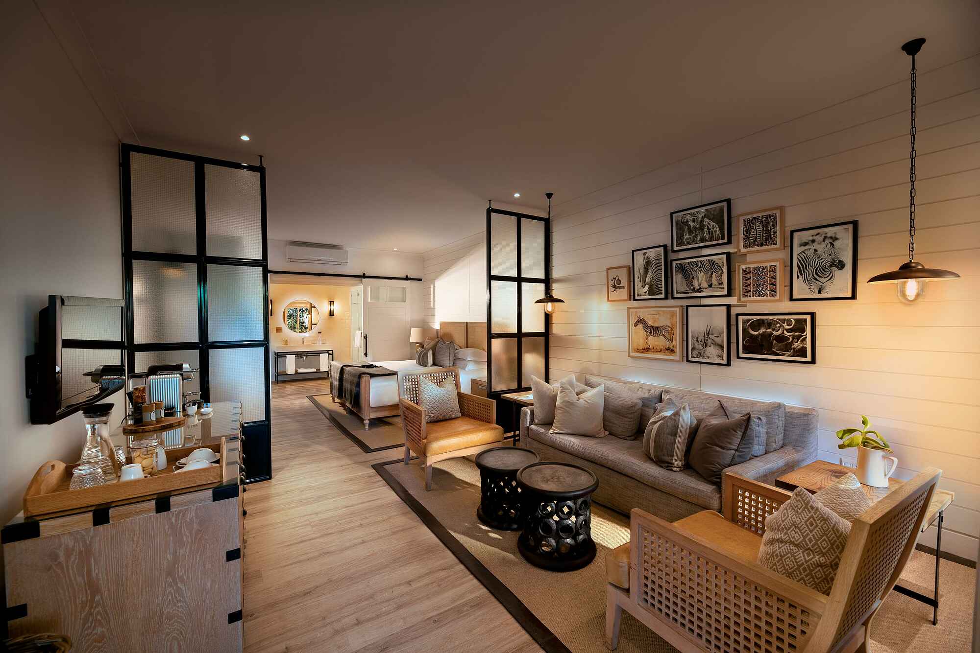 Jede Suite öffnet sich über eine private Terrasse in den gepflegten Garten oder direkt zur Buschlandschaft. Die Bäder sind komfortabel mit Dusche, Badewanne, Doppelwaschbecken, WC, flauschigen Handtüchern, Haartrockner und ausgewählten Pflegeprodukten ausgestattet. Dezente Naturtöne, warme Holzelemente und afrikanisch inspirierte Kunst verleihen den Räumen einen stilvollen Charakter.