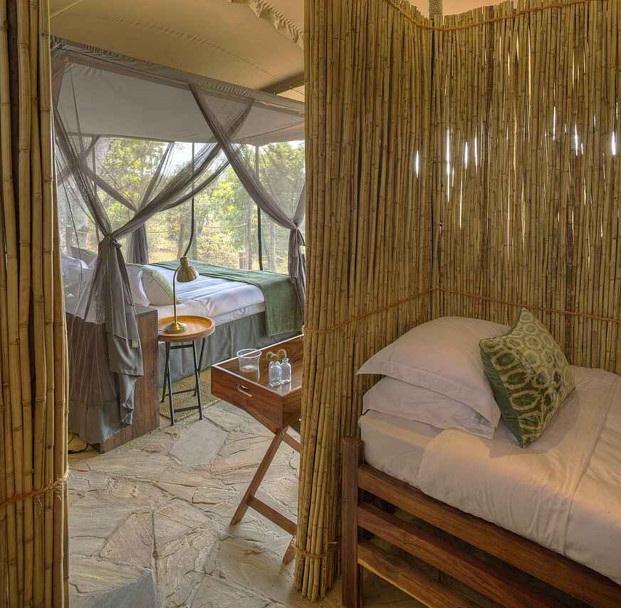 Die acht Zeltsuiten des Roho ya Selous Camp sind großzügig gestaltet und bieten große Doppelbetten oder zwei Einzelbetten mit Moskitonetz, bequeme Sitzmöglichkeiten und ausreichend Stauraum. Jede Suite verfügt über eine private Veranda, die den Blick in die Landschaft öffnet und Raum für ruhige Stunden schafft. Die En-suite-Badezimmer sind modern ausgestattet mit Dusche, Doppelwaschbecken, Spültoilette, Handtüchern, Pflegeprodukten und einem Haartrockner. Eine Außendusche ergänzt die Ausstattung und sorgt für ein zusätzliches Erlebnis. Trinkwasser sowie Kaffee und Tee stehen jederzeit bereit. Die Familiensuite verbindet zwei Schlafzimmer zu einer großzügigen Einheit und bietet zusätzlichen Wohnraum für Familien.