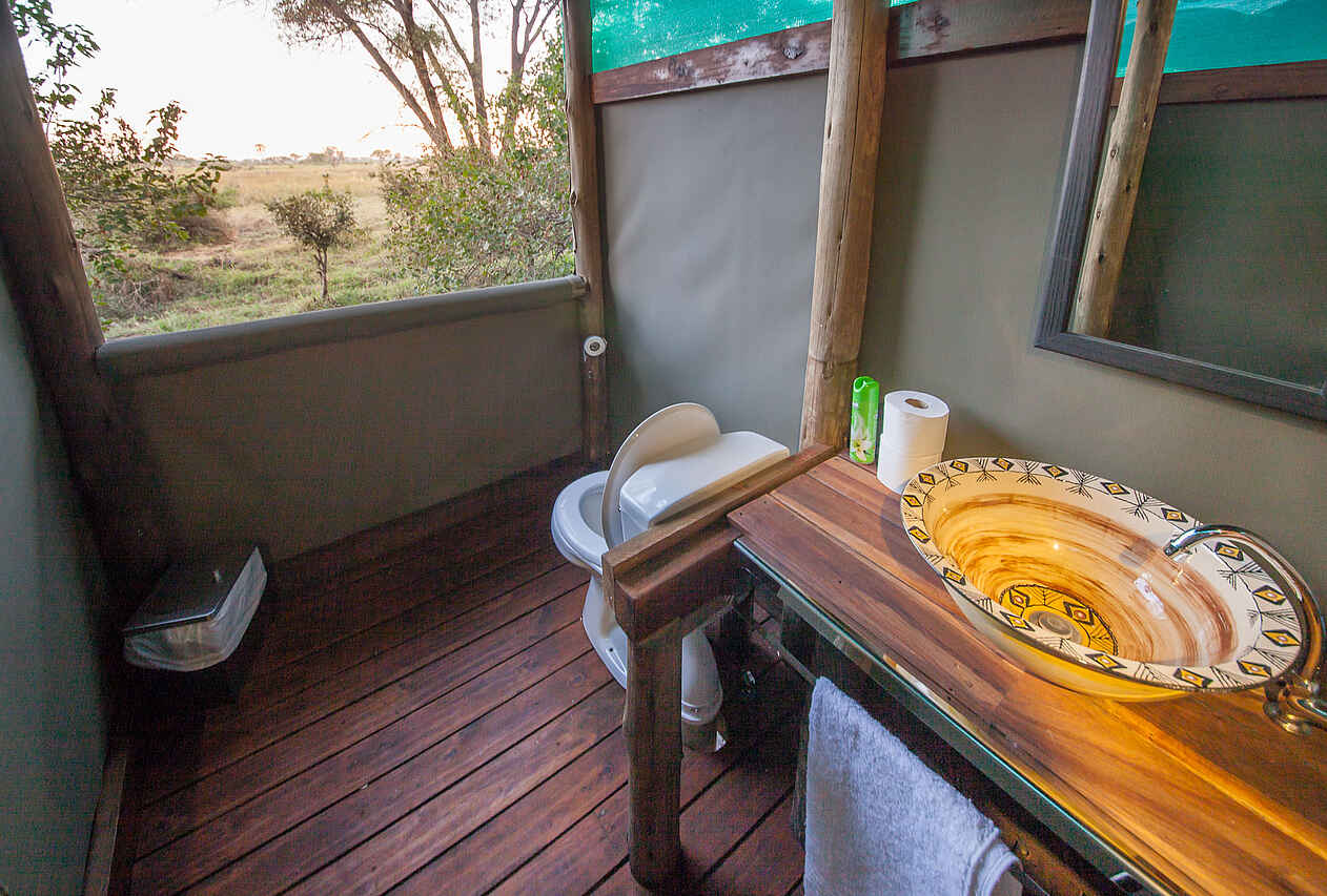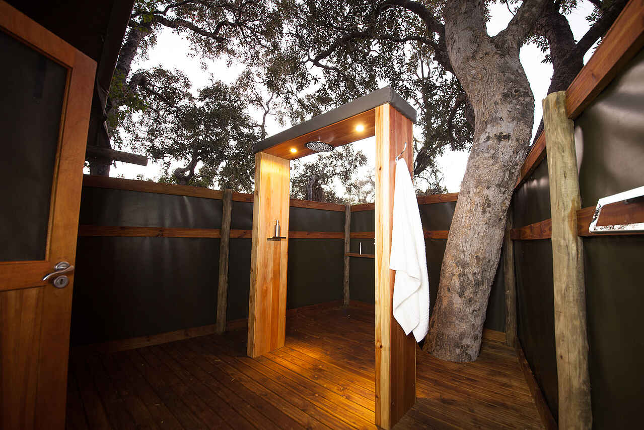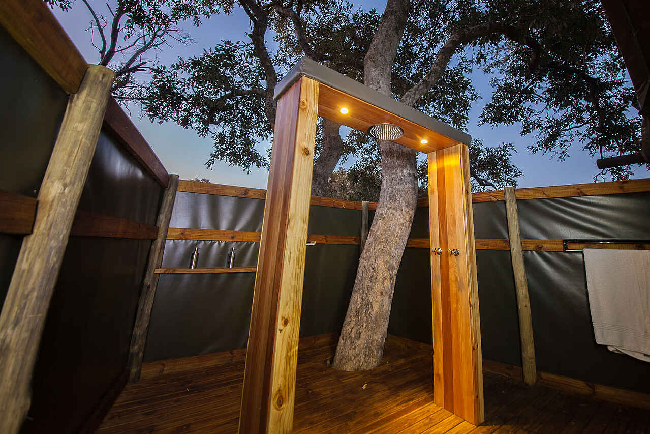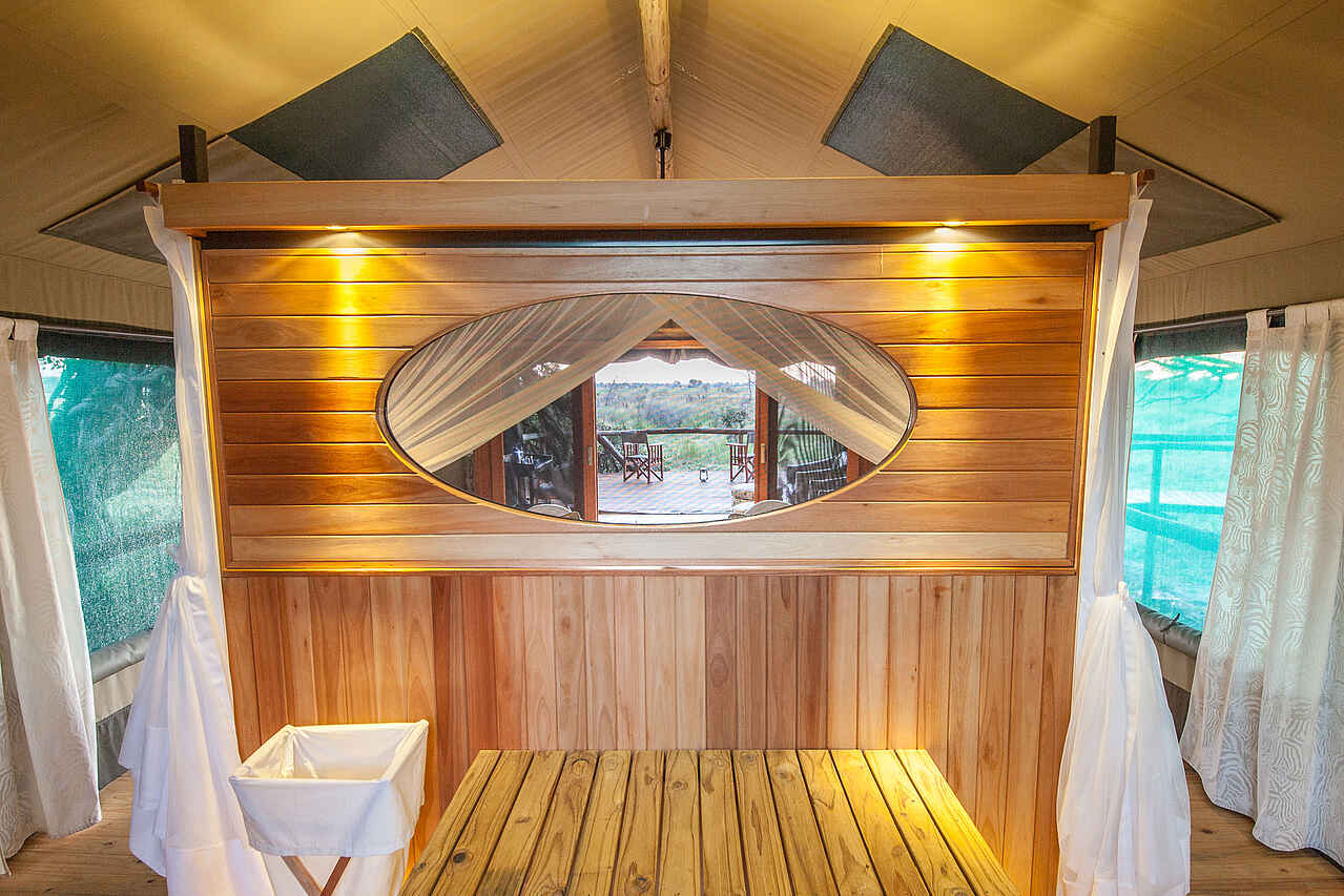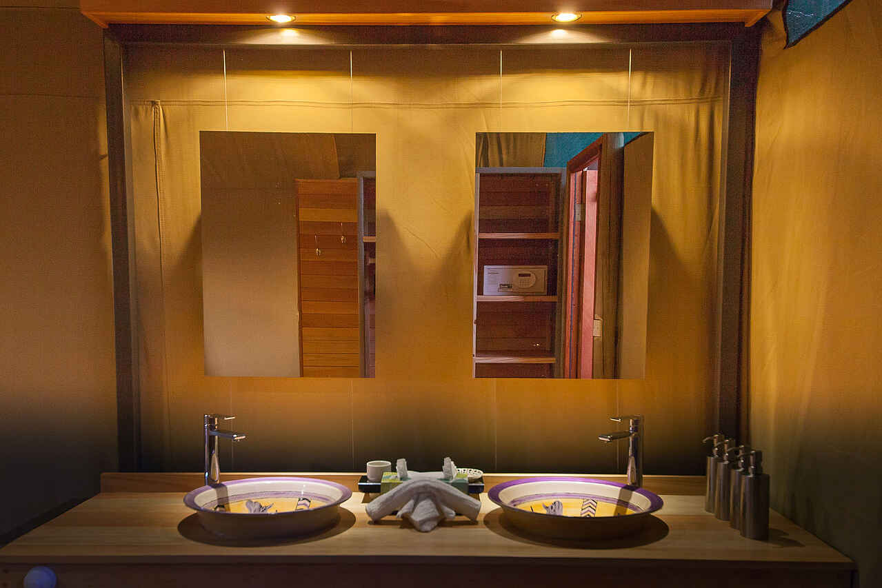 Im eigenen En-suite-Badezimmer befinden sich eine Spültoilette und zwei Waschbecken mit Spiegeln und eine begehbare Außendusche findet man im Freien. Das Familienzelt verfügt neben allen Merkmalen der anderen Zelte noch über ein zweites Schlafzimmer für Kinder.