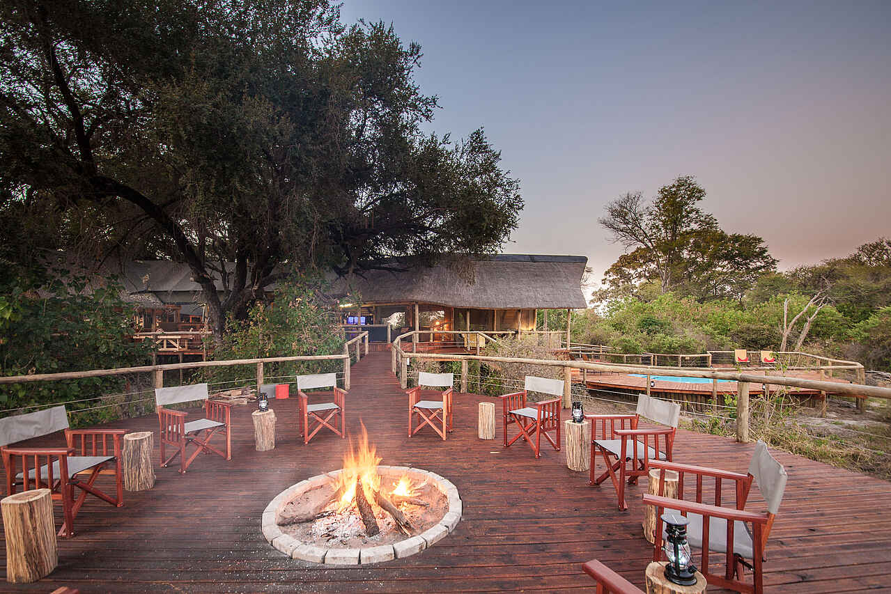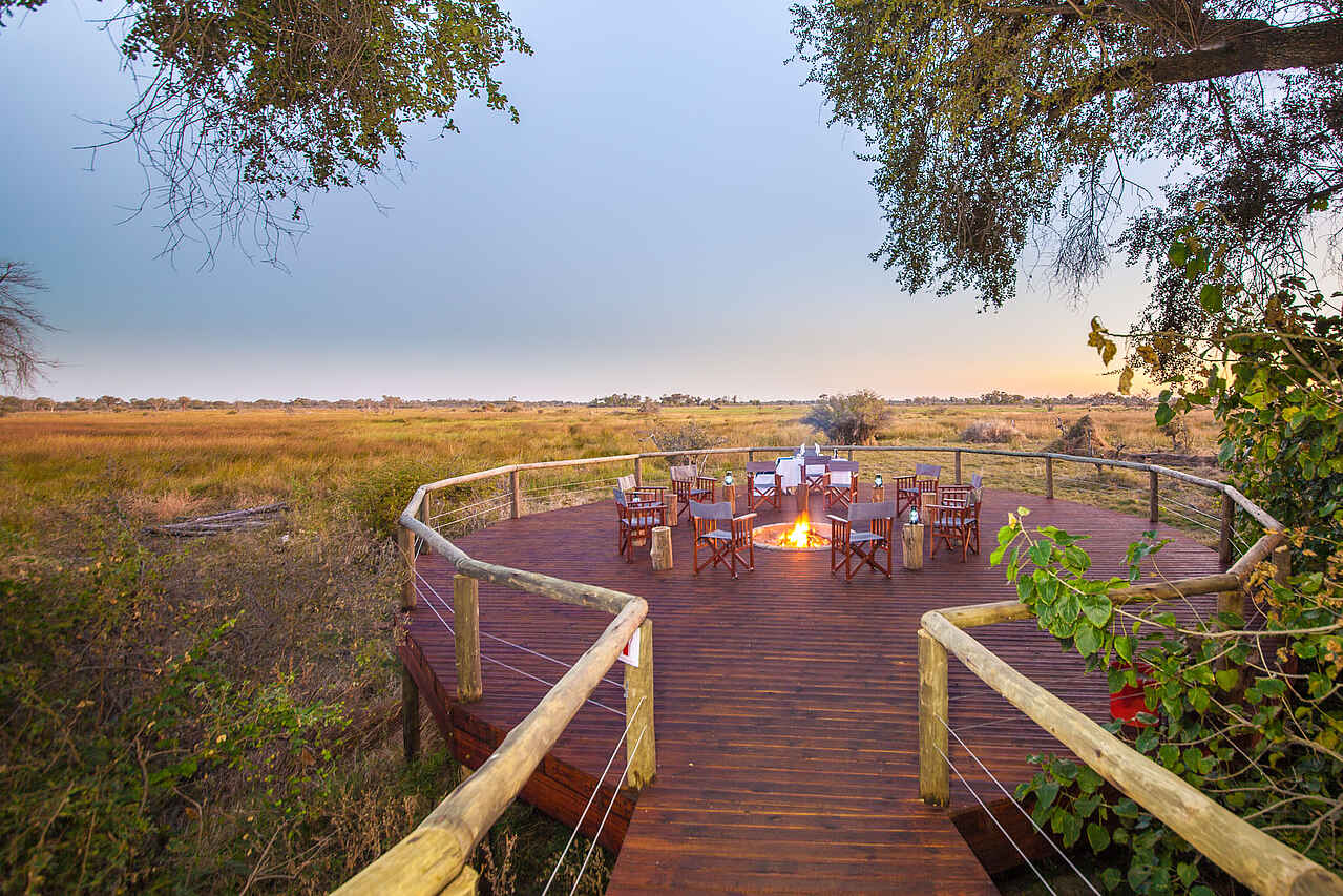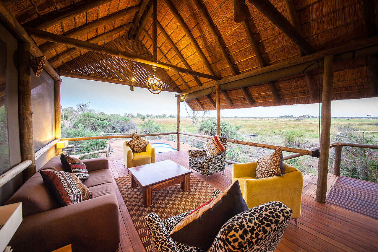 Der gemeinschaftliche Bereich bei Rra Dinare ist größtenteils in einem offenen Holzgebäude mit einem Strohdach untergebracht. Die Hauptlounge ist mit bequemen Sitzmöglichkeiten und Kaffeetischen ausgestattet und öffnet sich zu einer überdachten Terrasse, von der aus man einen beeindruckenden Blick auf die Überschwemmungsebenen des Gomoti-Flusses genießt.