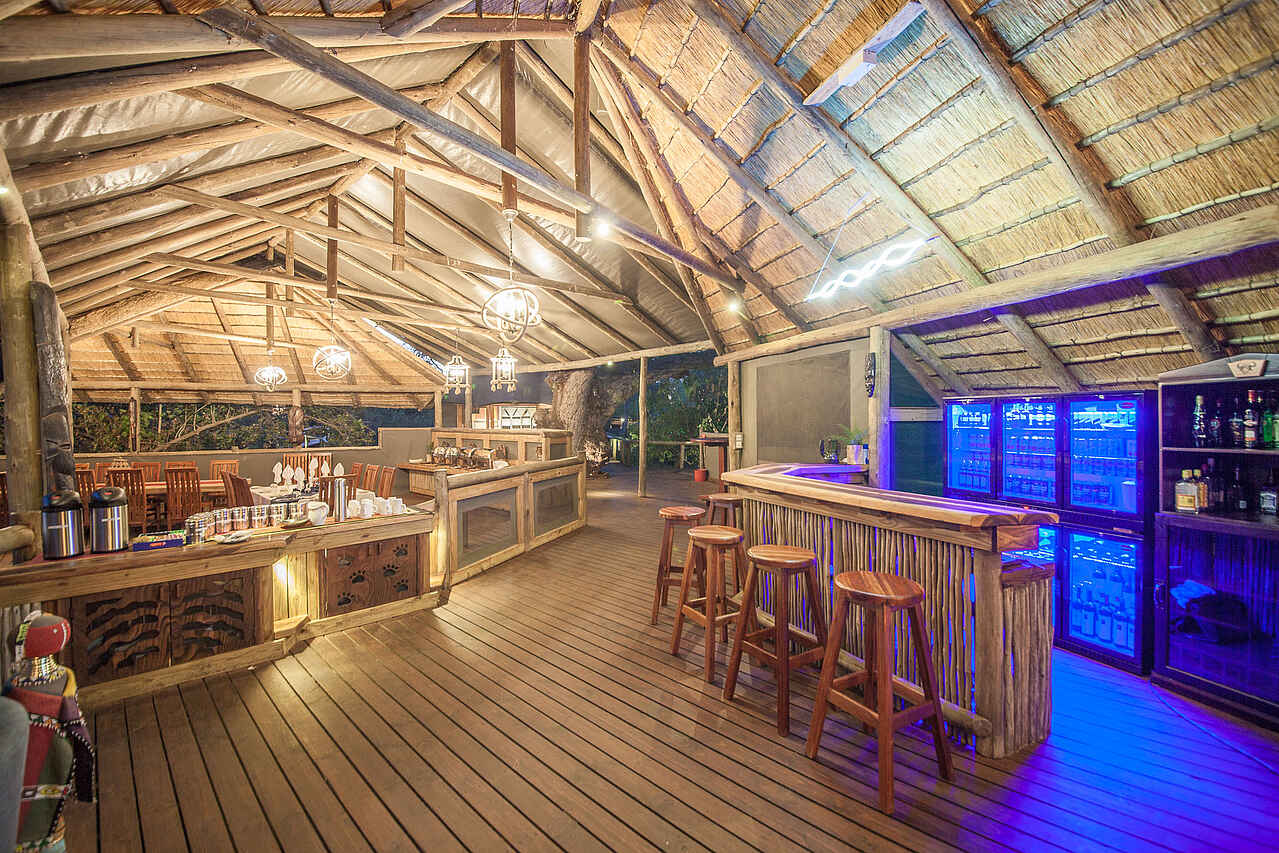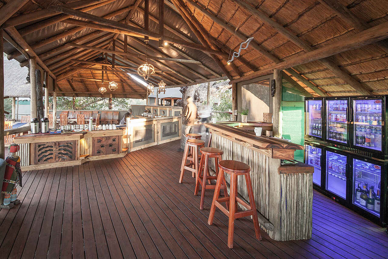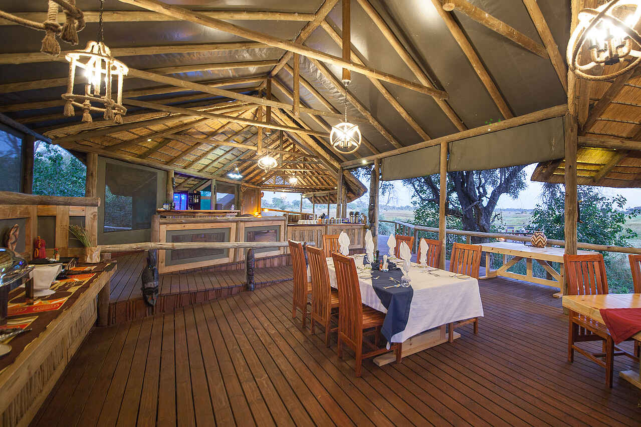 Die Bar des Camps befindet sich direkt neben der Lounge und bietet eine umfangreiche Auswahl sowohl an alkoholischen als auch an alkoholfreien Getränken an. Im Speisesaal findet man elegante Holzstühle an individuellen und gemeinsamen Tischen. Zudem gibt es einen Souvenirladen und eine großzügige Terrasse mit einem Swimmingpool samt weiterer Lounge. Direkt vor der Hauptlounge befindet sich die Boma (traditionelle Feuerstelle), ein perfekter Ort, um sich mit anderen Gästen zu entspannen und Safari-Erlebnisse zu teilen.