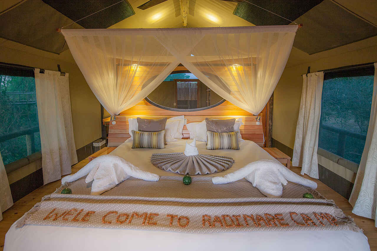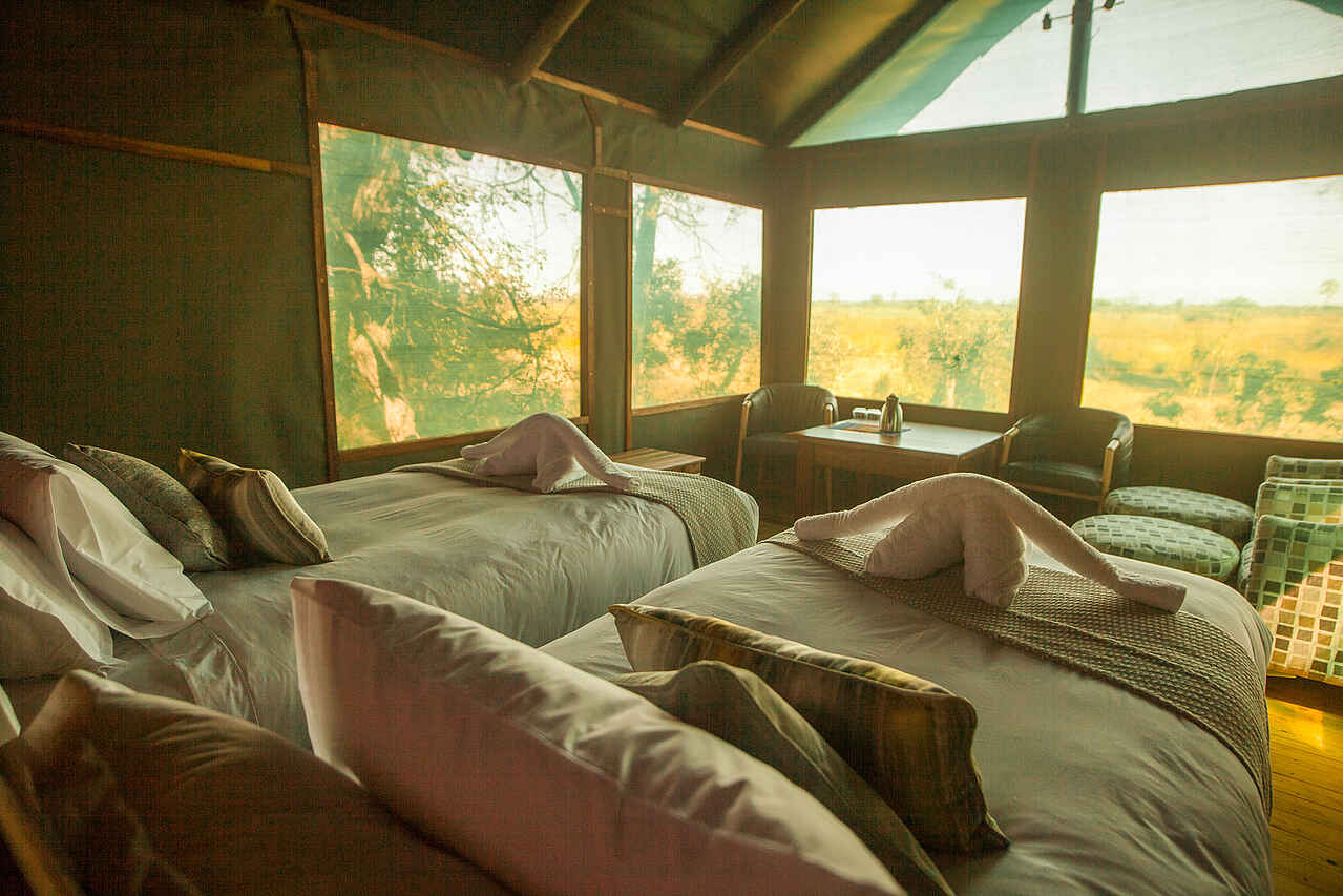 Die Gästeunterkünfte bestehen aus acht Zeltsuiten, darunter ein Familienzelt. Alle Zelte sind auf hölzernen Plattformen über dem Boden errichtet und über Holzstege mit den Gemeinschaftseinrichtungen von Rra Dinare verbunden. Im Schatten der Bäume gelegen, verfügt jedes Zelt über eine private Veranda mit schöner Aussicht über die Überschwemmungsebenen. Man betritt zunächst einen kleinen Loungebereich mit Sesseln und Sitzhockern und durch Doppeltüren mit Holzrahmen gelangt man in das Schlafzimmer, welches ein Doppelbett oder zwei Einzelbetten mit Moskitonetzen, Nachttische mit Beleuchtung sowie zwei bequeme Stühle enthält.