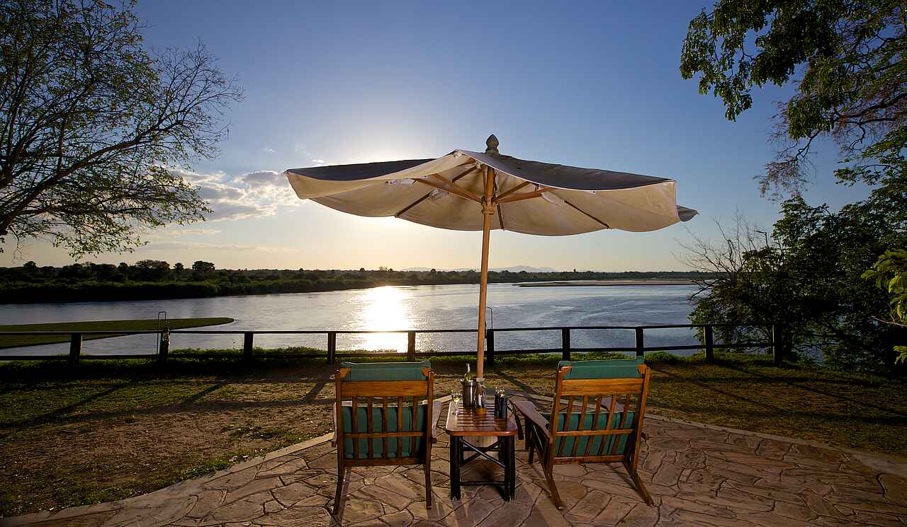 Der zentrale Bereich des Rufiji River Camp ist großzügig geschnitten und bietet eine direkte Aussicht auf den Rufiji River. Lounge, Bücherei, Bar und Essbereich befinden sich unter einem hohen, reetgedeckten Dach. Draußen gibt es eine Lagerfeuerstelle mit einigen Sitzgelegenheiten aus Holz. Ein beschatteter Pool-Bereich mit Liegestühlen ist etwas weiter vom Fluss entfernt ebenfalls vorhanden.