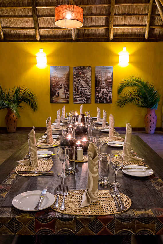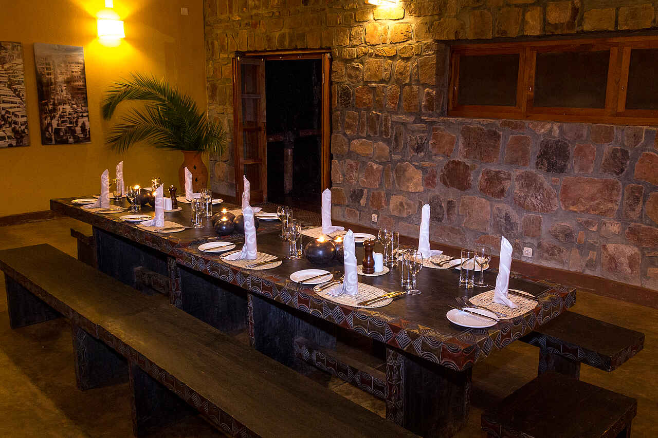Vollpension mit Frühstück, Mittag- und Abendessen. Getränke sind nicht inkludiert, ausgenommen sind Tee, Kaffee und die täglich in den Zimmern zur Verfügung gestellten Wasserflaschen. Je nach Wetter werden die Mahlzeiten im Speiseraum oder auf der Terrasse mit Seeblick serviert. Das Frühstücksangebot variiert täglich, frische lokale Früchte, selbst gebackene Brote, Muffins, frisch zubereitete Eier, frisch gepresste Säfte sowie Kaffee und Tee aus Ruanda gibt es immer. Speisekarte mit Gerichten zur Auswahl zur Mittagszeit. Für Ausflüge lassen sich Lunch-Pakete ordern. Zum Abendessen wird ein 3-Gänge-Menü serviert. Es gibt unter anderem Fleischgerichte, Salate, Pizza oder Potjiekos, sehr schmackhafte Eintöpfe. Dessert mit Kaffee und Tee.