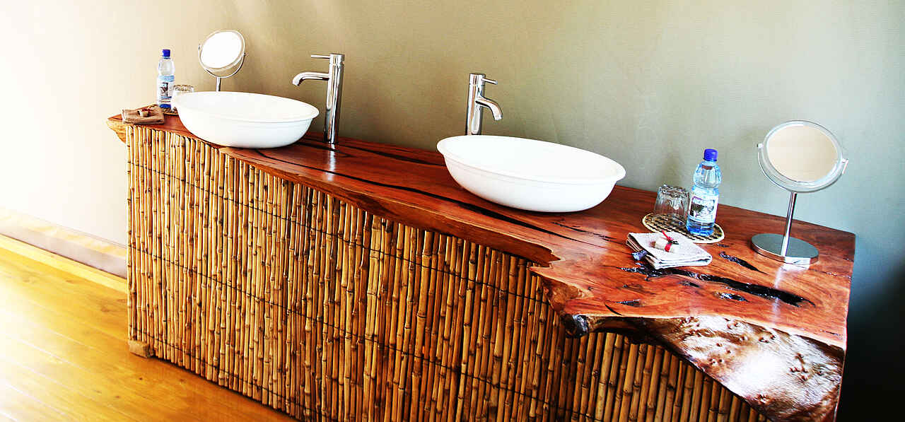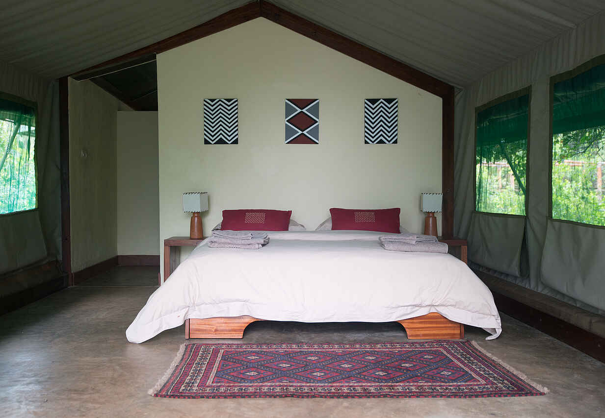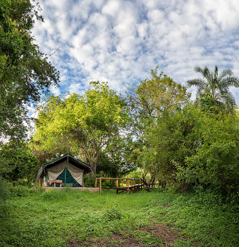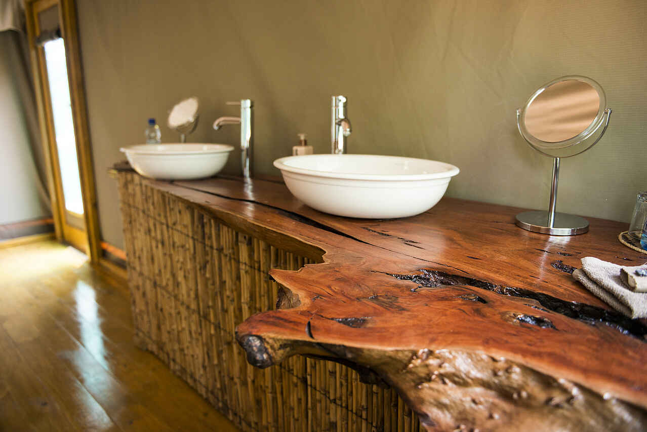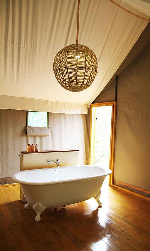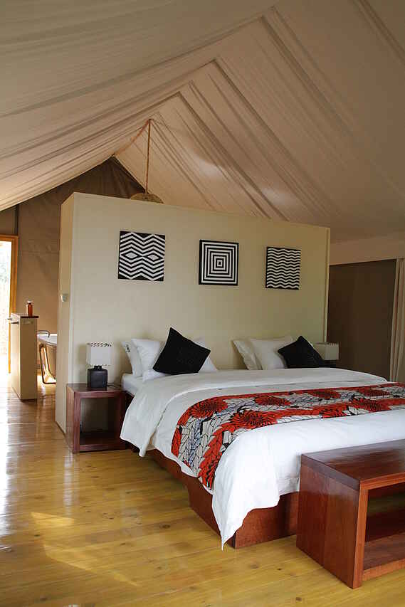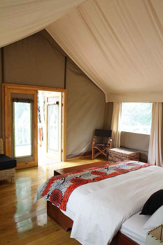 Geräumige Standard-Zelte mit festem Boden, Schlafbereich und Veranda. Ausstattung: Zwei Stühle, ein Queensize-Bett oder zwei übergroße Einzelbetten sowie Nachttische mit Nachttischlampen, Ankleidebereich. Im hinteren Teil befindet sich ein fest angebautes Bad mit Dusche, WC und fließendem heißen und kalten Wasser. Im Familienzelt befindet sich darüber hinaus ein zweiter Schlafbereich. Die großen "Fenster" an den Seitenwänden sind mit Moskitonetzen abgedeckt. Die "Vorderwand" lässt sich komplett zur Seite aufrollen und ist ebenfalls mit einem großen Moskitonetz ausgestattet. Das Baumhaus bietet deutlich mehr Platz. Das helle, moderne Zimmer mit Kingsize-Bett und Holzfußboden liegt auf einer erhöhten Plattform zwischen den Bäumen. Freistehende Badewanne im Badezimmer sowie fließendes kaltes und warmes Wasser, modernes WC, zwei Waschbecken. Große Außenterrasse mit Hängematte, Sitzgelegenheit und Außendusche.