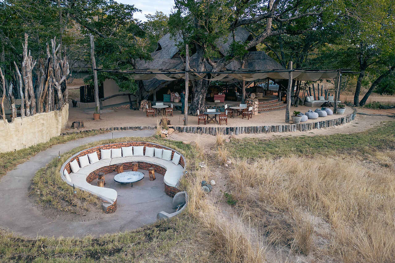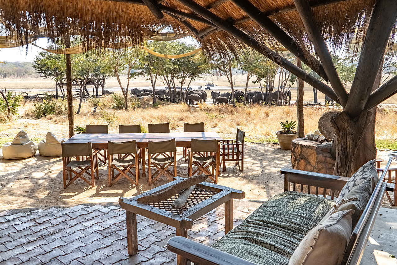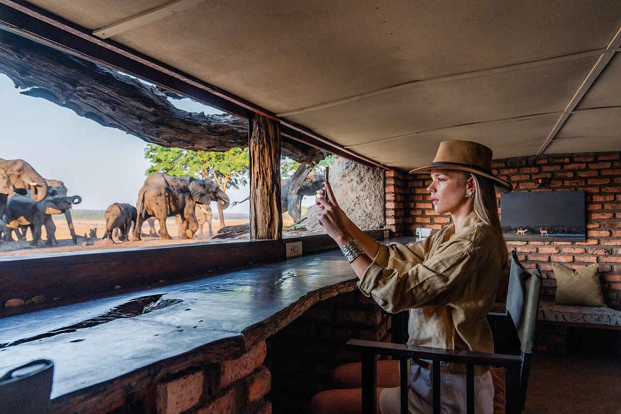Im Herzen der Sable Valley Lodge liegt das strohgedeckte Hauptgebäude mit Lounge, Bar und offenem Speisebereich, von dem sich ein weiter Blick über das Dete Vlei und das nahe Wasserloch eröffnet. Der luftige Stil bringt die Natur direkt ins Camp und schafft eine entspannte, gesellige Atmosphäre. Ein Pool unter schattigen Bäumen lädt zum Abkühlen zwischen den Pirschfahrten ein. Wenn die Sonne untergeht, treffen sich die Gäste an der Feuerstelle oder auf der Veranda, um den Tag mit Blick auf die Savanne ausklingen zu lassen. Ein besonderes Highlight ist das unterirdische Hide mit bequemen Sitzplätzen, Kamin, Minibar und Lademöglichkeiten für Kameras, wo Elefanten, Büffel und Antilopen aus nächster Nähe beobachtet werden können. Auch das Baumhaus-Deck bietet ideale Bedingungen für ruhige Tierbeobachtungen und spektakuläre Sonnenuntergänge.