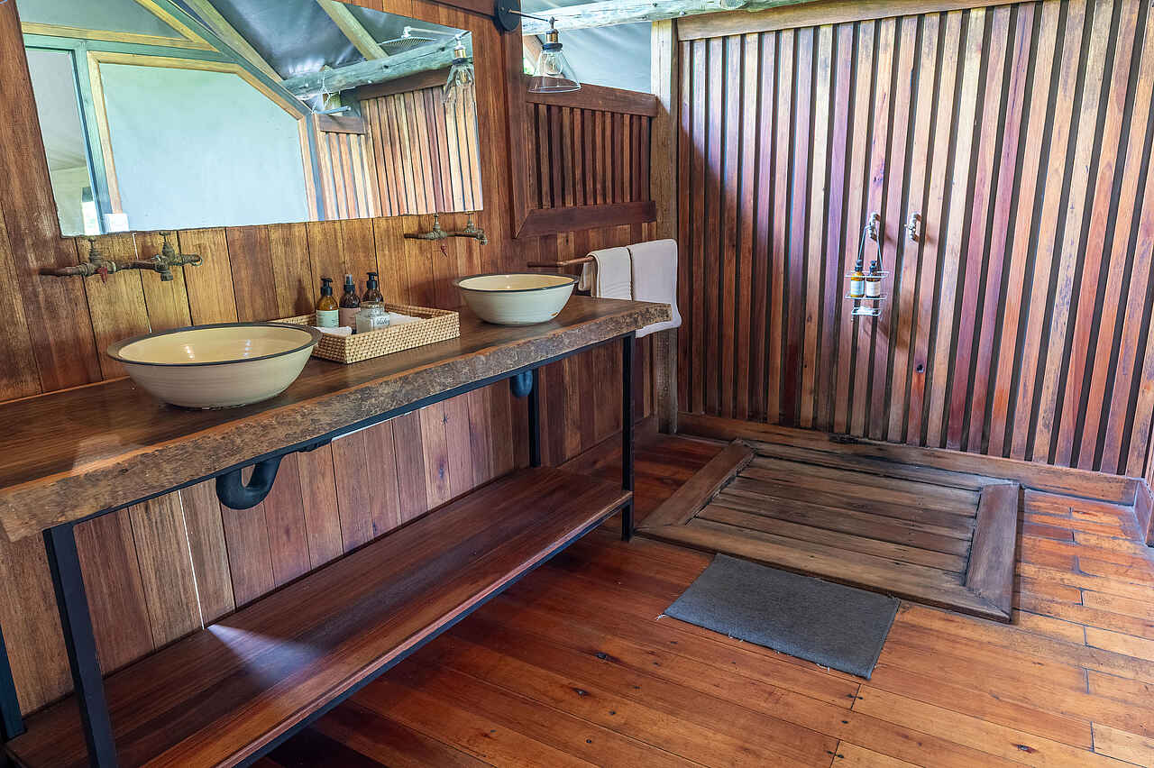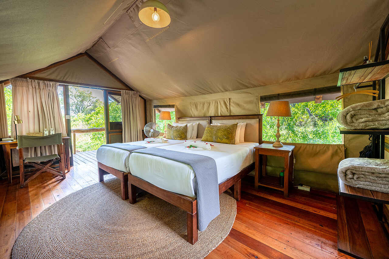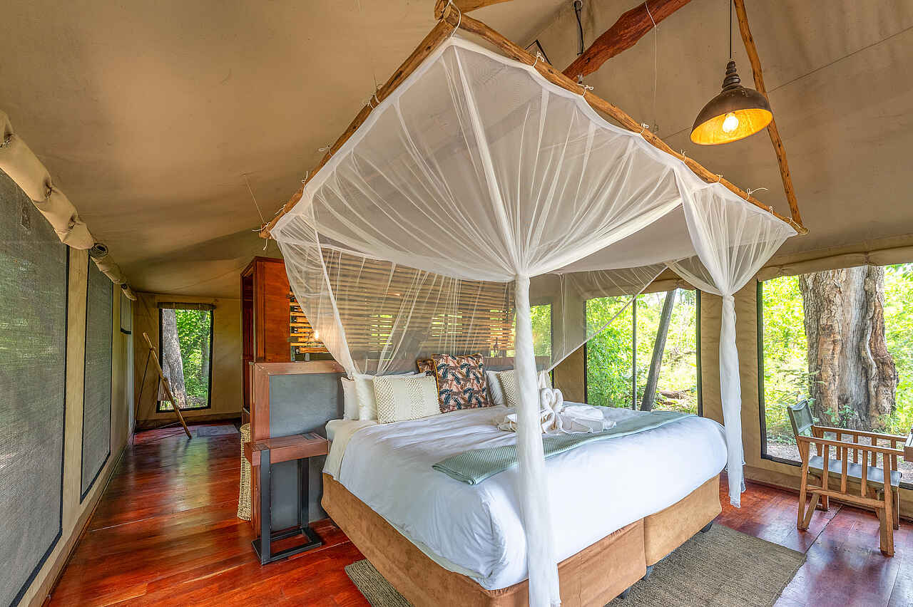 Die Saguni Safari Lodge verfügt über 22 großzügige Zeltsuiten, die sich in Forest Tents und Luxury Tents unterteilen. Alle Zelte sind in warmen, erdigen Farbtönen gestaltet und verfügen über eine private Terrasse mit Sitzgelegenheiten und Blick auf die Natur. Die Innenausstattung umfasst komfortable Kingsize-Betten oder zwei Einzelbetten, jeweils mit schützenden Moskitonetzen. Zur weiteren Ausstattung gehören eine Tee- und Kaffeestation, ein Safe, Mückenspray sowie kostenfreies WLAN. Die En-suite-Badezimmer sind modern eingerichtet, ausgestattet mit einer Toilette, einem Doppelwaschbecken und einer geräumigen Dusche. Die Luxury Tents, die sich direkt am Ufer des Sable River befinden, bieten zudem das besondere Extra einer Doppeldusche.