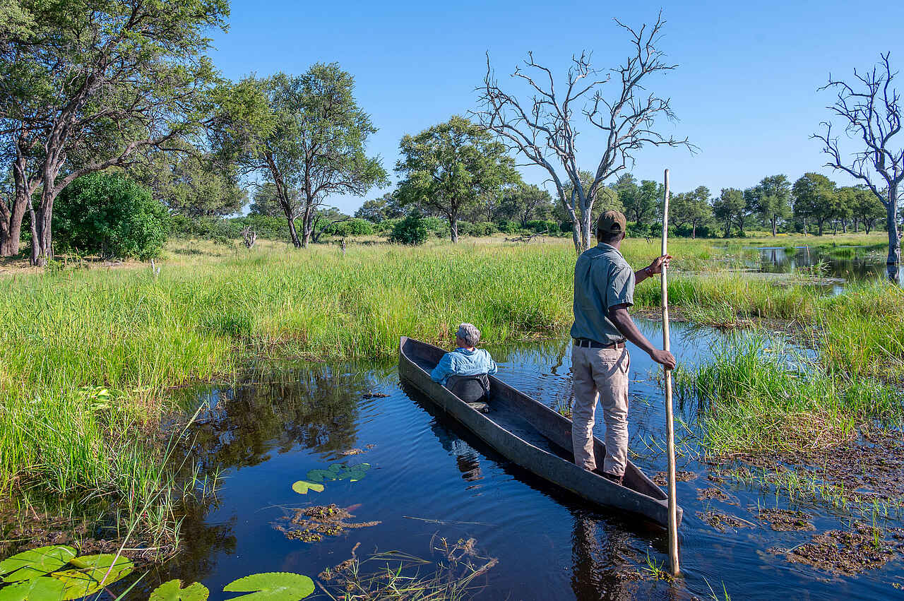 Ein besonderes Highlight sind die Mokoro-Ausflüge, bei denen Gäste lautlos in traditionellen Einbaum-Kanus durch die Wasserwege gleiten - ideal für die Beobachtung von Wasservögeln und anderen seltenen Spezies. Ergänzt wird das Angebot durch geführte Buschwanderungen und kulturelle Besuche in einem nahegelegenen Dorf.