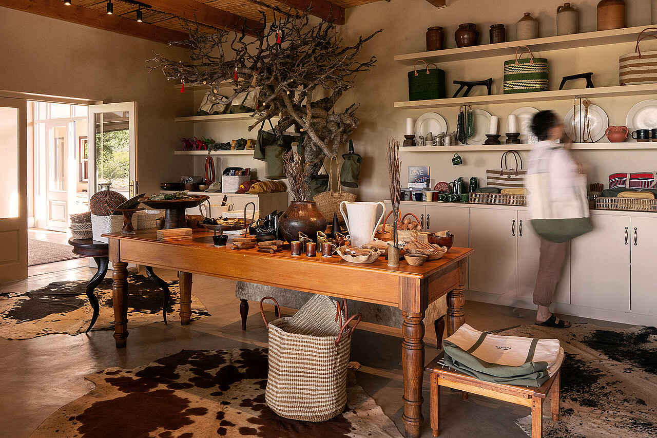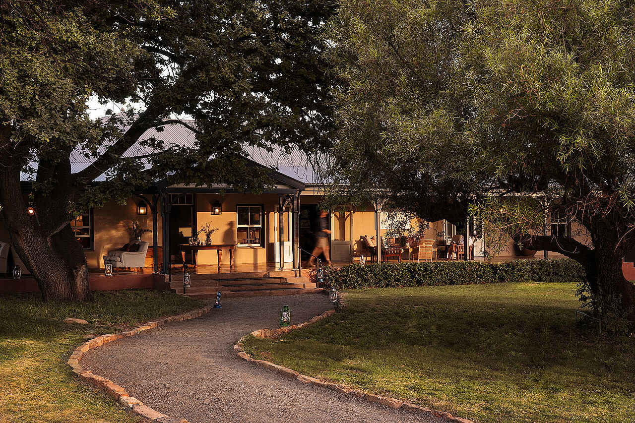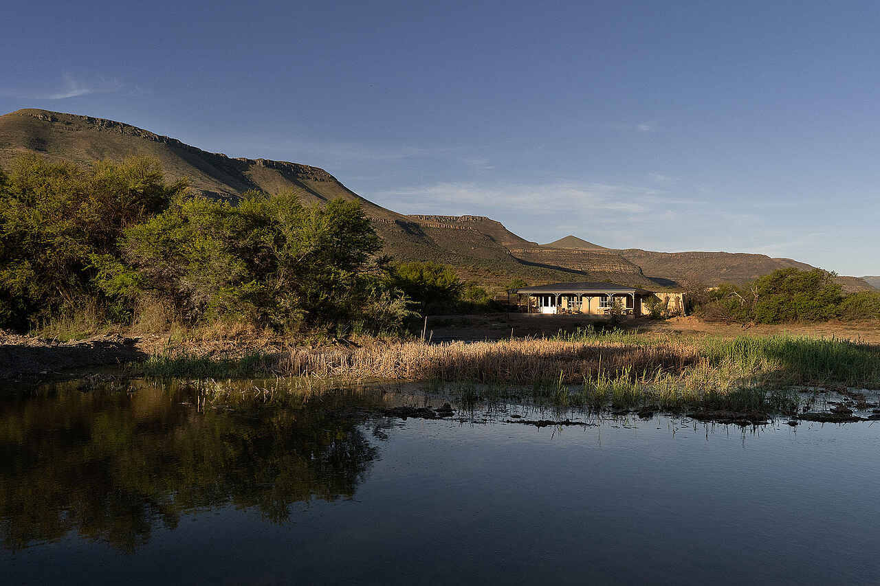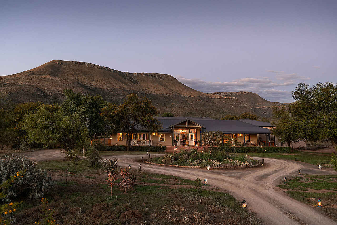 Im liebevoll renovierten Farmhaus der Karoo Lodge finden Gäste großzügige Wohn-, Ess- und Lesezonen, eine Bibliothek, eine offene Küche, eine Bar und einen Weinkeller. Ein schattiger Innenhof mit Speckbäumen und ein Ausstellungsraum zur Geschichte und Zukunft des Reservats schaffen eine angenehme Atmosphäre zwischen Wissen und Wohlfühlen. Draußen trifft kultivierter Lodgegarten auf die wilde Vegetation der Karoo. Aloe, Wildgräser und Jacketplum-Bäume prägen das Bild. Der Pool liegt etwas abseits vom Hauptgebäude, umgeben von Rasenflächen und mit einer überdachten Gazebo-Zone. Kinder können sich im Spielbereich austoben, im kleinen Shop gibt es Mitbringsel für Zuhause.