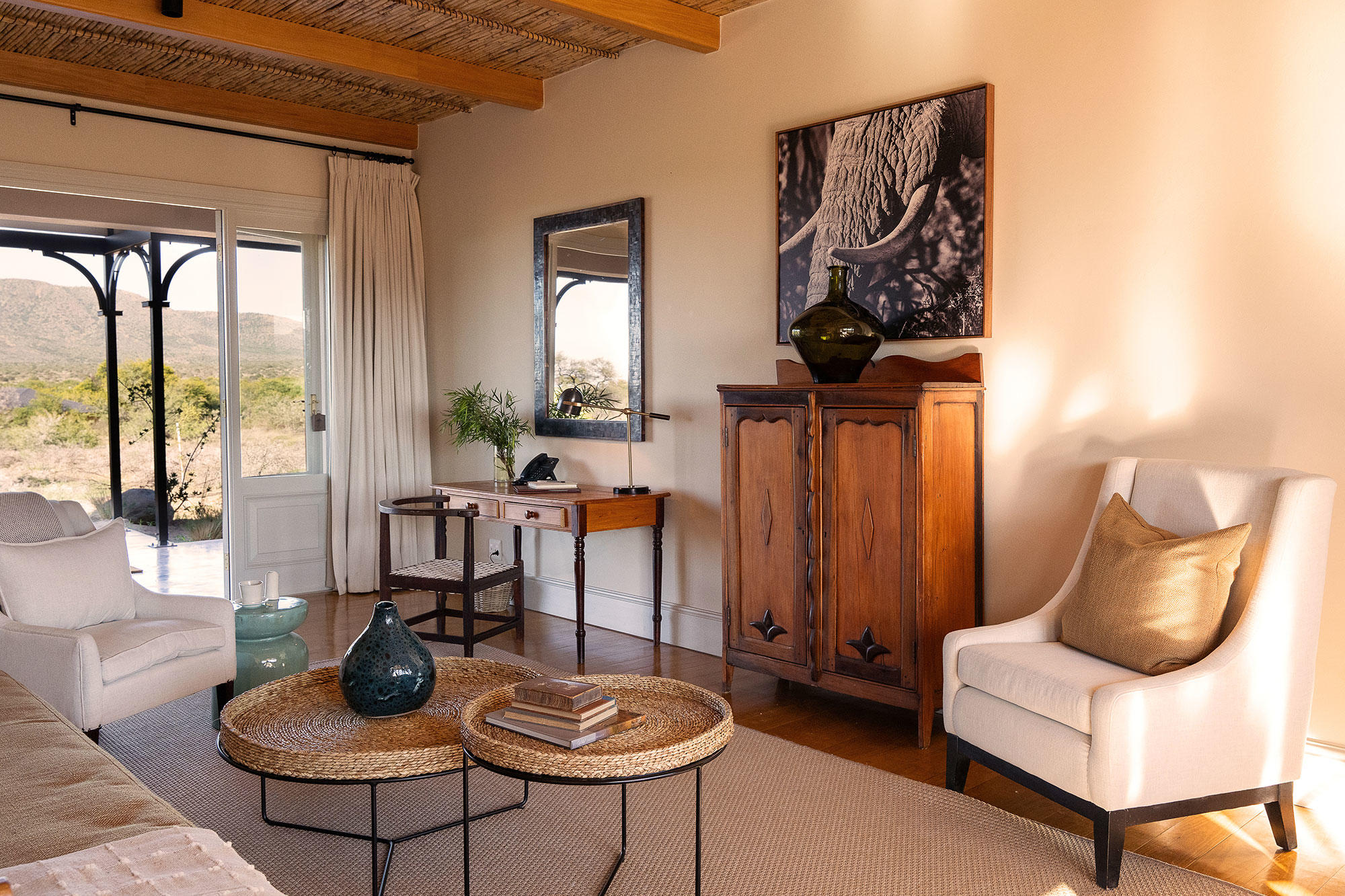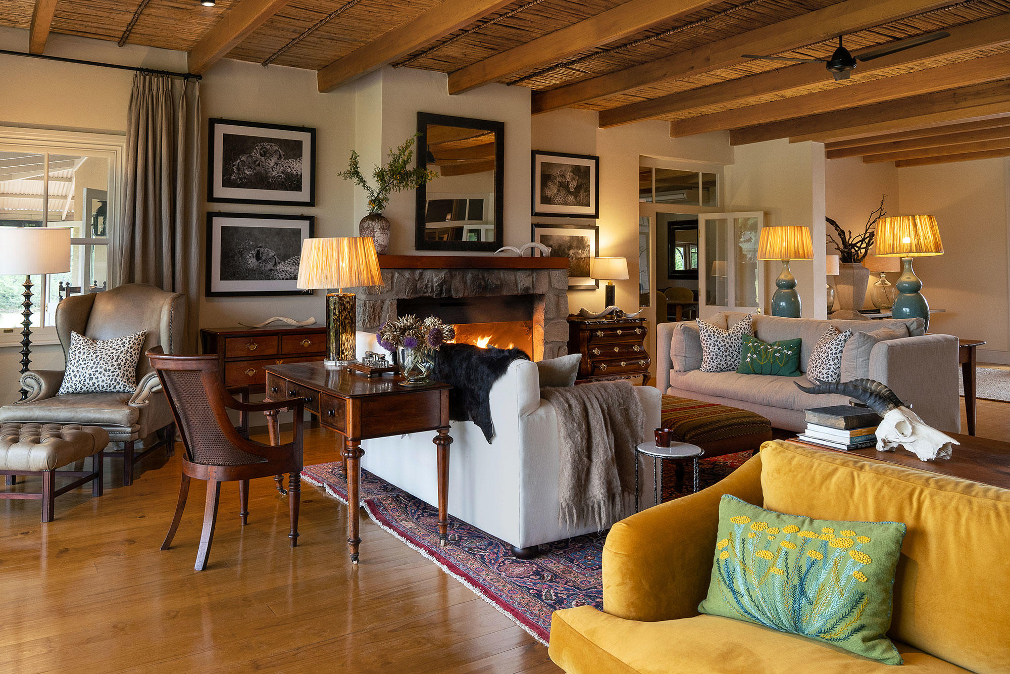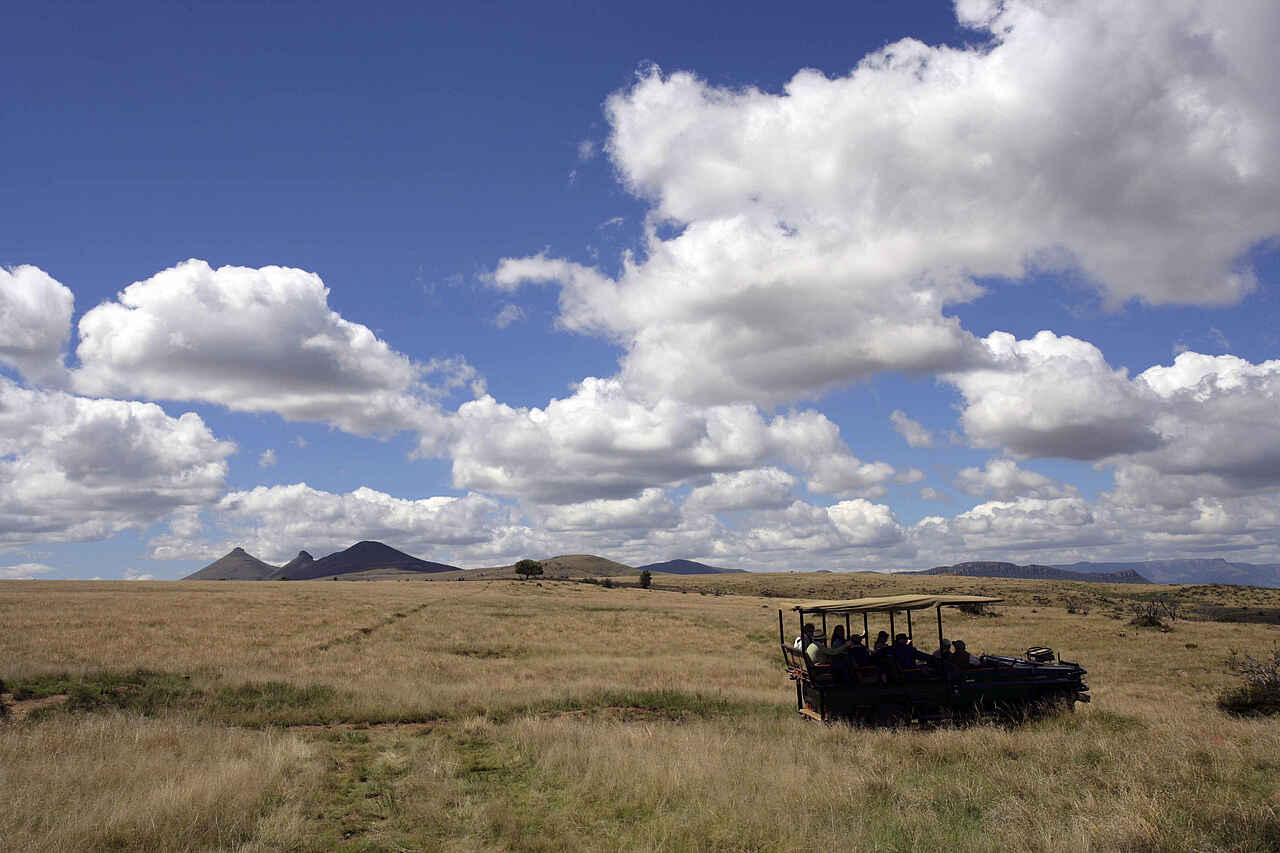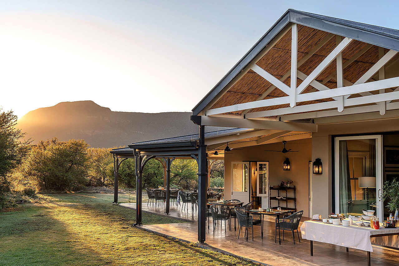 Im liebevoll renovierten Farmhaus der Karoo Lodge finden Gäste großzügige Wohn-, Ess- und Lesezonen, eine Bibliothek, eine offene Küche, eine Bar und einen Weinkeller. Ein schattiger Innenhof mit Speckbäumen und ein Ausstellungsraum zur Geschichte und Zukunft des Reservats schaffen eine angenehme Atmosphäre zwischen Wissen und Wohlfühlen. Draußen trifft kultivierter Lodgegarten auf die wilde Vegetation der Karoo. Aloe, Wildgräser und Jacketplum-Bäume prägen das Bild. Der Pool liegt etwas abseits vom Hauptgebäude, umgeben von Rasenflächen und mit einer überdachten Gazebo-Zone. Kinder können sich im Spielbereich austoben, im kleinen Shop gibt es Mitbringsel für Zuhause.
