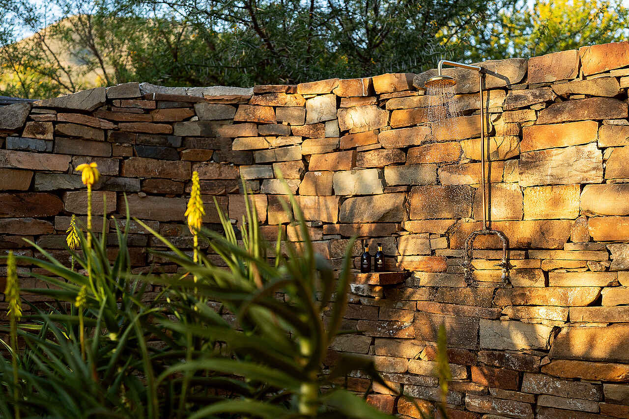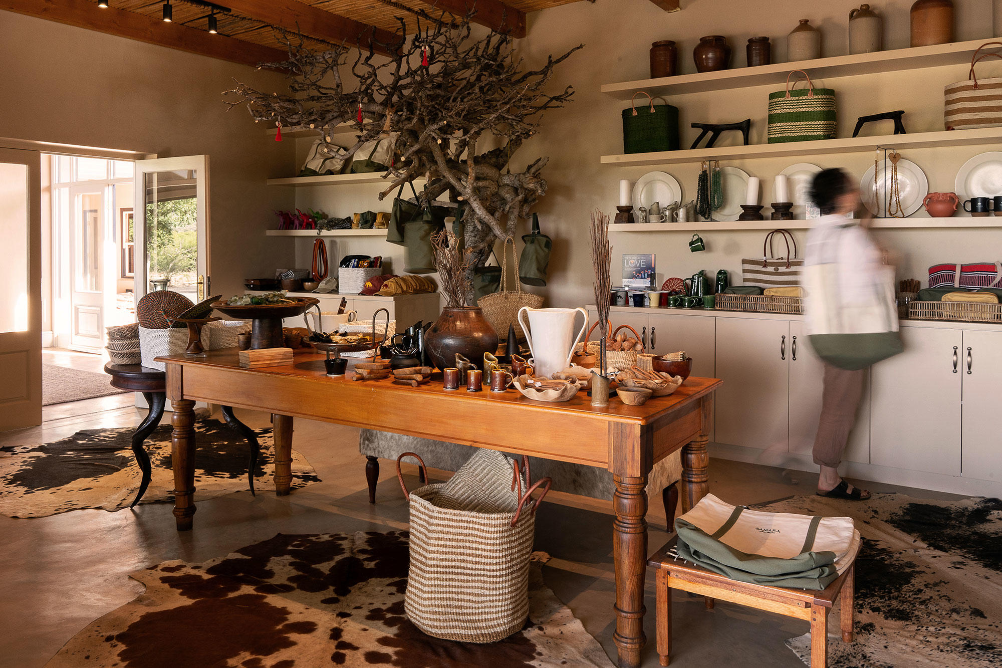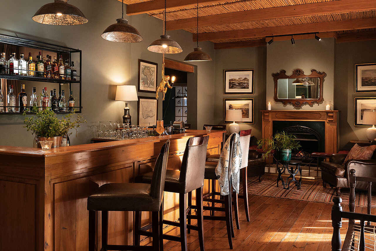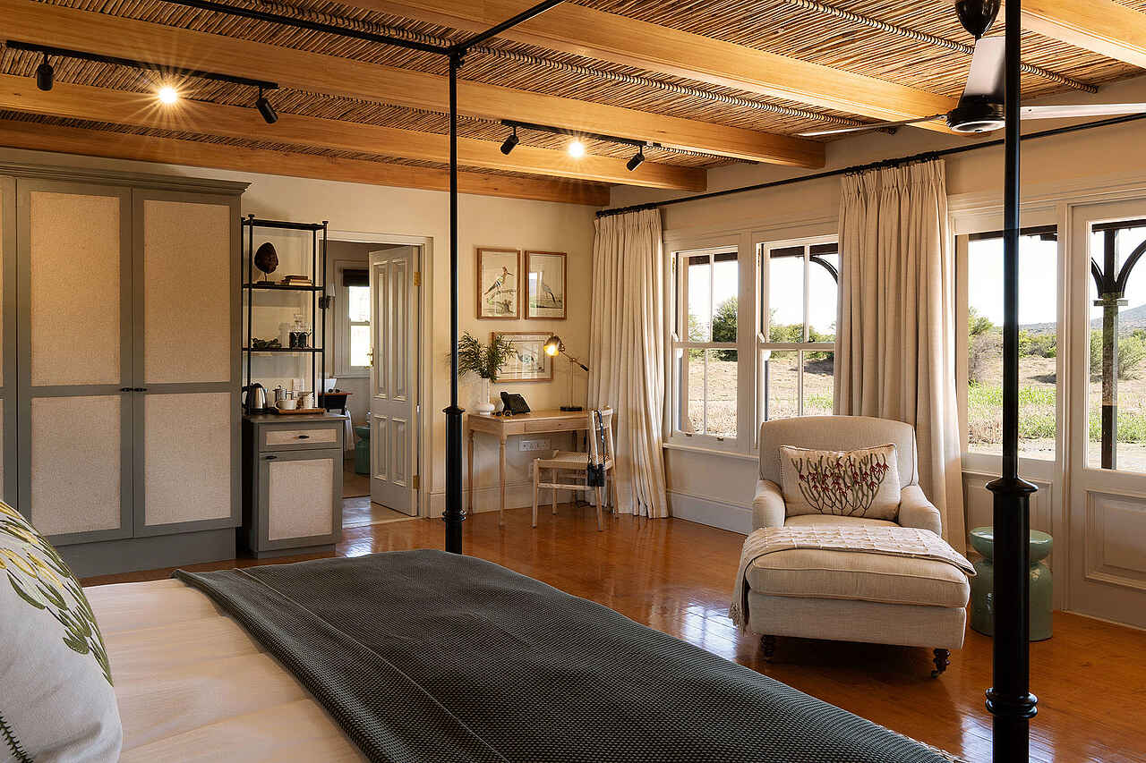 Im liebevoll renovierten Farmhaus der Karoo Lodge finden Gäste großzügige Wohn-, Ess- und Lesezonen, eine Bibliothek, eine offene Küche, eine Bar und einen Weinkeller. Ein schattiger Innenhof mit Speckbäumen und ein Ausstellungsraum zur Geschichte und Zukunft des Reservats schaffen eine angenehme Atmosphäre zwischen Wissen und Wohlfühlen. Draußen trifft kultivierter Lodgegarten auf die wilde Vegetation der Karoo. Aloe, Wildgräser und Jacketplum-Bäume prägen das Bild. Der Pool liegt etwas abseits vom Hauptgebäude, umgeben von Rasenflächen und mit einer überdachten Gazebo-Zone. Kinder können sich im Spielbereich austoben, im kleinen Shop gibt es Mitbringsel für Zuhause.