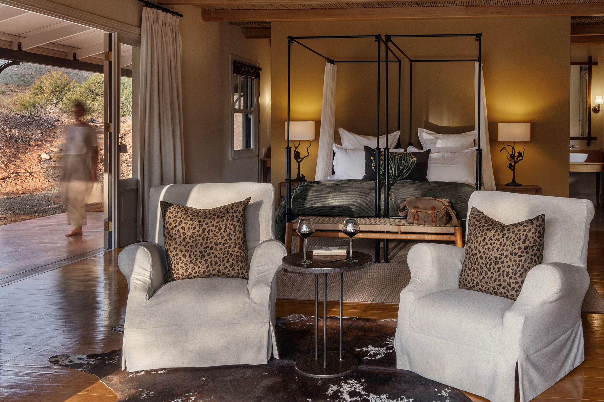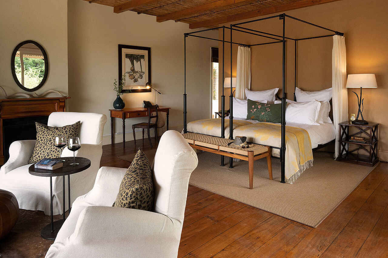 Die acht freistehenden Cottages bieten großzügigen Komfort mit einem großen Bett unter einem schützenden Moskitonetz, einem gemütlichen Kamin und einer Klimaanlage für angenehme Temperaturen zu jeder Jahreszeit. Die eleganten En-suite-Badezimmer sind mit einer freistehenden Badewanne, einer Innen- und Außendusche sowie einem Doppelwaschbecken ausgestattet. Auf der möblierten Veranda genießen Gäste ihren Morgenkaffee mit Blick in die Weite oder lassen den Tag bei einem Sundowner entspannt ausklingen. Die beiden Familiensuiten verfügen über zwei Schlafzimmer mit jeweils eigenem Badezimmer, einen gemeinsamen Wohnbereich und eine überdachte Terrasse.
