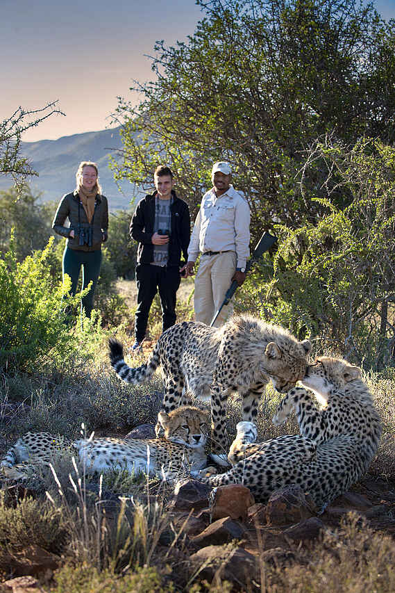Die Karoo Lodge bietet ihren Gästen ein abwechslungsreiches Programm rund um Natur und Tierwelt. Klassische Pirschfahrten am frühen Morgen und späten Nachmittag führen durch das private Schutzgebiet. Auf geführten Buschwanderungen lernen Gäste die Umgebung aus nächster Nähe kennen und begegnen Tieren auf Augenhöhe. Das Cheetah Tracking zu Fuß gehört zu den beeindruckendsten Erlebnissen. Dabei folgen kleine Gruppen mit erfahrenem Guide den Spuren der Geparden durch die offene Landschaft. Ergänzend werden Ausflüge zu jahrtausendealten Felszeichnungen, Sternbeobachtungen in klaren Nächten, Naturführungen und interaktive Gespräche zu Naturschutzthemen angeboten. Für besondere Nächte steht das Star Bed zur Verfügung, ein erhöhtes Bett in der offenen Landschaft, das ein einmaliges Schlaferlebnis unter dem Sternenhimmel ermöglicht.