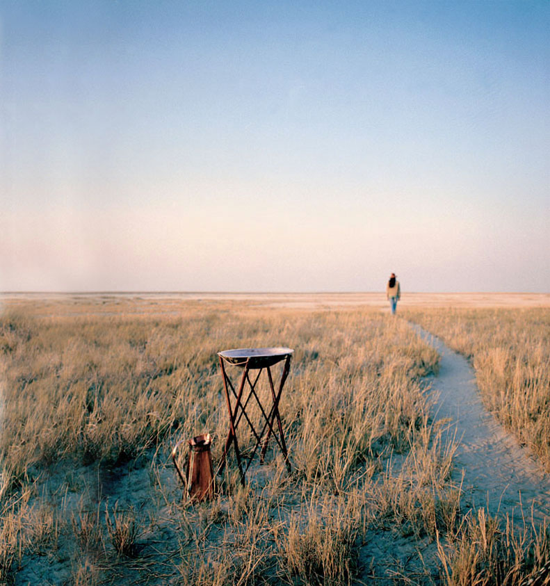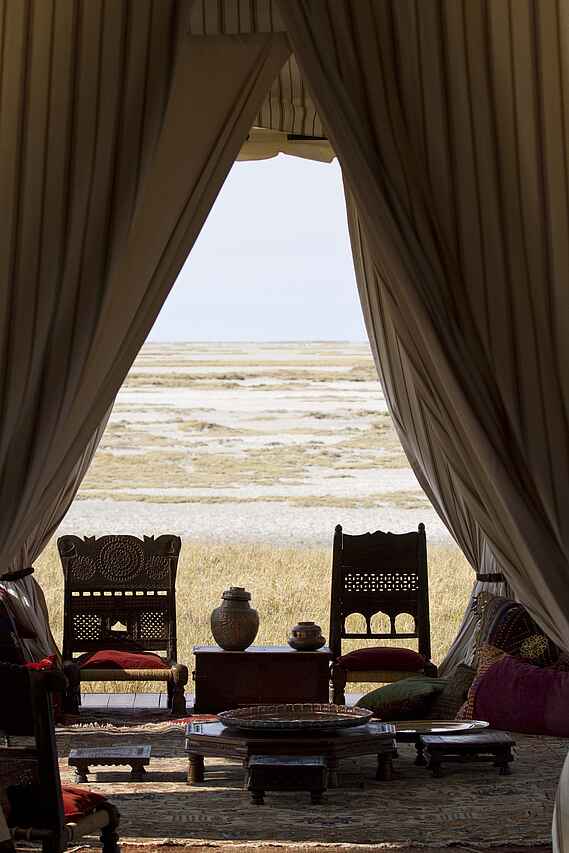 Die sieben Meru-Zelte stehen mit Abstand zueinander entlang des Pfannenrandes und öffnen sich zu einem endlosen Horizont. Innen erwarten die Gäste Himmelbetten mit feiner Baumwolle, Sisalmatten, Stehlampen aus Metall, kleine Schreibtische aus dunklem Holz und ausgewählte Einzelstücke im Vintage-Stil. Das Ambiente ist wohnlich und klar strukturiert, mit wenigen, dafür gut gesetzten Dekoelementen. In jedem Zelt befindet sich ein privater Sitzbereich sowie ein Tablett für Kaffee, Tee und Trinkwasser. Die En-suite-Badezimmer verfügen über Waschbecken, Dusche und eine Spültoilette, ergänzt durch weiche Handtücher und ausgewählte Pflegeprodukte. Der Stil bleibt hell, luftig und unkompliziert, ganz im Sinne des Camps, das Einfachheit als Teil des Erlebnisses versteht.