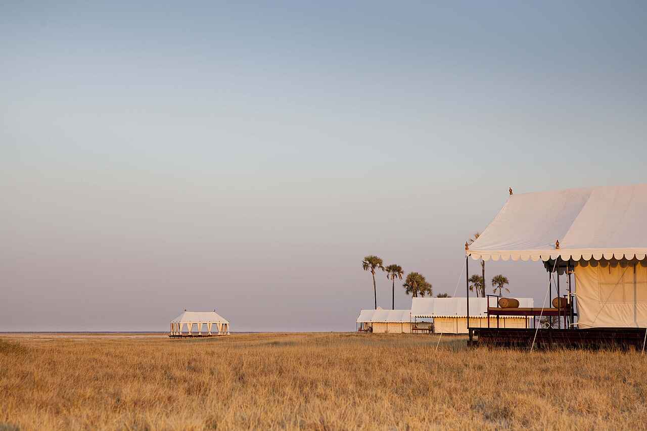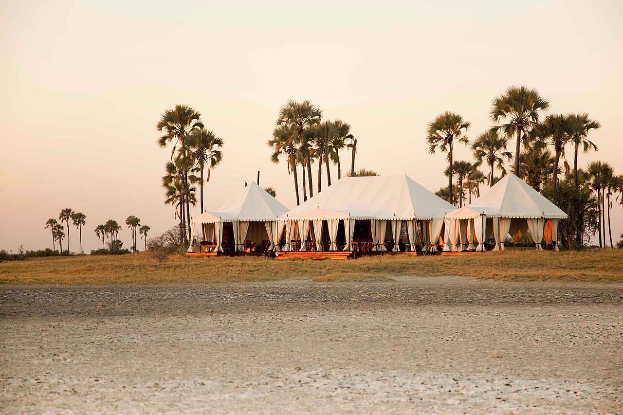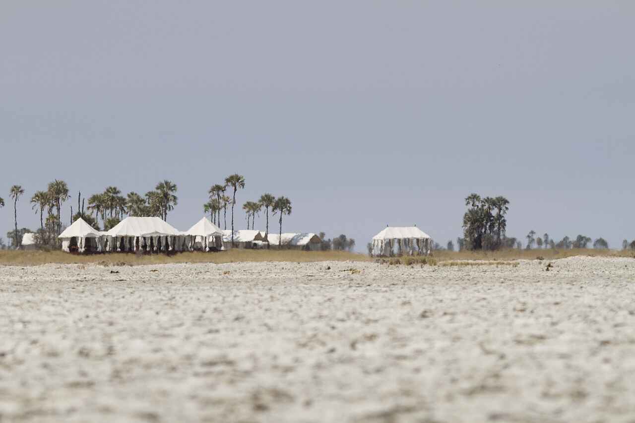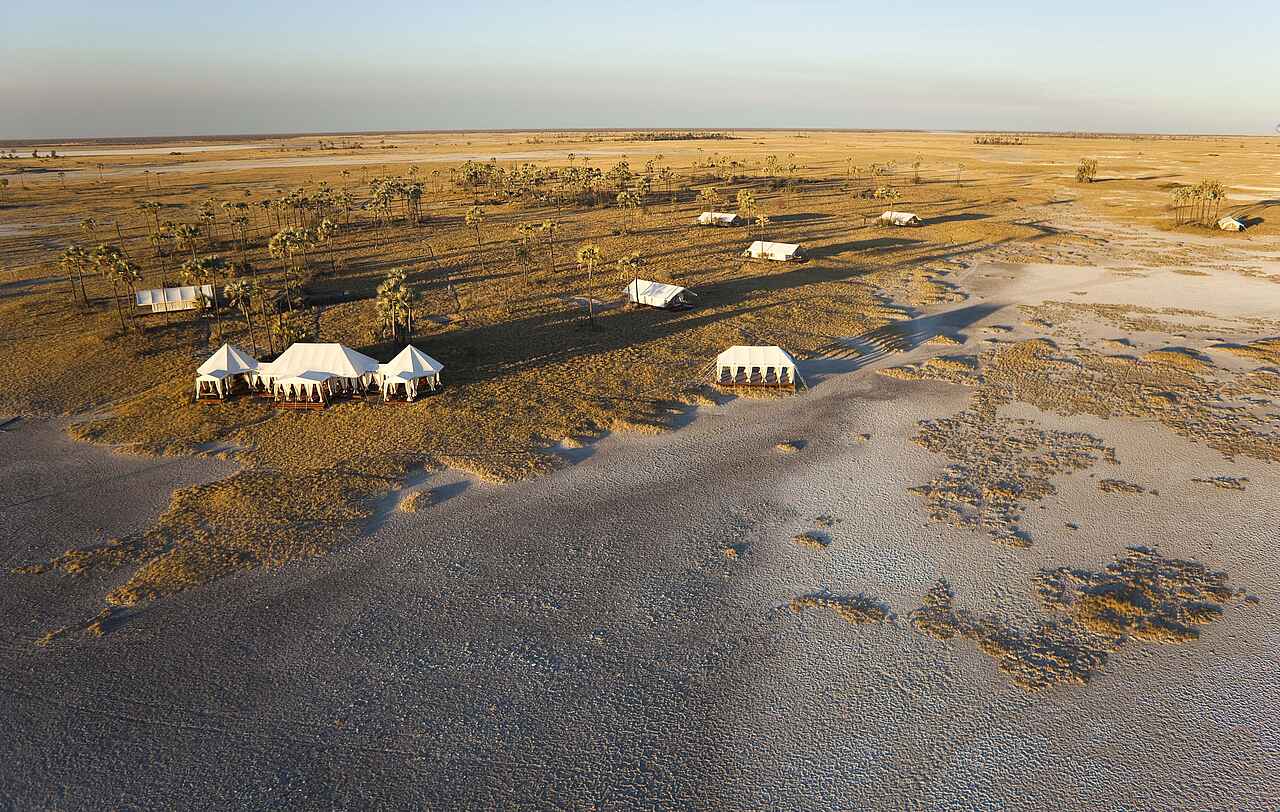 Das San Camp befindet sich in Botswana am Rand der Nwetwe-Pan in den Makgadikgadi Salzpfannen. Die Umgebung besteht aus Salzflächen, Inselhügeln mit Palmen und weitläufiger Savanne. Das Landschaftsbild erscheint offen, minimalistisch und eindrucksvoll still.