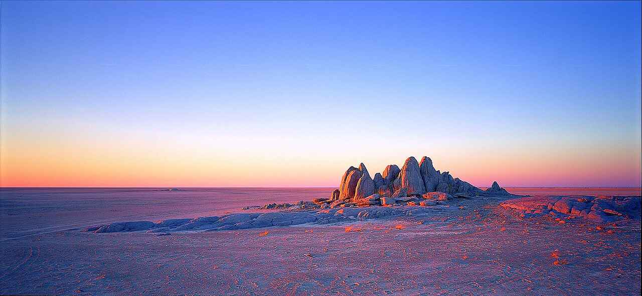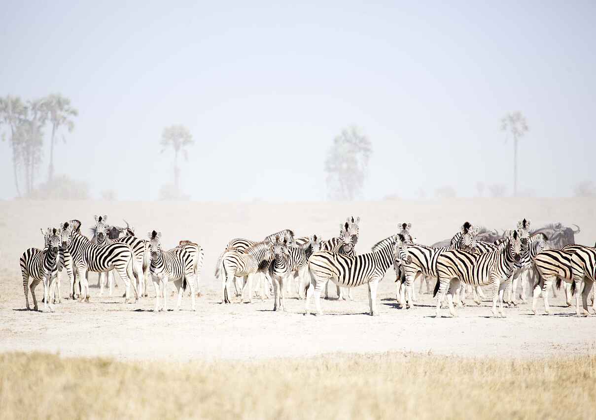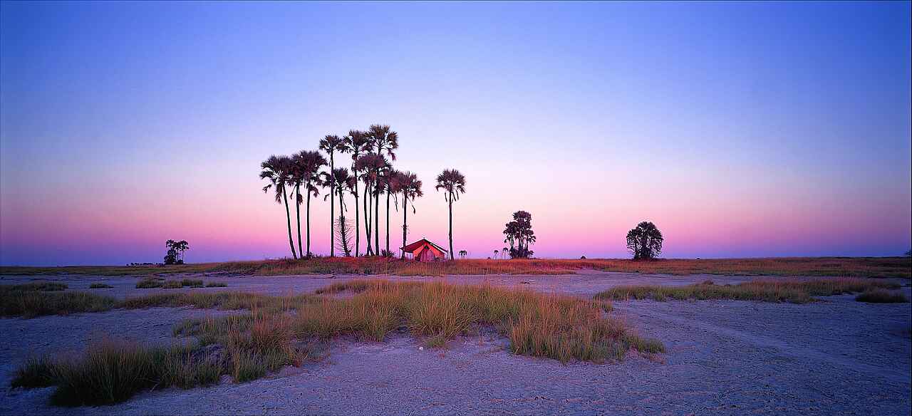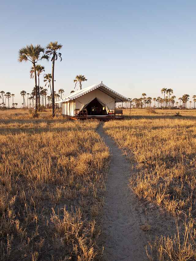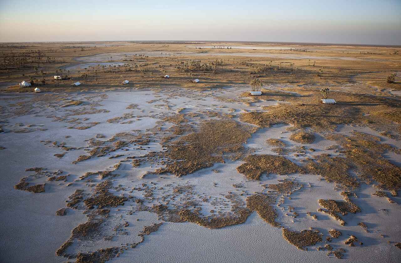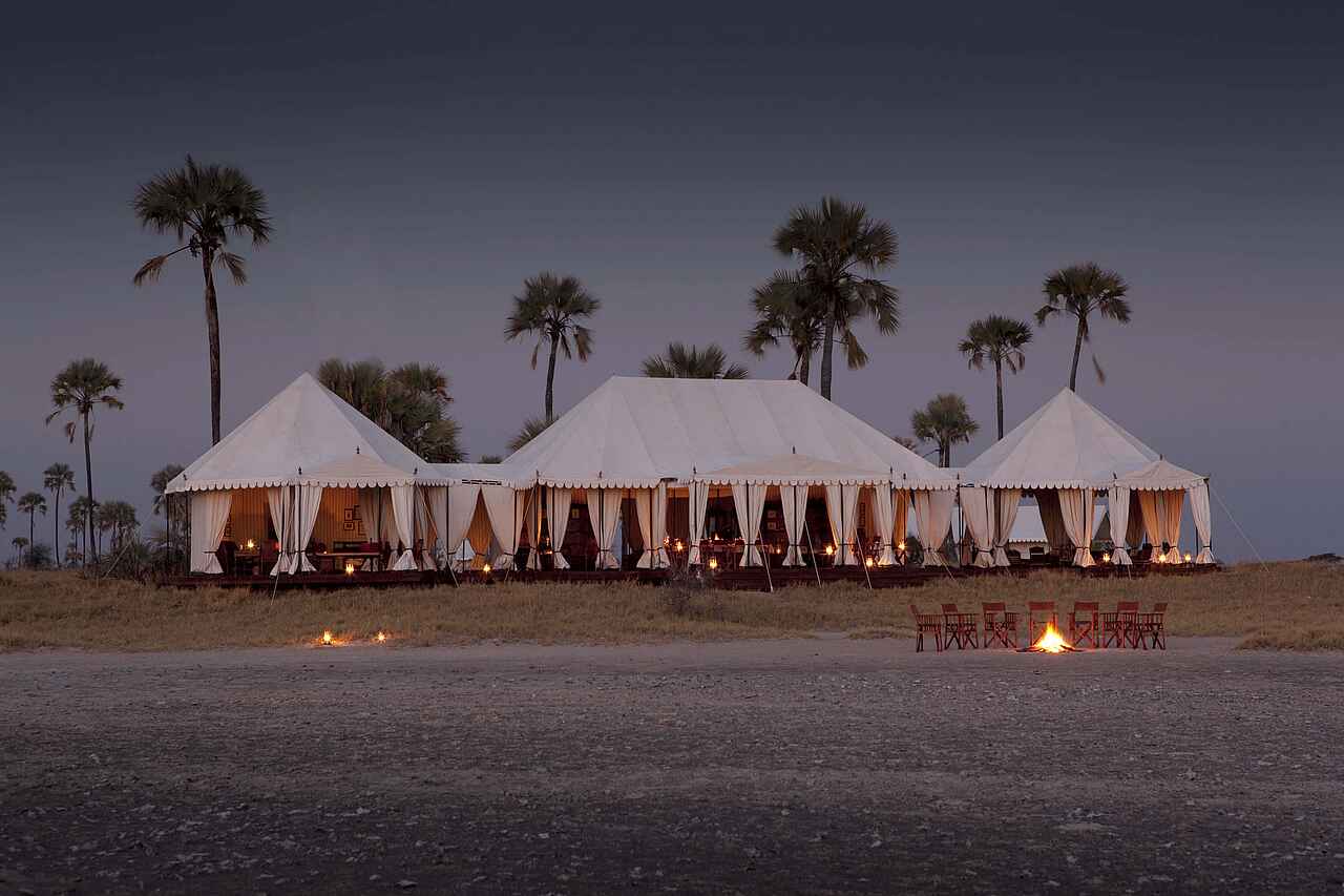 Das San Camp befindet sich in Botswana am Rand der Nwetwe-Pan in den Makgadikgadi Salzpfannen. Die Umgebung besteht aus Salzflächen, Inselhügeln mit Palmen und weitläufiger Savanne. Das Landschaftsbild erscheint offen, minimalistisch und eindrucksvoll still.