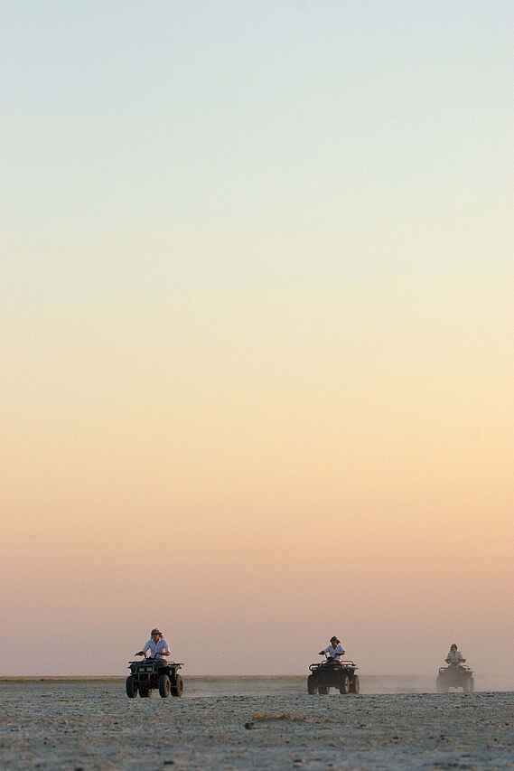 Klassische Pirschfahrten führen durch offene Savanne und hinaus auf die helle Salzfläche der Pfanne. Besonders eindrucksvoll sind Ausflüge im frühen Morgenlicht, wenn die Luft kühl steht und die Ebene in sanften Rosatönen aufleuchtet, während die ersten Antilopen vorbeiziehen. Nachtfahrten setzen einen intensiven Kontrast und eröffnen Chancen auf Schakal, Wüstenfuchs und Hyäne. Geführte Wanderungen schaffen einen ruhigeren Rhythmus. Zu Fuß fühlt sich die Landschaft unmittelbarer an und jede Spur, jeder Windzug gewinnt Bedeutung. Begegnungen mit habituieren Erdmännchen zählen zu den Momenten, die lange in Erinnerung bleiben, da die Tiere ohne Scheu agieren und aus eigenem Antrieb Nähe zulassen. Je nach Wetter organisiert das Camp Quad-Touren über das Pfannenplateau, optional sind auch Helikopterrundflüge und Reitausflüge buchbar. Für stille Stunden sorgen Yoga, Sternbeobachtung am Feuer und Gespräche bei einem Drink.