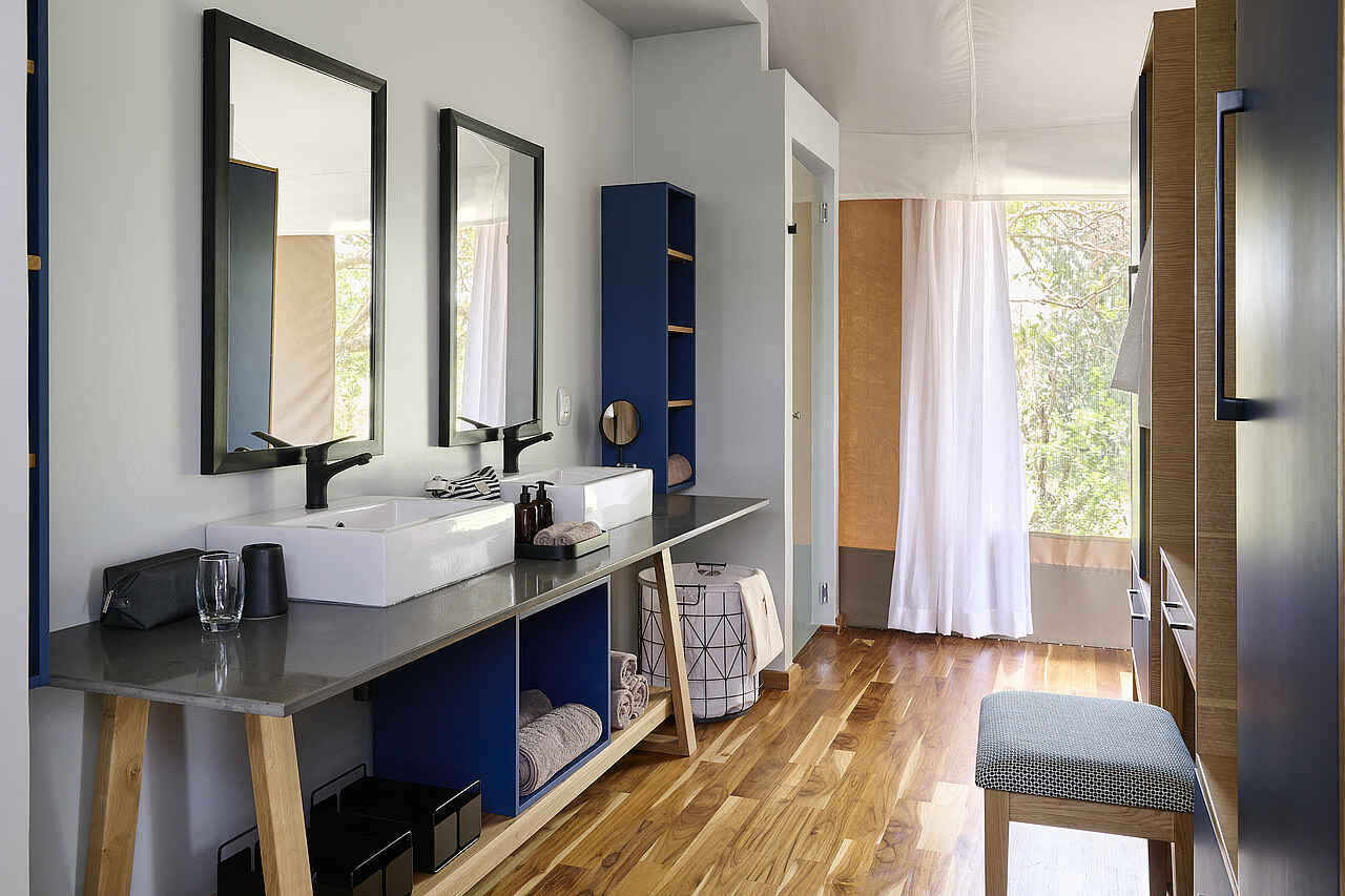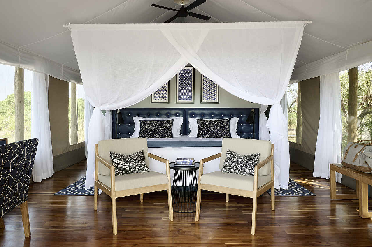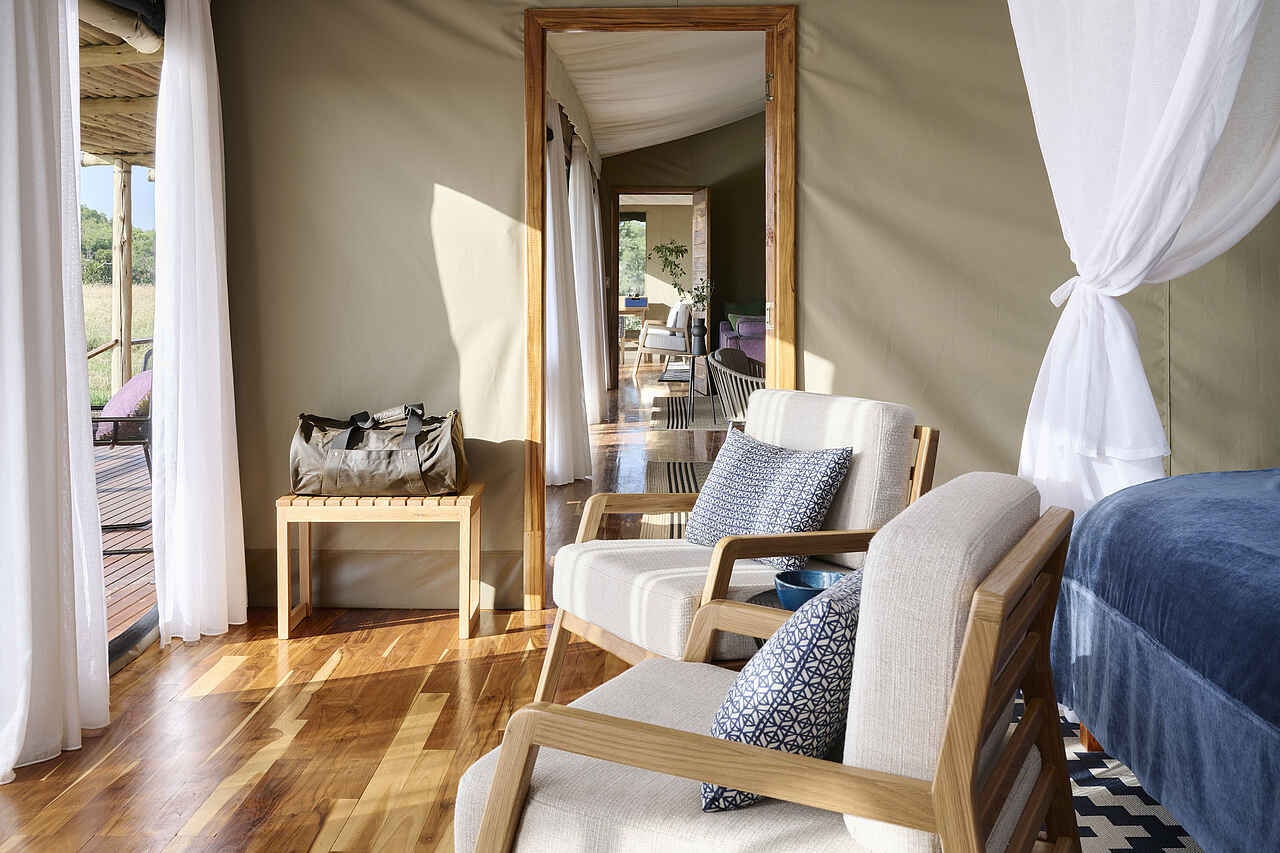 Es gibt zehn luxuriöse Zelt-Suiten und eine Villa mit zwei Schlafzimmern. Jede Suite ist individuell gestaltet und verbindet auf harmonische Weise den Charme des klassischen Safari-Zeitalters mit modernen Elementen und Einflüssen der Massai-Kultur. Das übergroße Kingsize-Bett ist äußerst komfortabel und von Moskitonetzen umgeben.