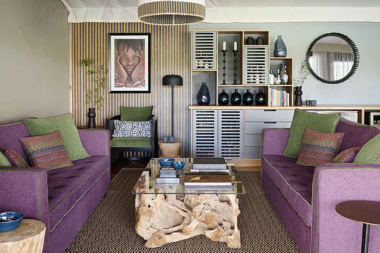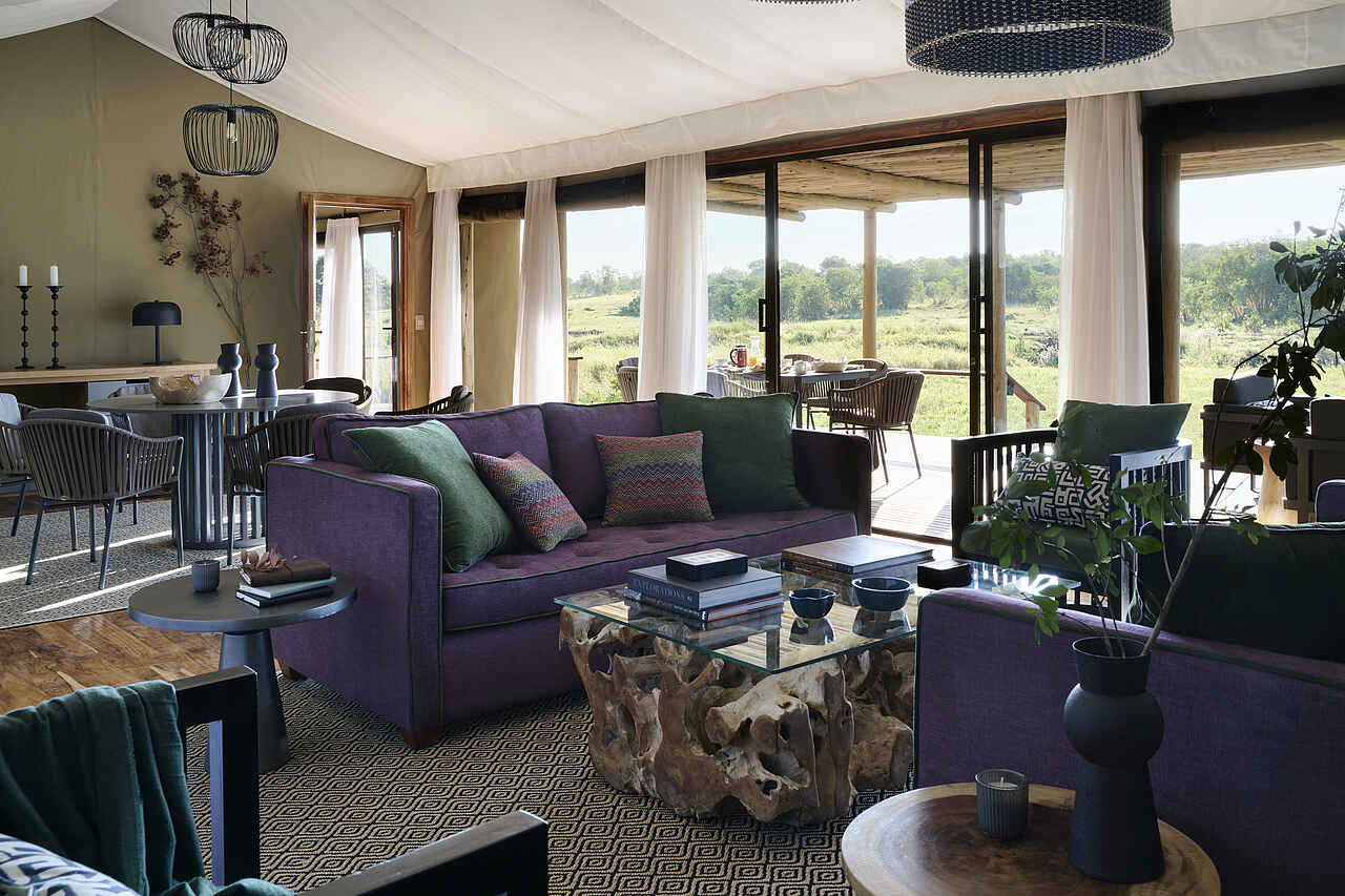 Das zentrale Hauptzelt bietet einen stilvollen und behaglichen Gemeinschaftsbereich, in dem eine gemütliche Lounge zum Verweilen einlädt. Farblich abgestimmte Sofas in Lila und Grün schaffen eine angenehme Atmosphäre, ideal zum Schmökern in einem Buch aus der kleinen Bibliothek. Der Essbereich ist in warmes Licht getaucht und mit hellem Holz sowie geflochtenen Lampenschirmen geschmackvoll gestaltet. Im angrenzenden Barzelt lassen sich erfrischende Getränke genießen, während man den Sonnenuntergang über der malerischen Landschaft bewundert. Nach einem ereignisreichen Tag bietet die Boma den perfekten Rahmen, um am Lagerfeuer Geschichten auszutauschen und den fesselnden Erzählungen der Guides zu lauschen.