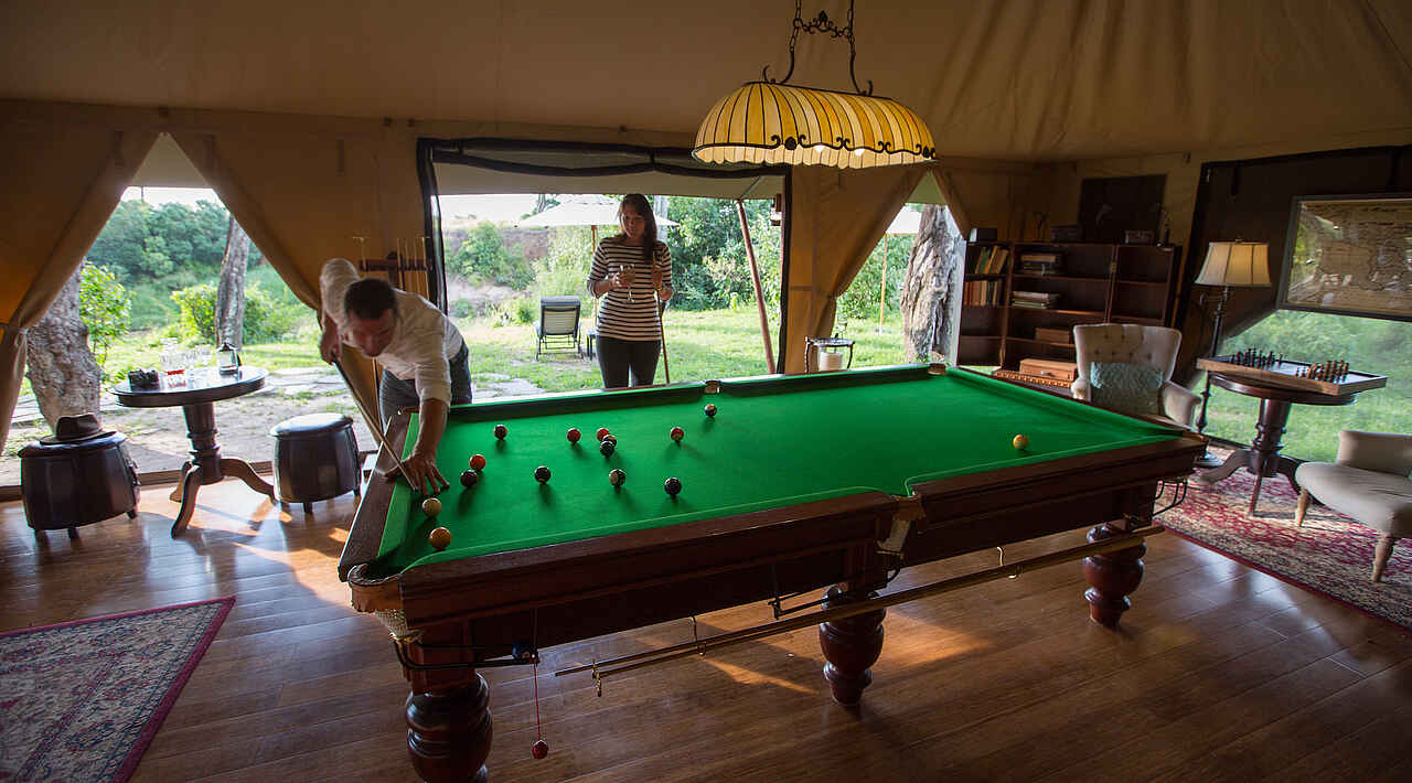 Pirschfahrten gemeinsam mit anderen Gästen in speziell ausgebauten Geländewagen mit Vierradantrieb (Auflademöglichkeit für elektronische Geräte an Bord). Mahlzeiten im Busch, sei es ein Lunch, das Frühstück oder der abendliche Sundowner. Kulturelle Ausflüge, Schwimmen, Billard. Auf Wunsch Ballon-Safari oder Pirschfahrten im exklusiven Geländewagen. Speziell für Kinder: kurze Guided Bush Walks rund ums Camp, Spieleauswahl im Billardzimmer, "Krieger-Training".