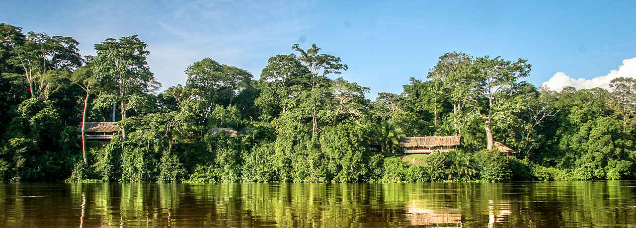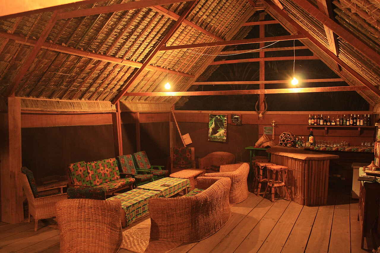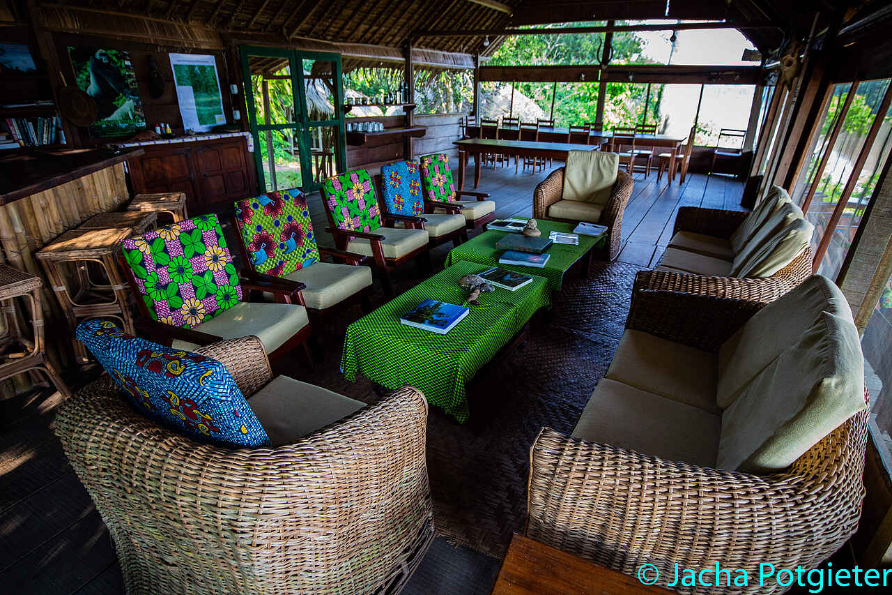 Hauptgebäude inmitten einer Gartenanlage, strohgedeckt am Flussufer mit einfacher Lounge, Aussichtsplattform mit Sitzmöbeln, Bar und Speisebereich. Bootsanlegestelle unterhalb der Nähe der Lodge. WLAN gelegentlich und nur geringer Bandbreite verfügbar. Wäscheservice. Die Lodge wird inhabergeführt von Tamar und Rod Cassidy.