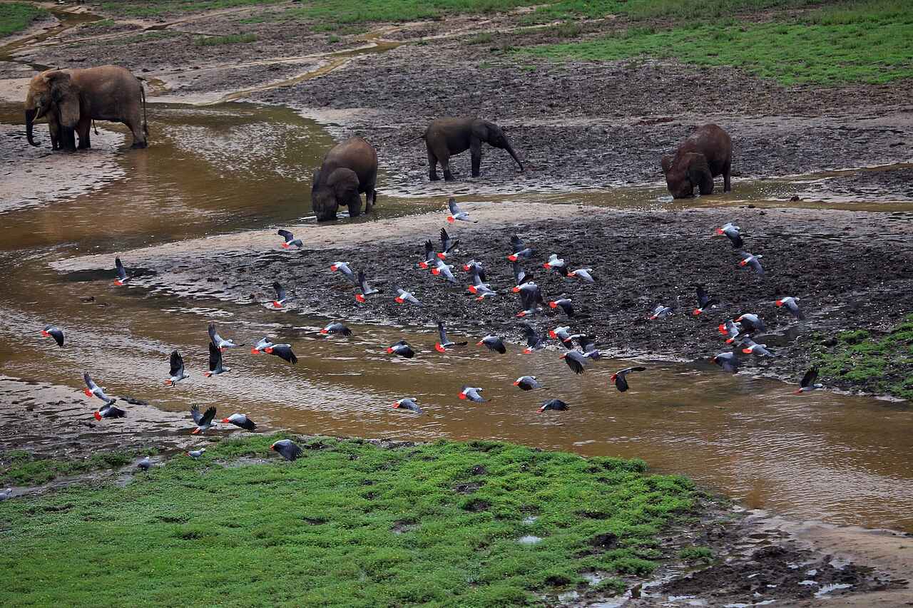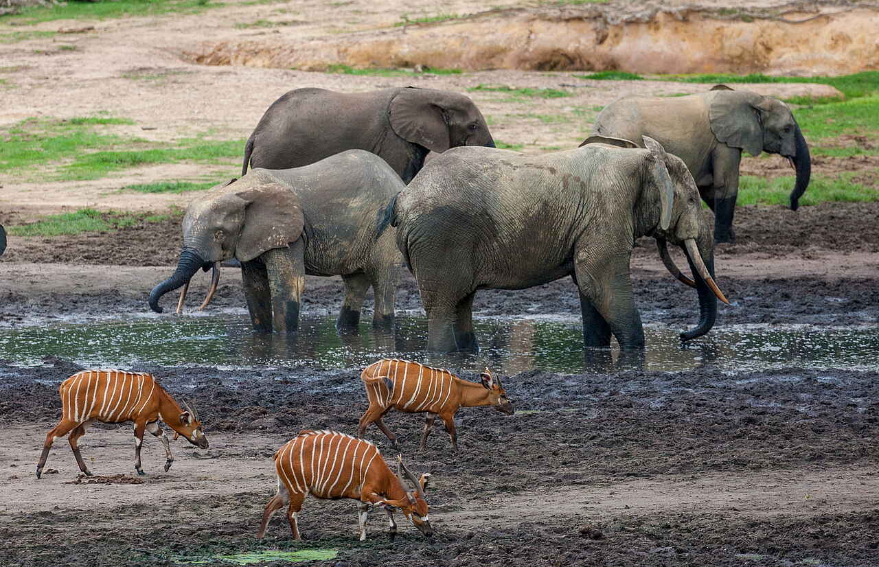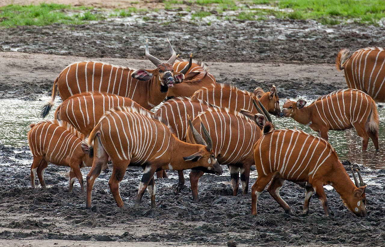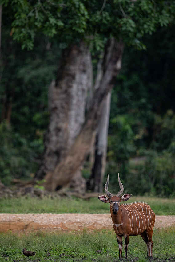 Es gibt eine Reihe von Tieren, die hier in Unterarten bekannter Tierarten aus anderen Regionen Afrikas vorkommen: Waldelefanten (Loxodonta cyclotis) - kleiner rund leichter, Waldbüffel (Syncerus caffer nanus) - kleiner und wesentlich heller gefärbt, Westlicher Flachlandgorilla (Gorilla Gorilla Gorilla) - etwas kleiner als die Berggorillas, Pinselohrschwein (Potamochoerus porcus) - dem europäischen Wildschwein in der Form ähnlich, jedoch kastanienbraun, Riesenwaldschwein (Hylochoerus meinertzhageni) - dem Warzenschwein ähnlich, Bongo-Antilopen (Tragelaphus eurycerus) - markant rotbraun gefärbt mit schmalen, senkrechten, weißen Streifen, verwandt mit mit dem Kudu; Sitatunga-Antilopen (Tragelaphus spekii) - eine auf das Leben in Sumpfgebieten spezialisierte Antilope. Es kommen drei verschiedene Arten von Schuppentieren vor. Außerdem Olivmangaben, Blauducker - eine Zwergantilope, 5 weitere Duckerarten, Mantelaffen (Colobus guereza), Otter, Schimpansen. Über 400 Vogelarten wurden im Park beobachtet, darunter der blaue Riesenturako, verschiedene Hornraben, Eulenarten, Eisvögel, Raubvögel, Hammerkop, African Grey Parrot, Bienenfresser, Störche, Nachtschwalben, Spechte, Violet Turaco, Sumpfhühner, Nektarvögel, Schwalben... Es gibt Leoparden und Golden Cats, die allerdings Gäste so gut wie nie zu Gesicht bekommen.