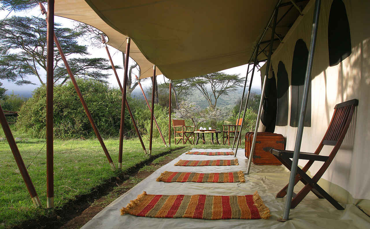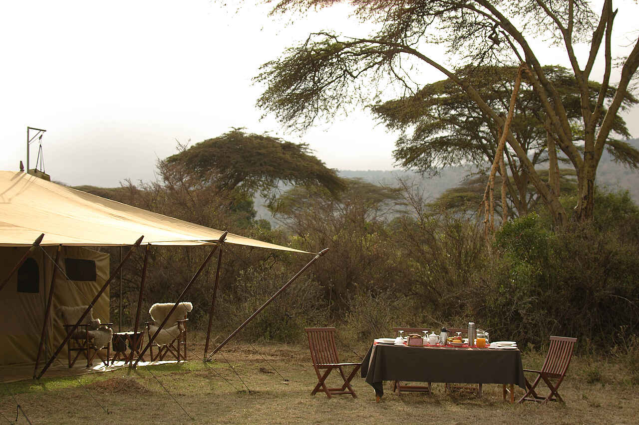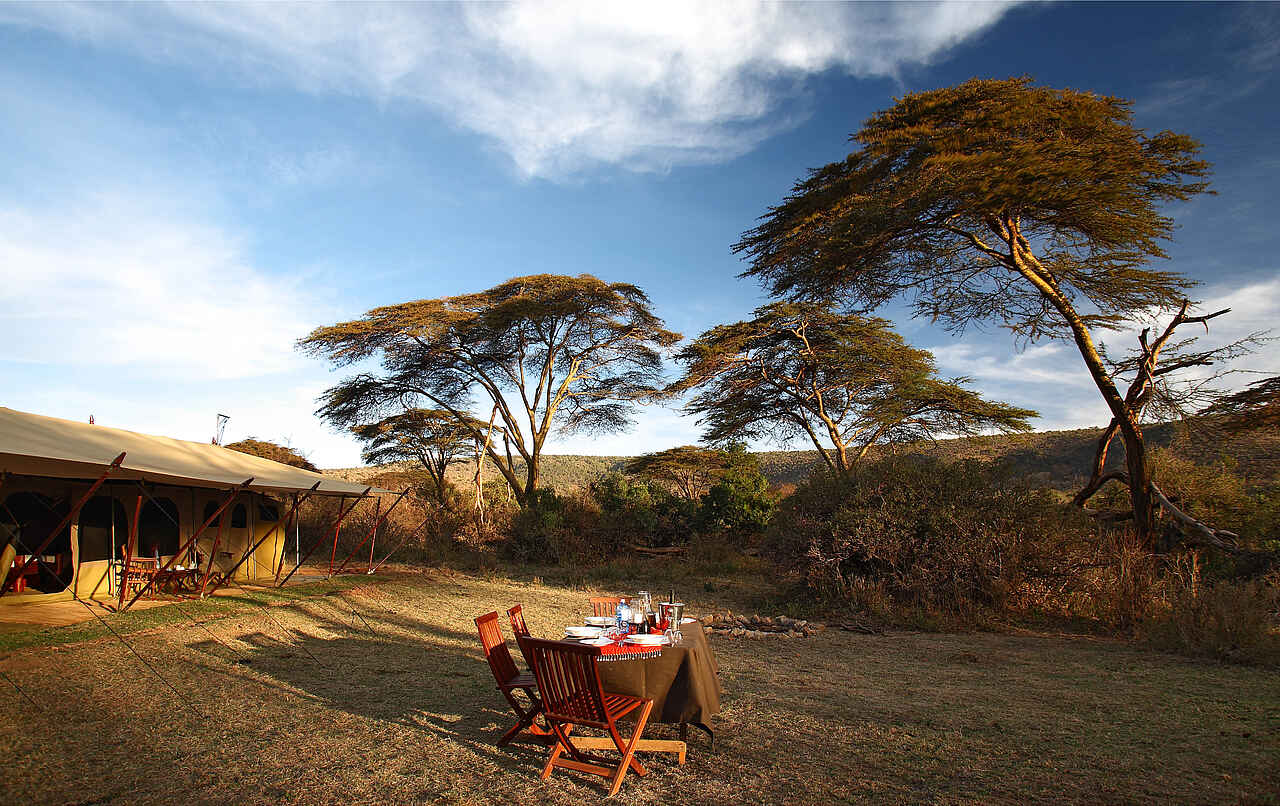 Zentrales Hauptzelt mit Sofas, Kaffeetisch und Dinnertafel, die bei Bedarf unter freiem Himmel aufgestellt wird. Im Außenbereich gibt es eine Veranda mit Klappstühlen und eine Feuerstelle. Keine Elektrizität, kein Mobilfunk- oder Internetempfang, Gäste können Einrichtungen von Saruni Mara mitnutzen.