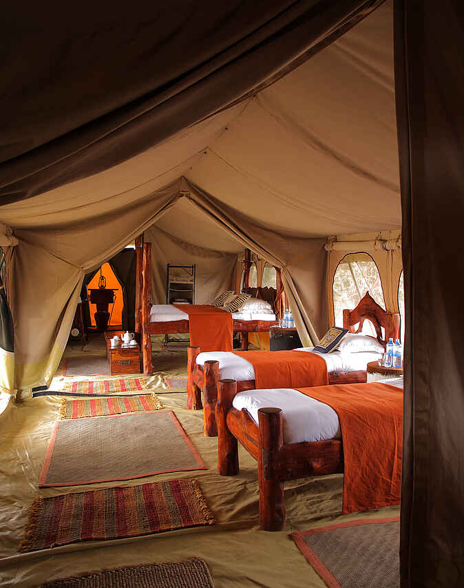 3 Gästezelte, davon 2 Doppelzelte für je 2 Personen und 1 Familienzelt für 4 Personen, alle mitgroßen hölzernen Betten, Bad (Safaridusche, Heißwasser, Spültoilette) und Veranda. Toilettenartikel und Wäscheservice inklusive.