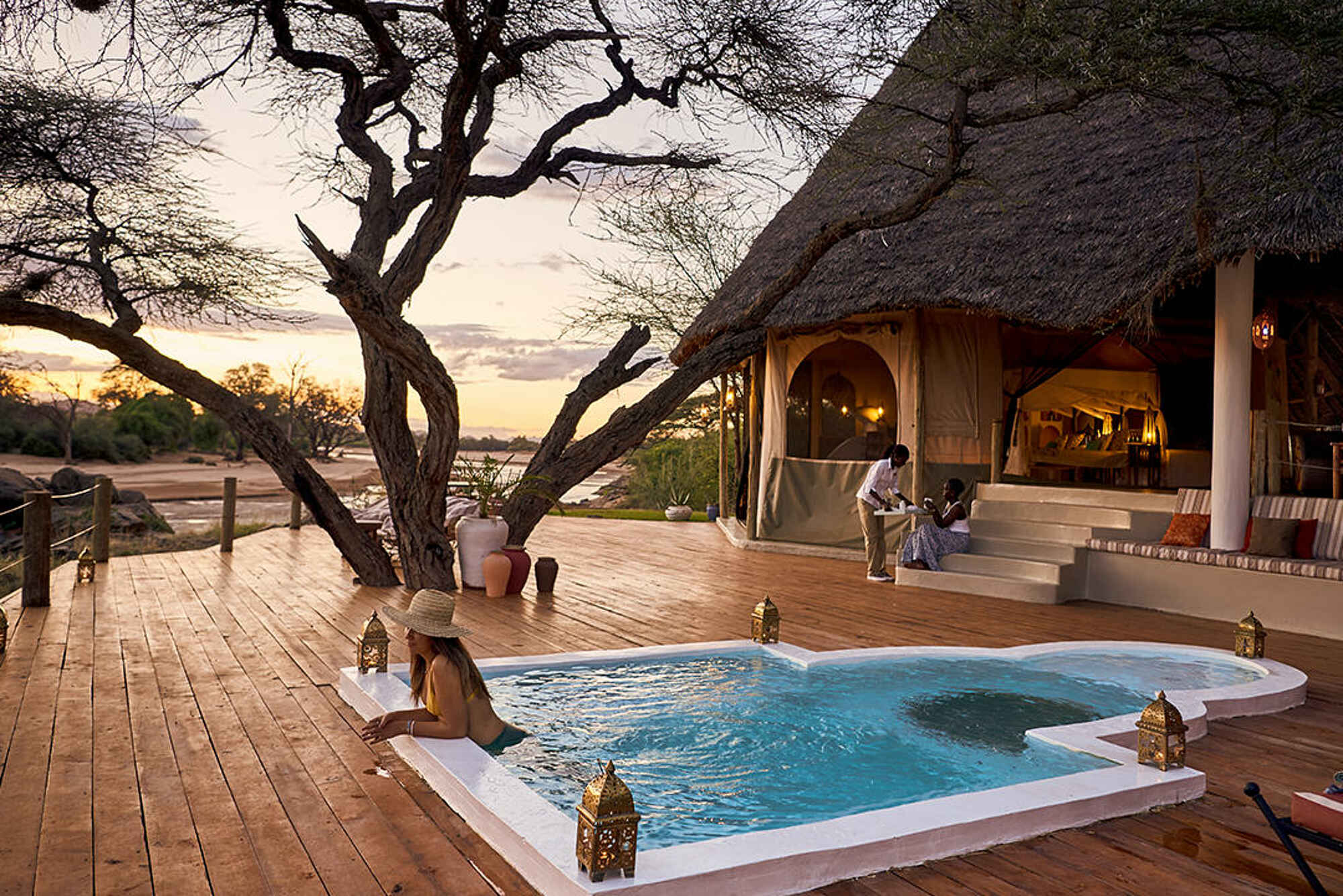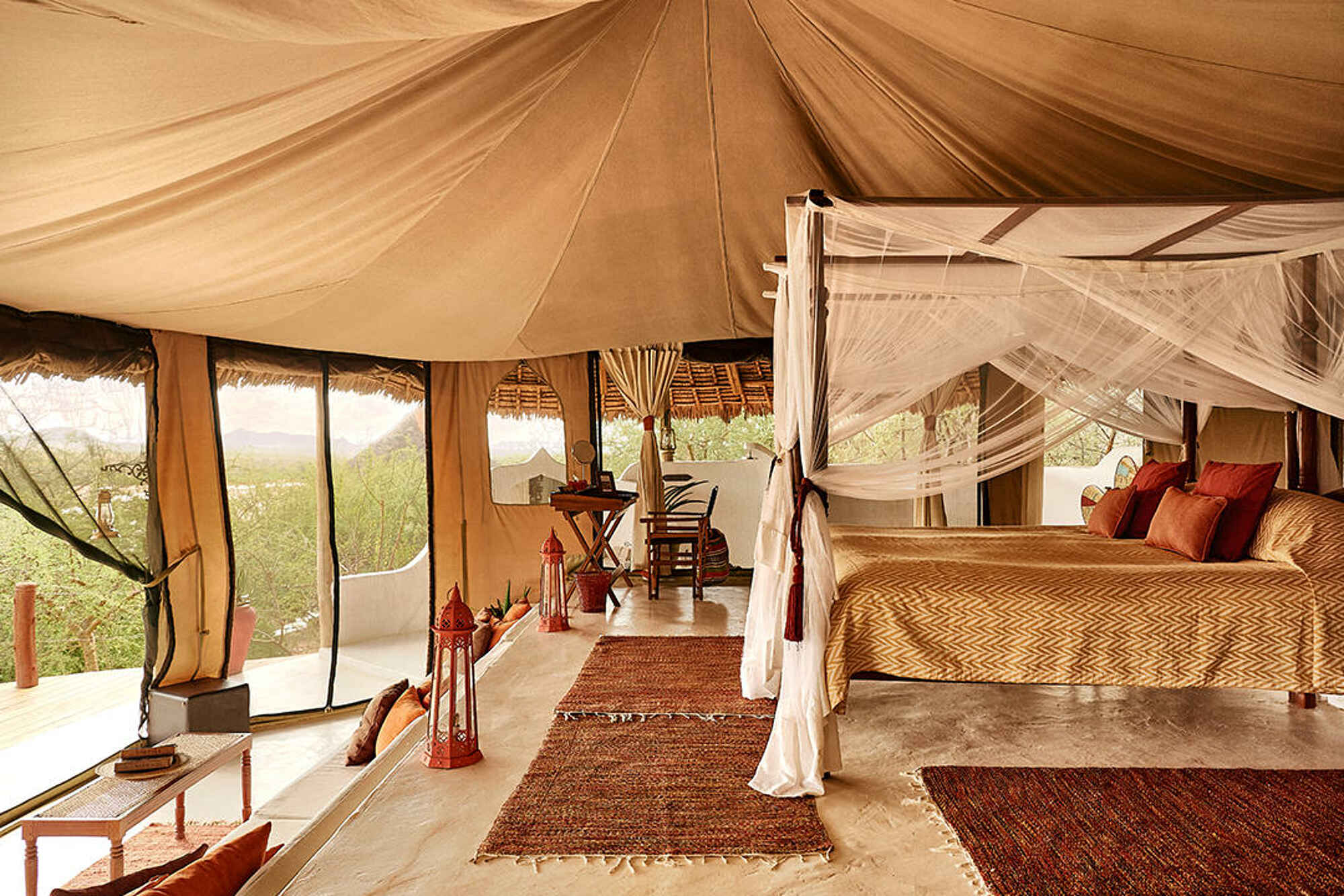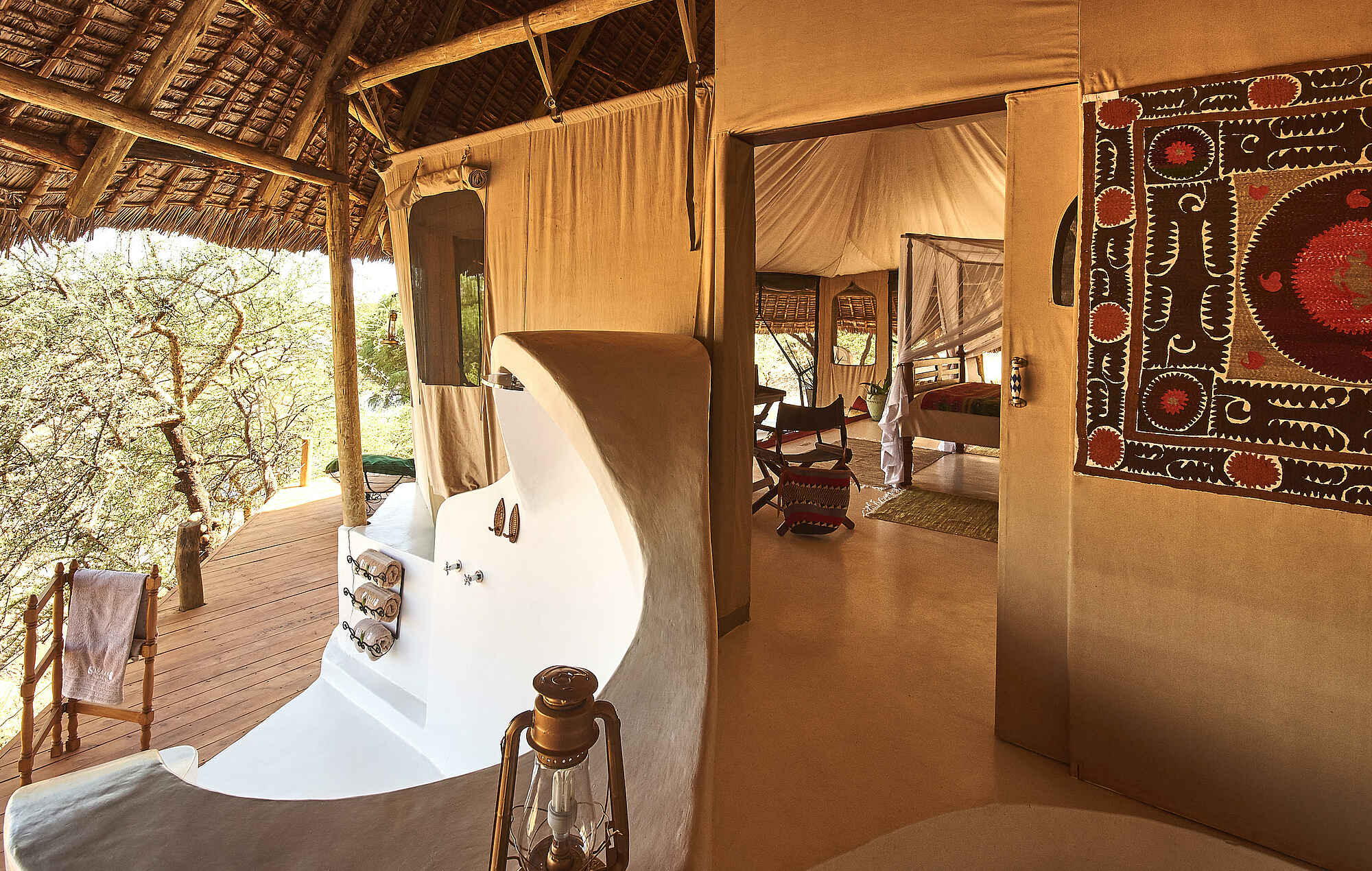 Die neun luxuriösen Zeltsuiten von Sasaab sind auf erhöhten Holzplattformen errichtet und eröffnen weite Blicke ins Flusstal. Jede Suite umfasst mehr als 100 Quadratmeter und garantiert ein hohes Maß an Privatsphäre. Großzügige Segeltuchdächer, schwere Leinenstoffe und Möbel aus dunklem Holz verleihen den Räumen eine stilvolle, zugleich behagliche Atmosphäre. Zur Ausstattung gehören ein Himmelbett mit Moskitonetz, ein Schreibtisch, gemütliche Sitzgelegenheiten sowie eine private Veranda mit eigenem Plunge Pool. Das offen gestaltete En-suite-Badezimmer verfügt über eine Regendusche, ein WC und ein Doppelwaschbecken. Zusätzlich stehen Ventilatoren, ein Safe, eine Minibar, Kaffee- und Teezubereitungsmöglichkeiten, Yogamatten und Mückenspray bereit. Für Familien gibt es zwei großzügige Suiten mit jeweils zwei verbundenen Schlafzimmern und einem gemeinsamen Wohnbereich.