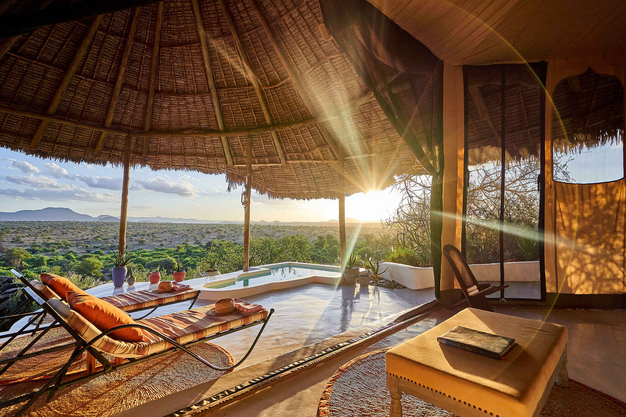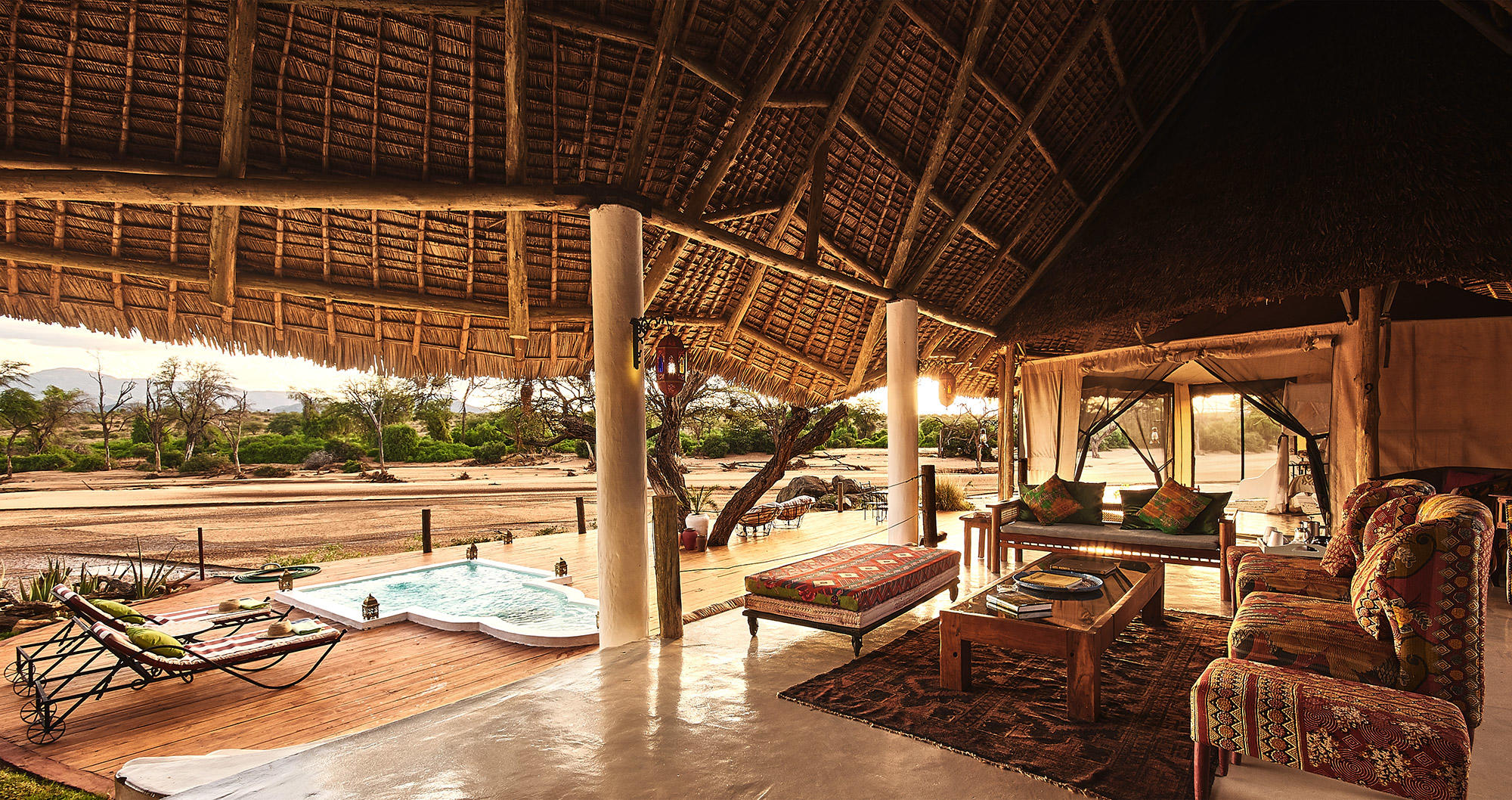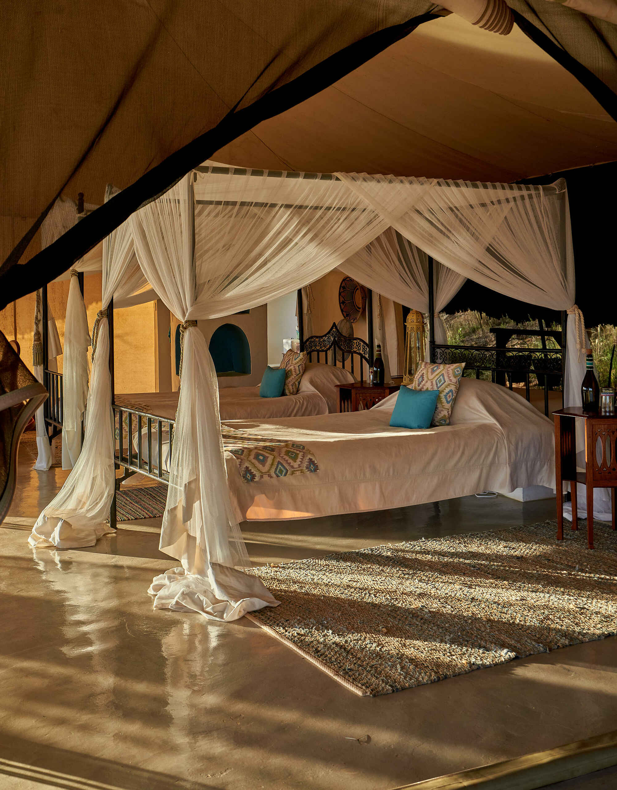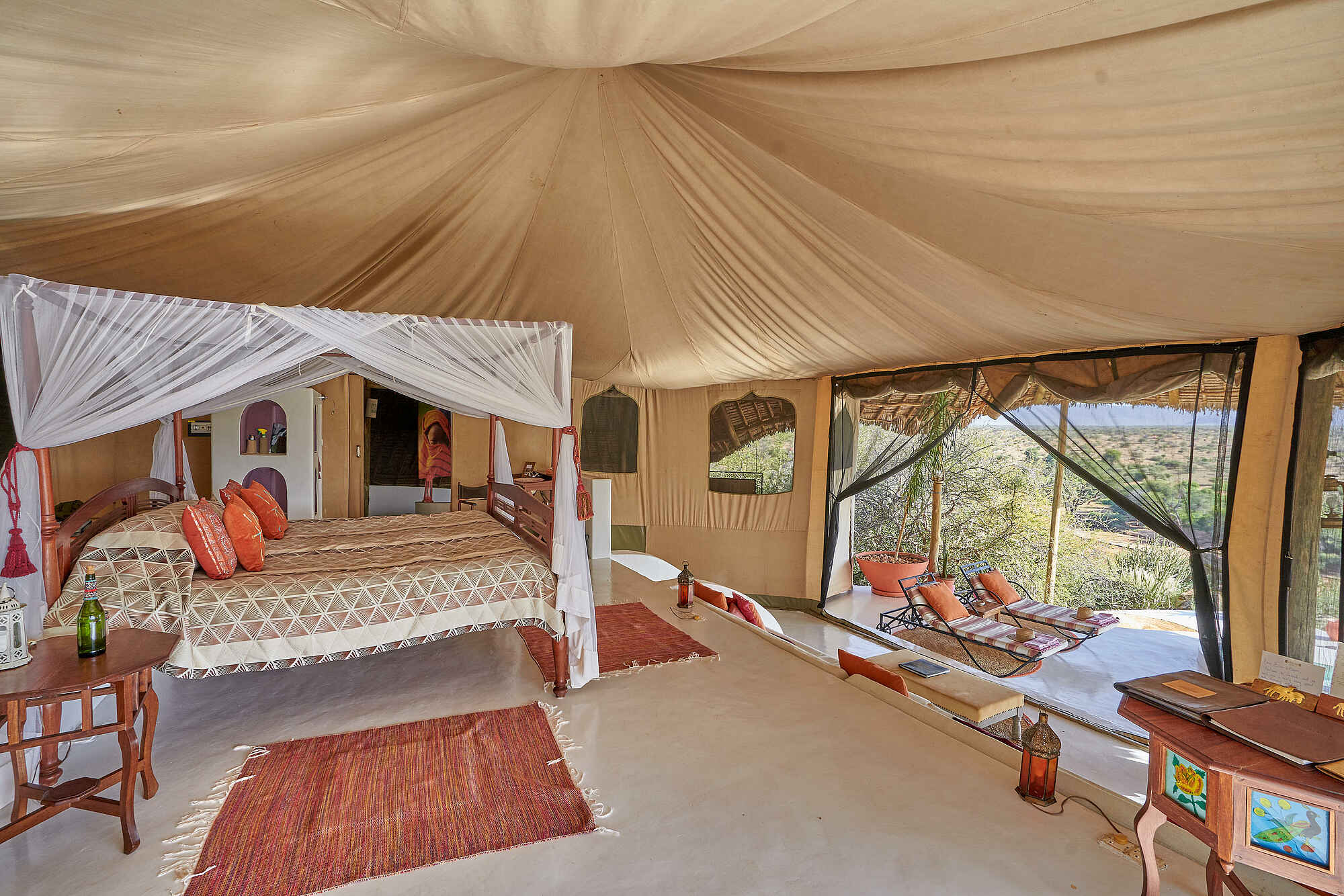 Die neun luxuriösen Zeltsuiten von Sasaab sind auf erhöhten Holzplattformen errichtet und eröffnen weite Blicke ins Flusstal. Jede Suite umfasst mehr als 100 Quadratmeter und garantiert ein hohes Maß an Privatsphäre. Großzügige Segeltuchdächer, schwere Leinenstoffe und Möbel aus dunklem Holz verleihen den Räumen eine stilvolle, zugleich behagliche Atmosphäre. Zur Ausstattung gehören ein Himmelbett mit Moskitonetz, ein Schreibtisch, gemütliche Sitzgelegenheiten sowie eine private Veranda mit eigenem Plunge Pool. Das offen gestaltete En-suite-Badezimmer verfügt über eine Regendusche, ein WC und ein Doppelwaschbecken. Zusätzlich stehen Ventilatoren, ein Safe, eine Minibar, Kaffee- und Teezubereitungsmöglichkeiten, Yogamatten und Mückenspray bereit. Für Familien gibt es zwei großzügige Suiten mit jeweils zwei verbundenen Schlafzimmern und einem gemeinsamen Wohnbereich.