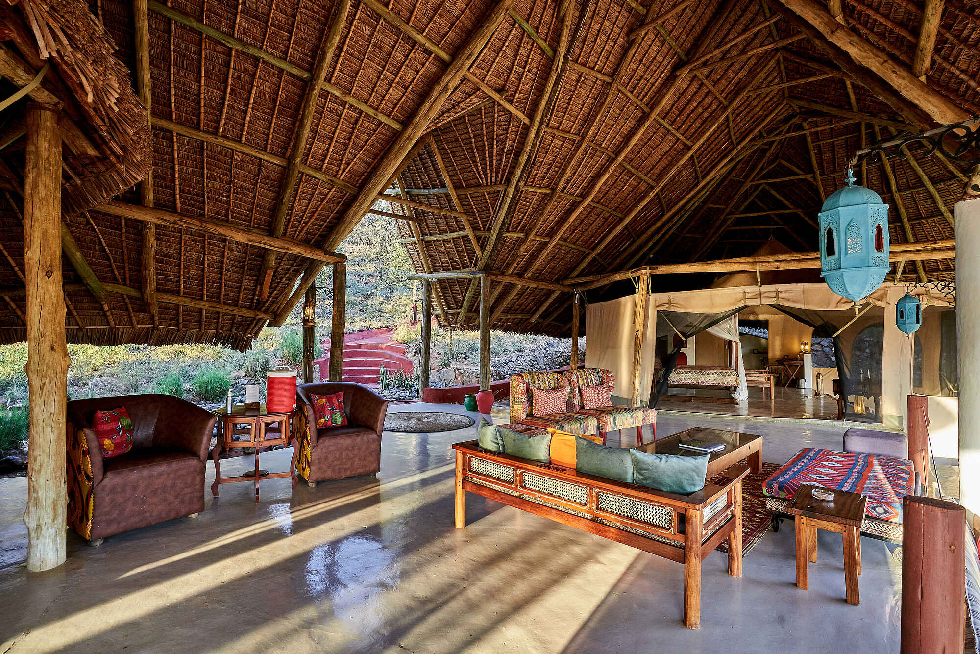 Das Sasaab Camp empfängt seine Gäste mit offen gestalteten Gemeinschaftsbereichen, die durch ihre marokkanisch inspirierte Architektur und warme Farbgebung sofort ins Auge fallen. Weiß gekalkte Böden, gemauerte Rundbögen, handgefertigte Möbel und bunte Textilien schaffen eine stilvolle und zugleich entspannte Atmosphäre. Lounge, Bar und Restaurant sind um einen zentralen Innenhof gruppiert und öffnen sich zur umliegenden Landschaft mit weitem Blick auf das Flusstal des Ewaso Nyiro.