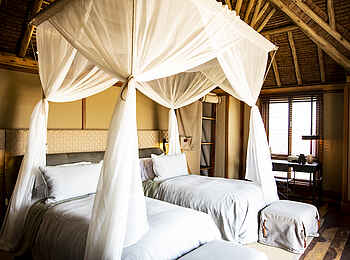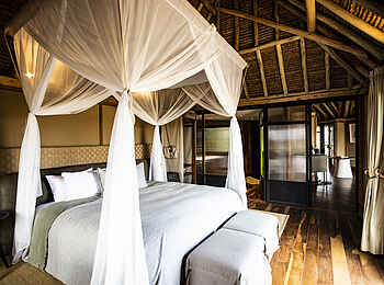 Die Schlafzimmer jeder Villa sind mit einem Kingsize-Himmelbett, Nachttischen mit Beleuchtung, einem bequemen Sofa und großzügigem Stauraum ausgestattet. Private Holzdecks laden mit komfortablen Liegen und einem eingelassenen Jacuzzi zum Verweilen ein. Die Innenbereiche bieten eine stilvolle Lounge, während die schattigen Outdoor-Schwingbetten ideal für ein Nickerchen oder sogar eine Nacht unter dem afrikanischen Sternenhimmel sind. Alle Villen verfügen über moderne En-Suite-Badezimmer mit Doppelwaschbecken, Regenduschen und großzügigen Innen- und Außenbadewannen, die ein entspanntes Badeerlebnis inmitten der Natur ermöglichen.