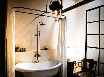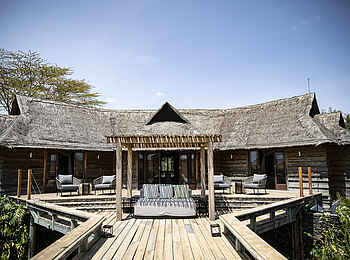 Das Herzstück des Segera Retreats ist ein sorgfältig restauriertes Farmhaus aus der Kolonialzeit, umgeben von üppigen Gärten. Die großzügigen Lounge- und Essbereiche sind stilvoll eingerichtet und bieten eine warme Atmosphäre. In der Lounge sorgen bequeme Sitzgruppen rund um elegante Couchtische für entspannte Stunden, während der Speisebereich mit Tischen unterschiedlicher Größe und eleganten Stühlen vielseitige Sitzmöglichkeiten bietet. Beide Räume öffnen sich zu einem weitläufigen Deck, auf dem Gäste die Landschaft genießen, unter freiem Himmel speisen oder einfach zur Ruhe kommen können.