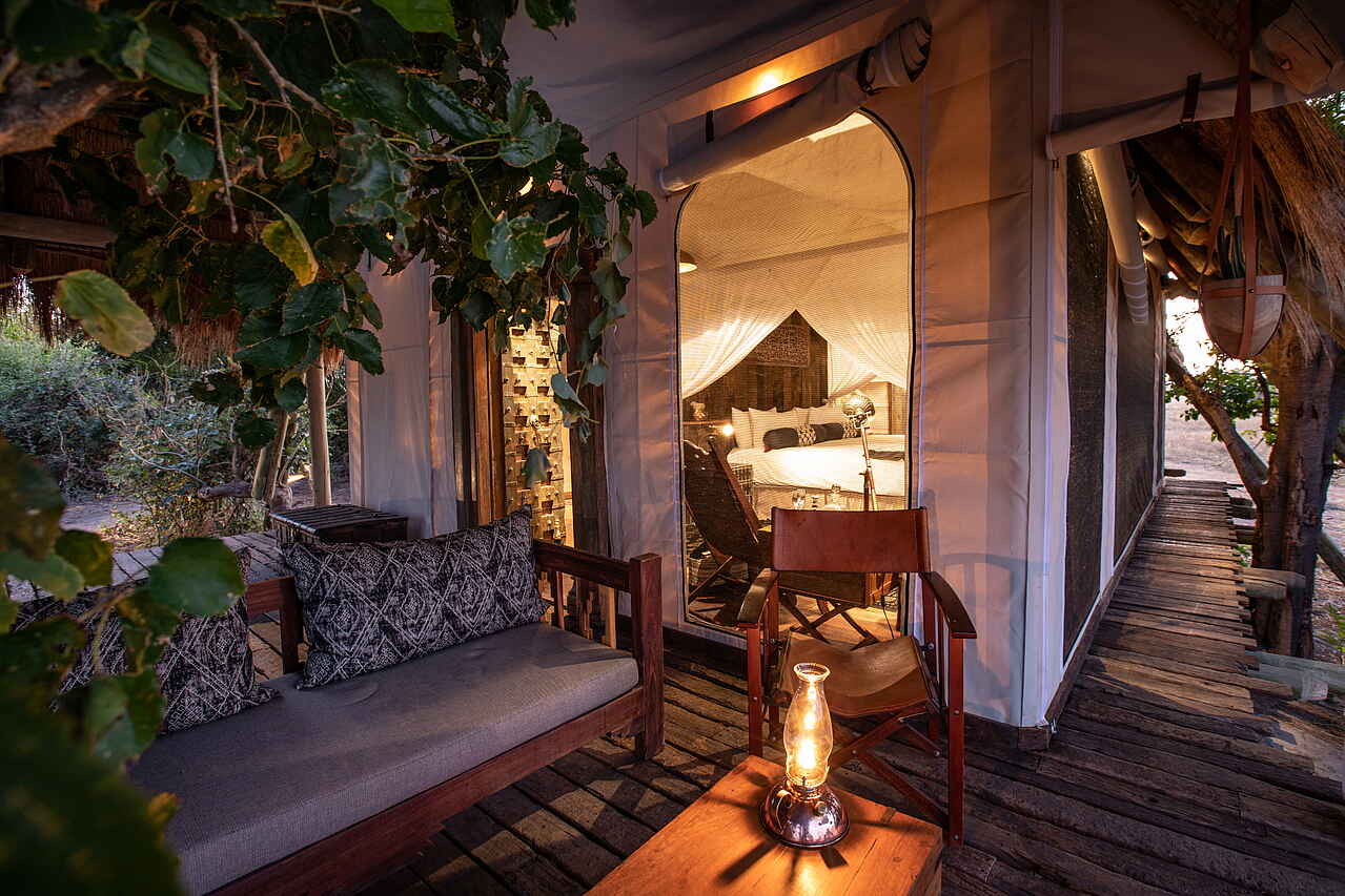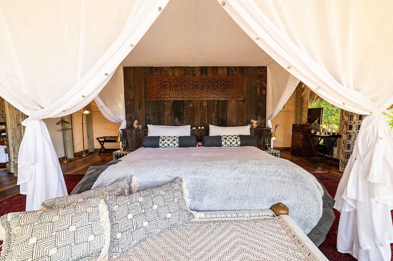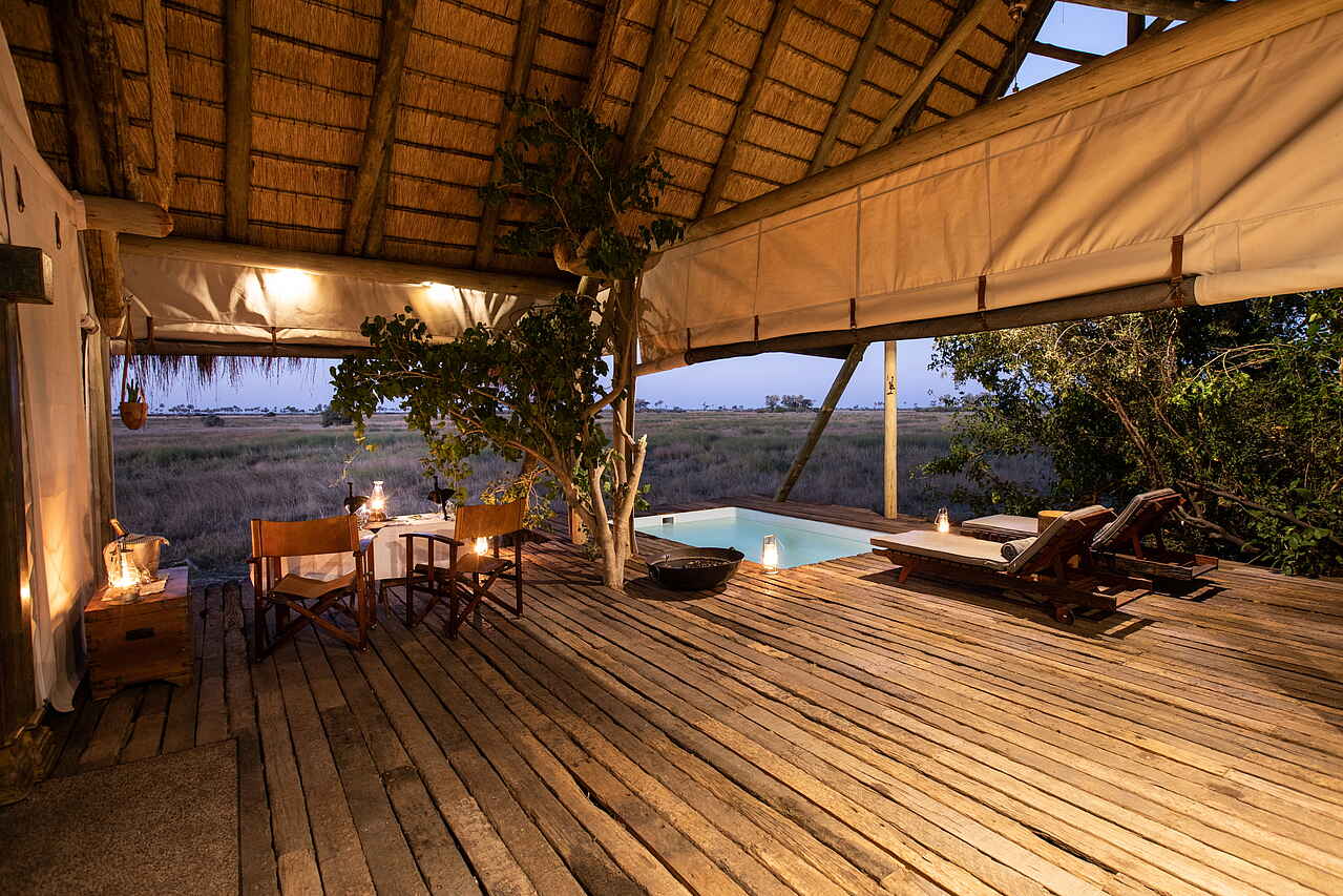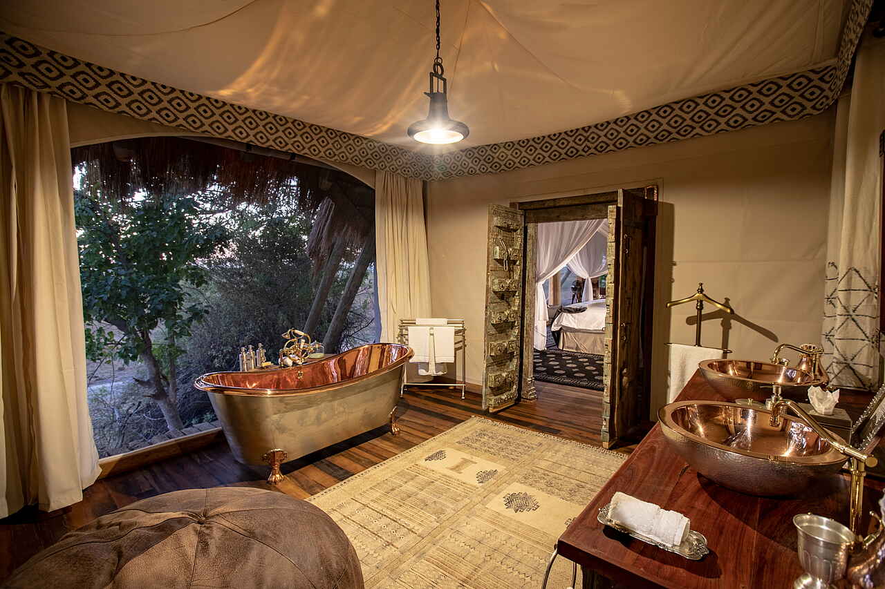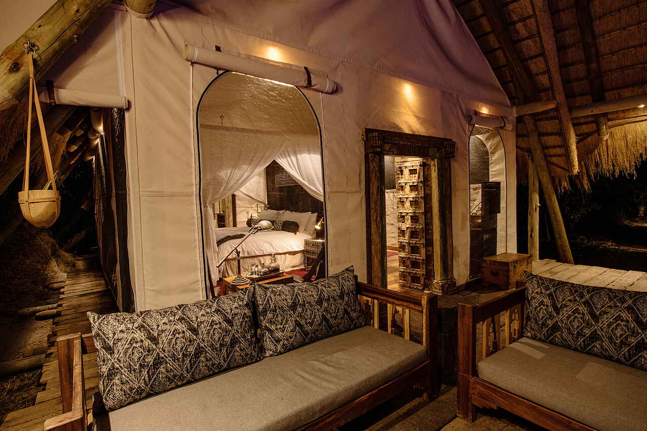 Auf erhöhten Holzplattformen stehen drei große, geschmackvoll eingerichtete, mit Reet bedeckte Zeltsuiten, die aussehen, als wären drei gegeneinander abgestufte Zelte ineinander geschoben worden. Jedes Zelt verfügt über eine große Veranda mit Blick über die Savanne, ein privates Badezimmer und einen eigenen Plungepool. Es besteht absolute Privatsphäre durch die großen Abstände zwischen den Zelten. Bis auf die Veranda können alle Bereiche der Zelte mit Fliegengittern geschützt oder mit Leinwänden ganz verschlossen werden.