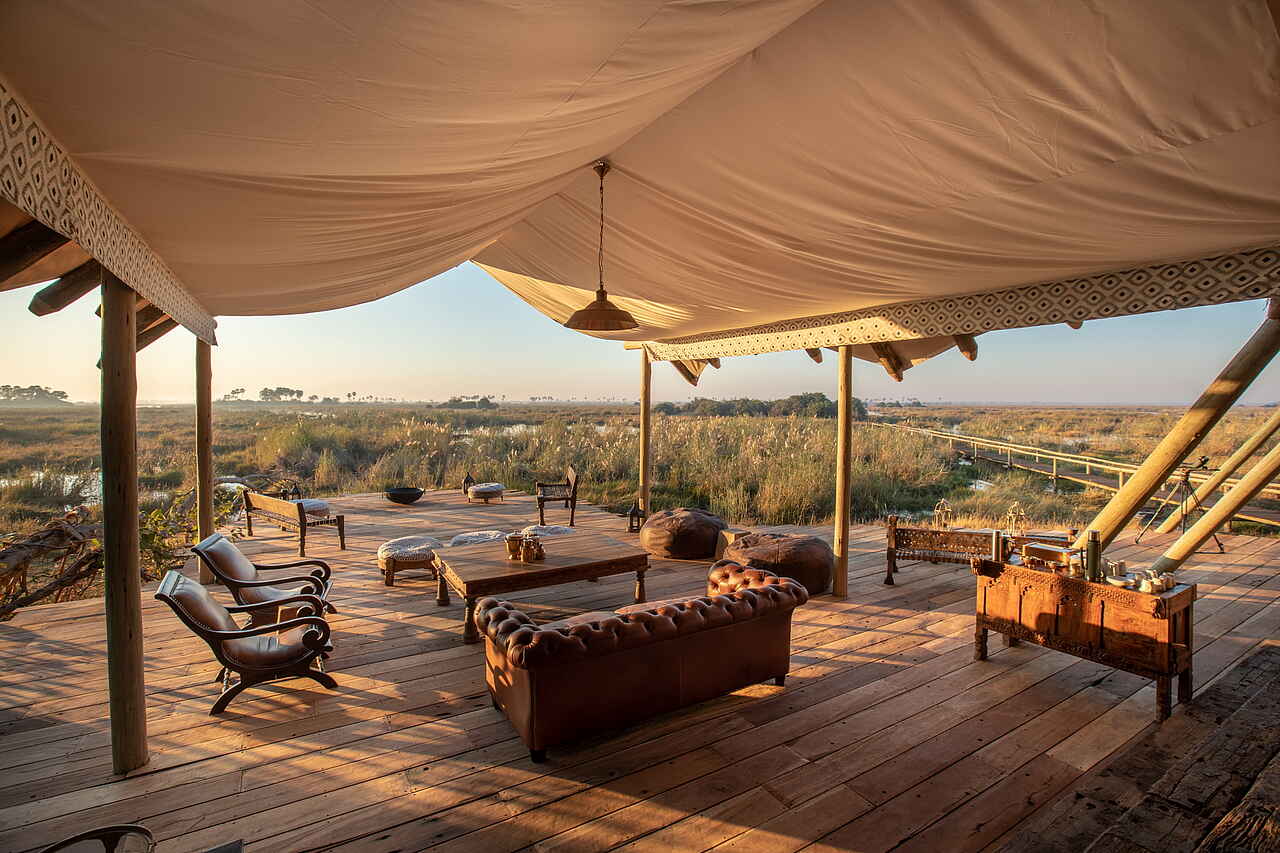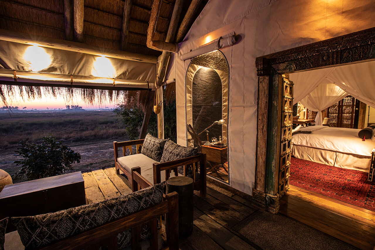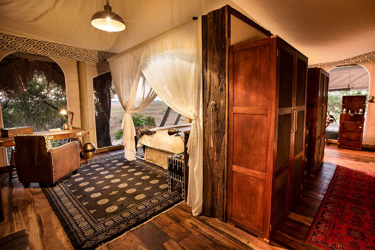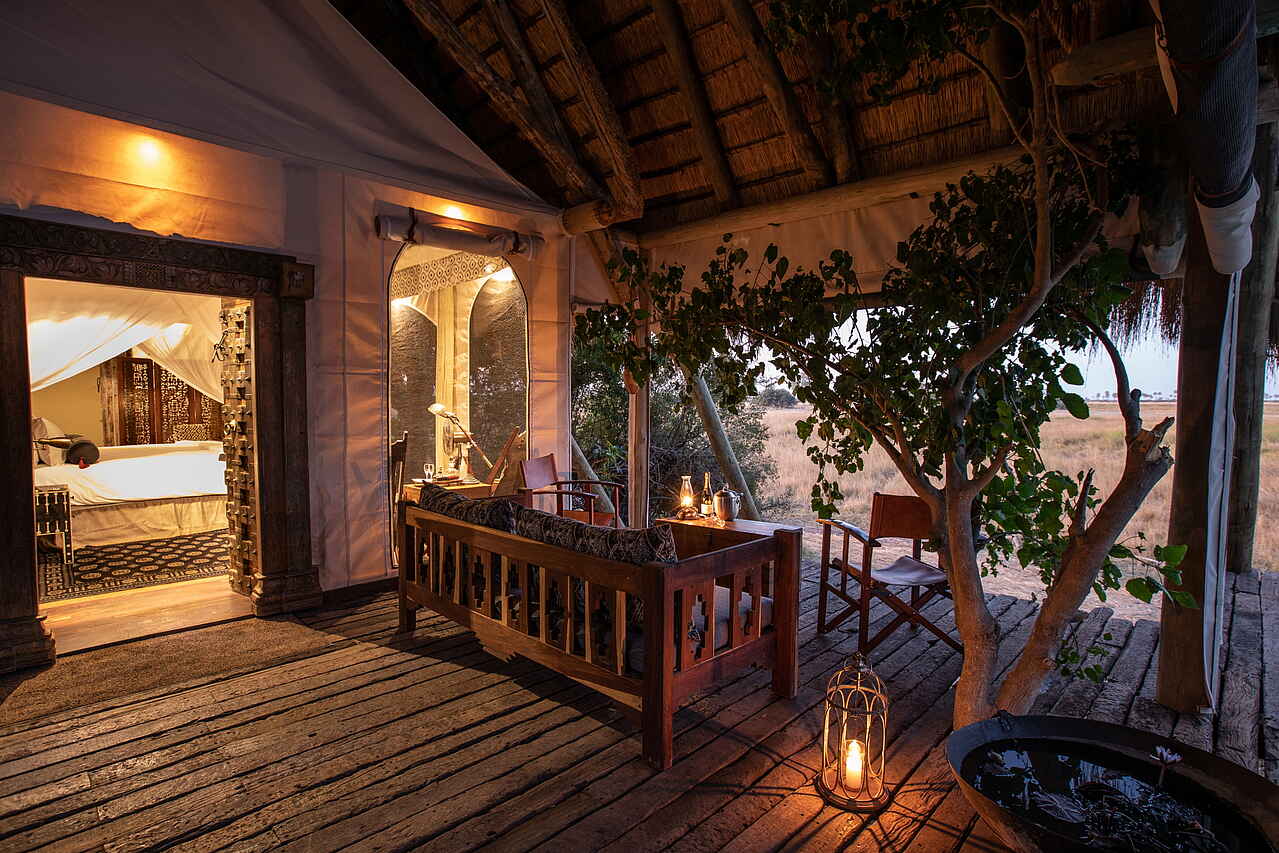 Auf erhöhten Holzplattformen stehen drei große, geschmackvoll eingerichtete, mit Reet bedeckte Zeltsuiten, die aussehen, als wären drei gegeneinander abgestufte Zelte ineinander geschoben worden. Jedes Zelt verfügt über eine große Veranda mit Blick über die Savanne, ein privates Badezimmer und einen eigenen Plungepool. Es besteht absolute Privatsphäre durch die großen Abstände zwischen den Zelten. Bis auf die Veranda können alle Bereiche der Zelte mit Fliegengittern geschützt oder mit Leinwänden ganz verschlossen werden.