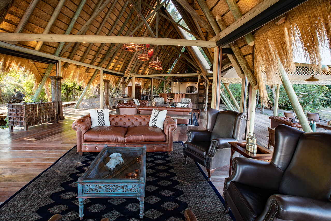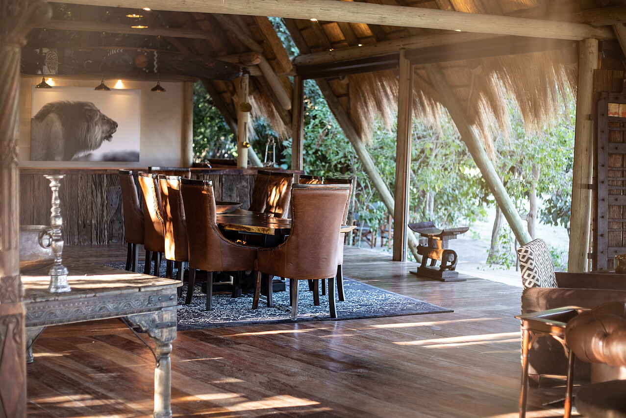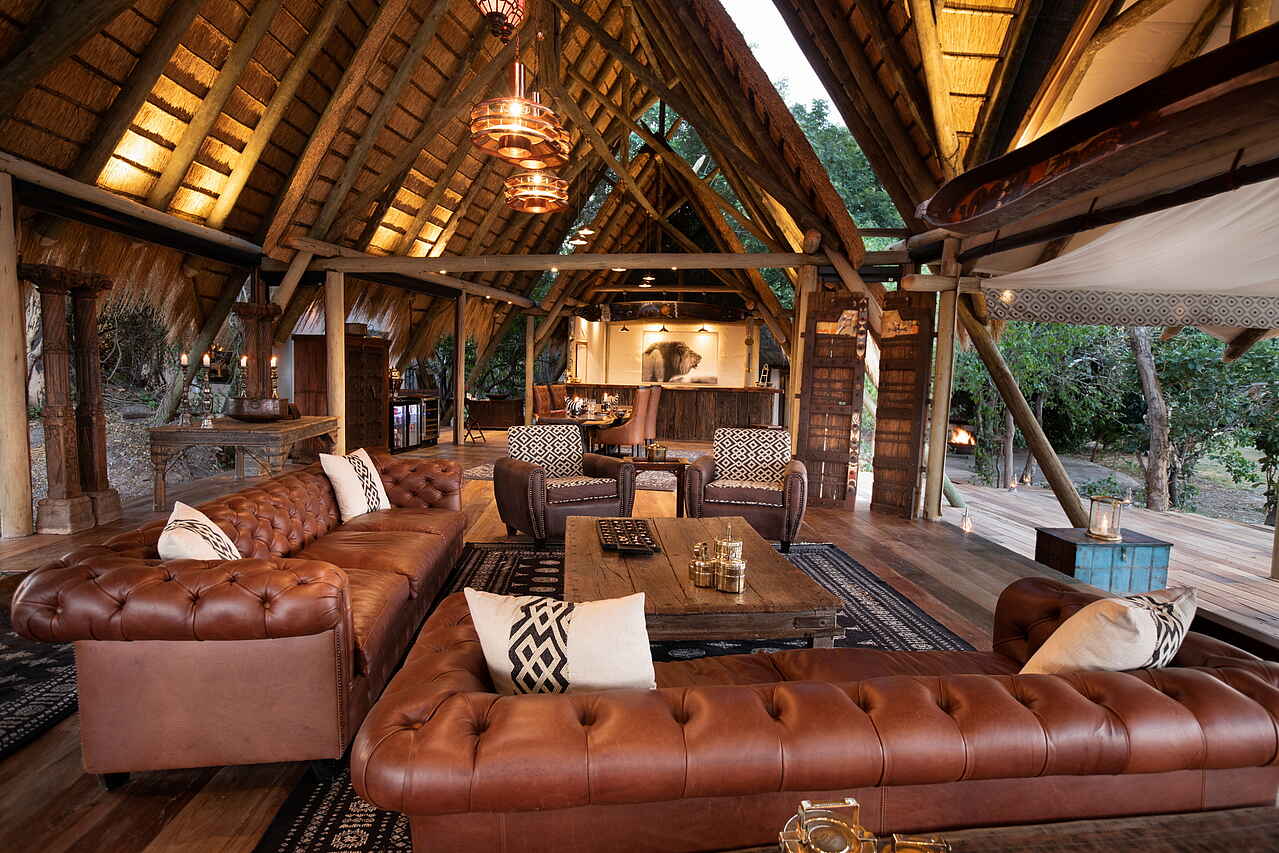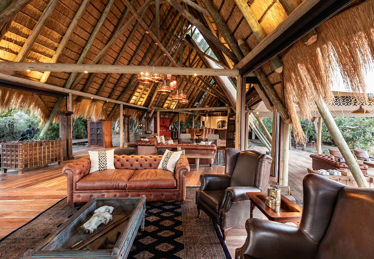 Im Inneren liegen Perserteppiche auf dunklen Holzdielen. Üppige Lederpolstersessel und Sofas sorgen für gediegenes Ambiente. Ausgesuchte Fotografien von Beverly und Dereck Joubert hängen wohlplatziert an den Wänden. Hier und da werden durch Truhen, schwere Tische oder geschnitzte Säulen dekorative Akzente gesetzt.