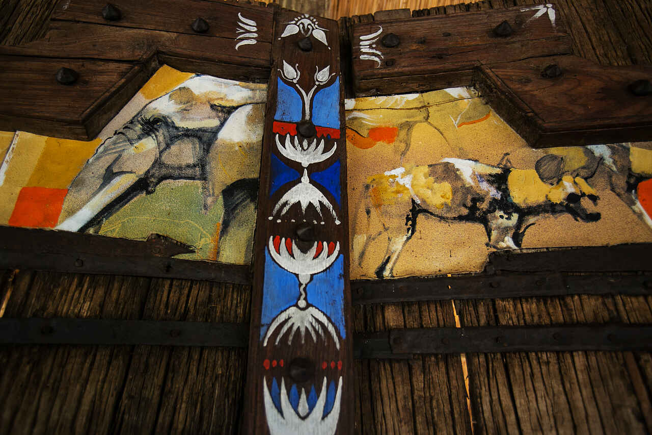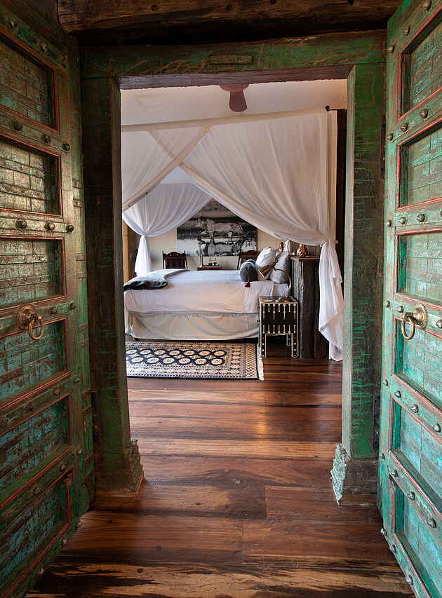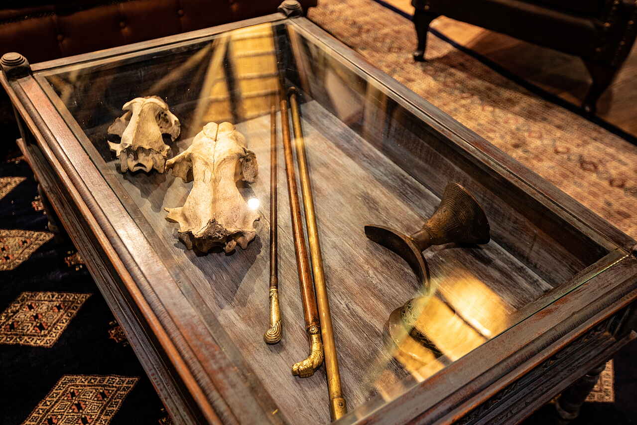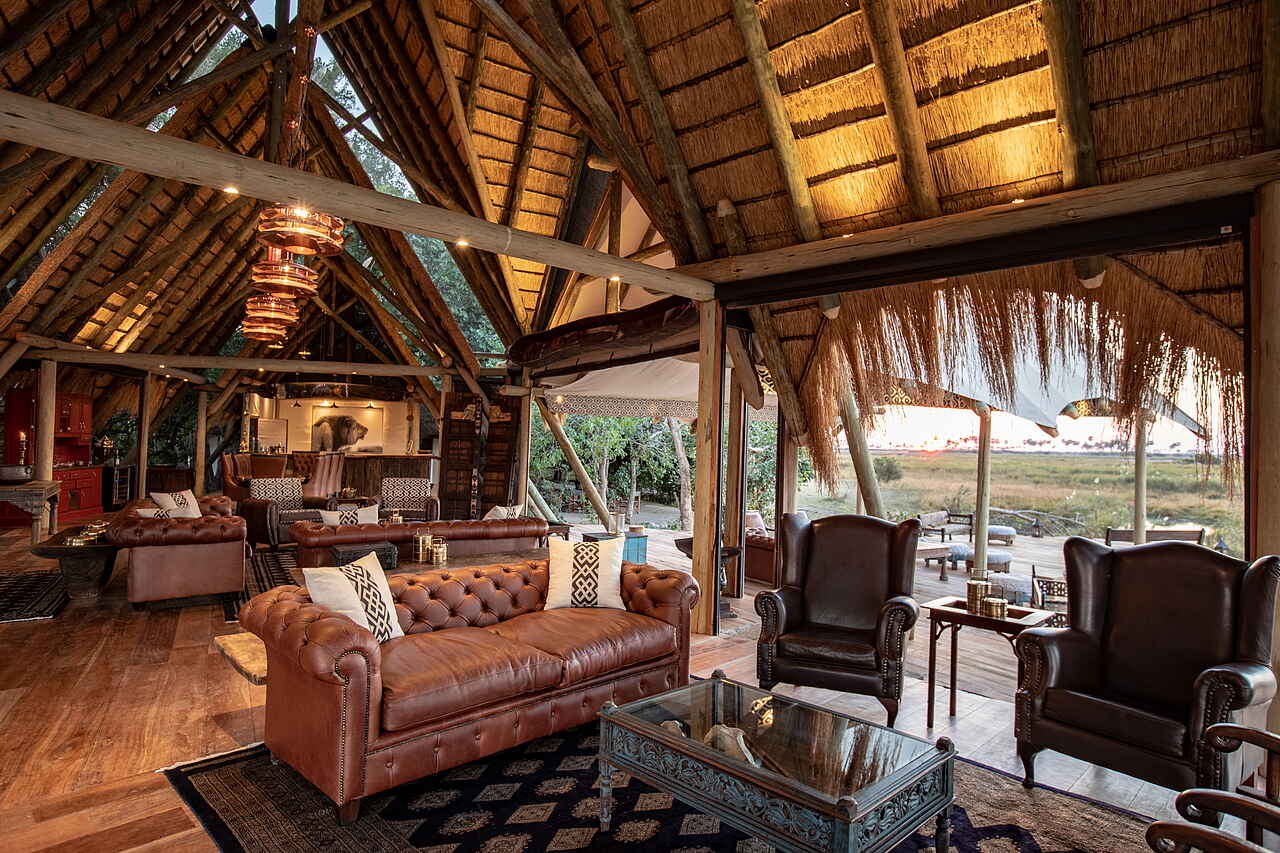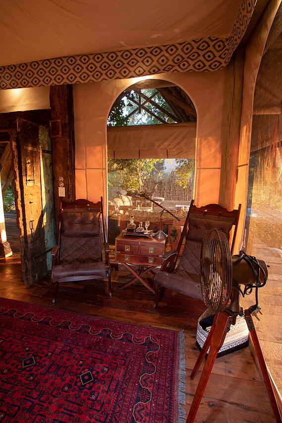 Im Inneren liegen Perserteppiche auf dunklen Holzdielen. Üppige Lederpolstersessel und Sofas sorgen für gediegenes Ambiente. Ausgesuchte Fotografien von Beverly und Dereck Joubert hängen wohlplatziert an den Wänden. Hier und da werden durch Truhen, schwere Tische oder geschnitzte Säulen dekorative Akzente gesetzt.
