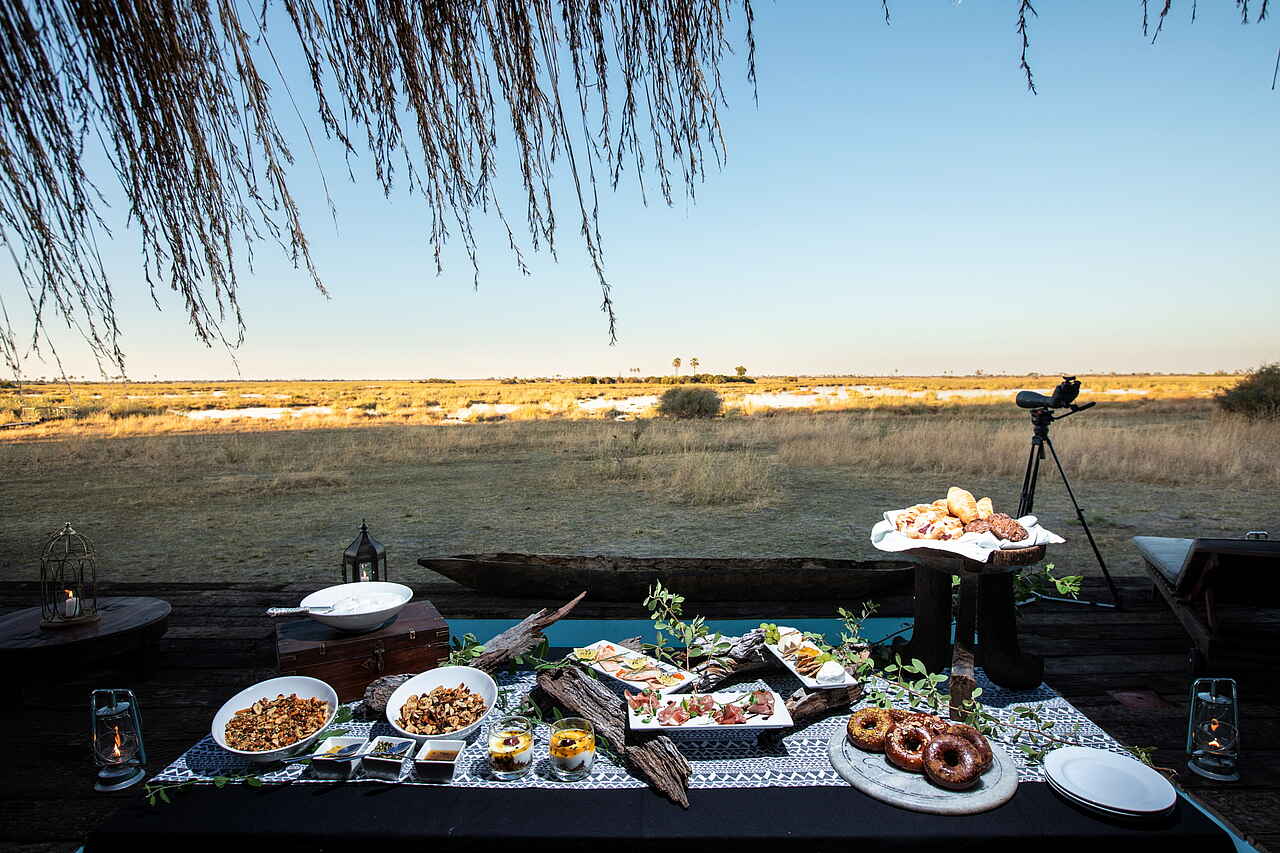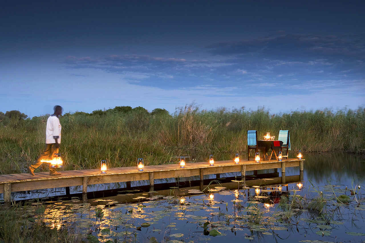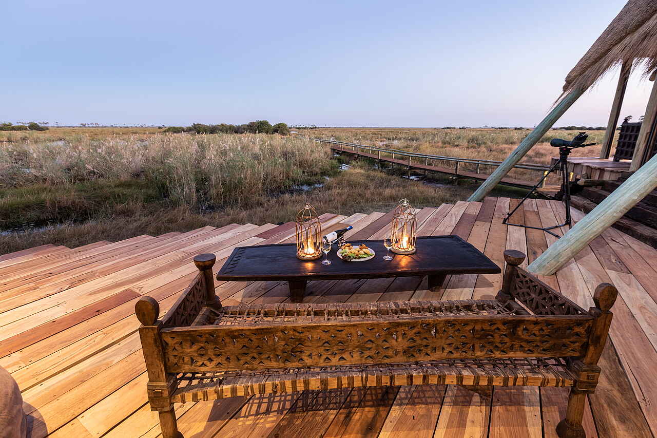Dinner kann grundsätzlich überall serviert werden: Im Speisebereich, auf dem großen Deck unter freiem Himmel, auf der privaten Veranda, am Ende des Bootsanlegestegs oder auch im Busch, sofern die Umstände es erlauben.