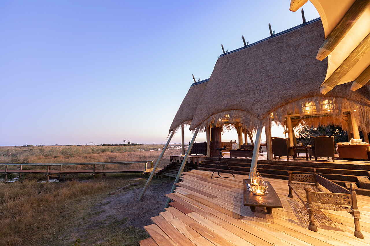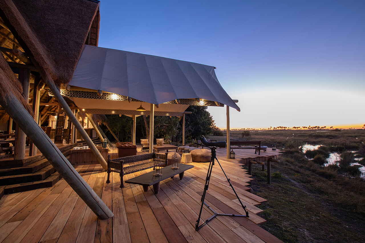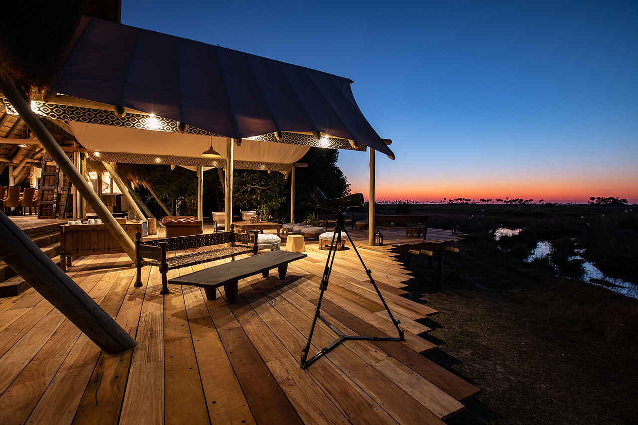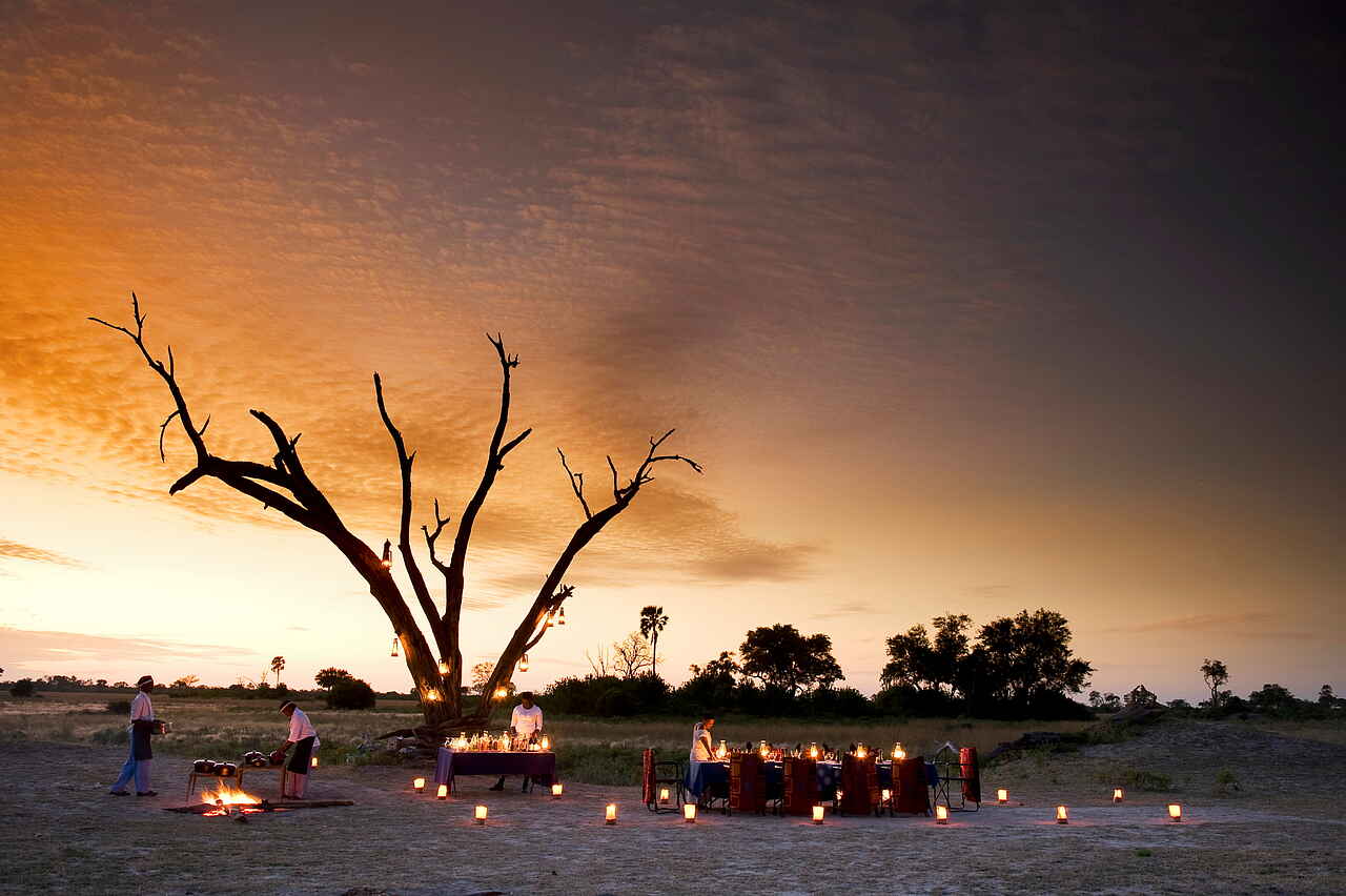 Dinner kann grundsätzlich überall serviert werden: Im Speisebereich, auf dem großen Deck unter freiem Himmel, auf der privaten Veranda, am Ende des Bootsanlegestegs oder auch im Busch, sofern die Umstände es erlauben.