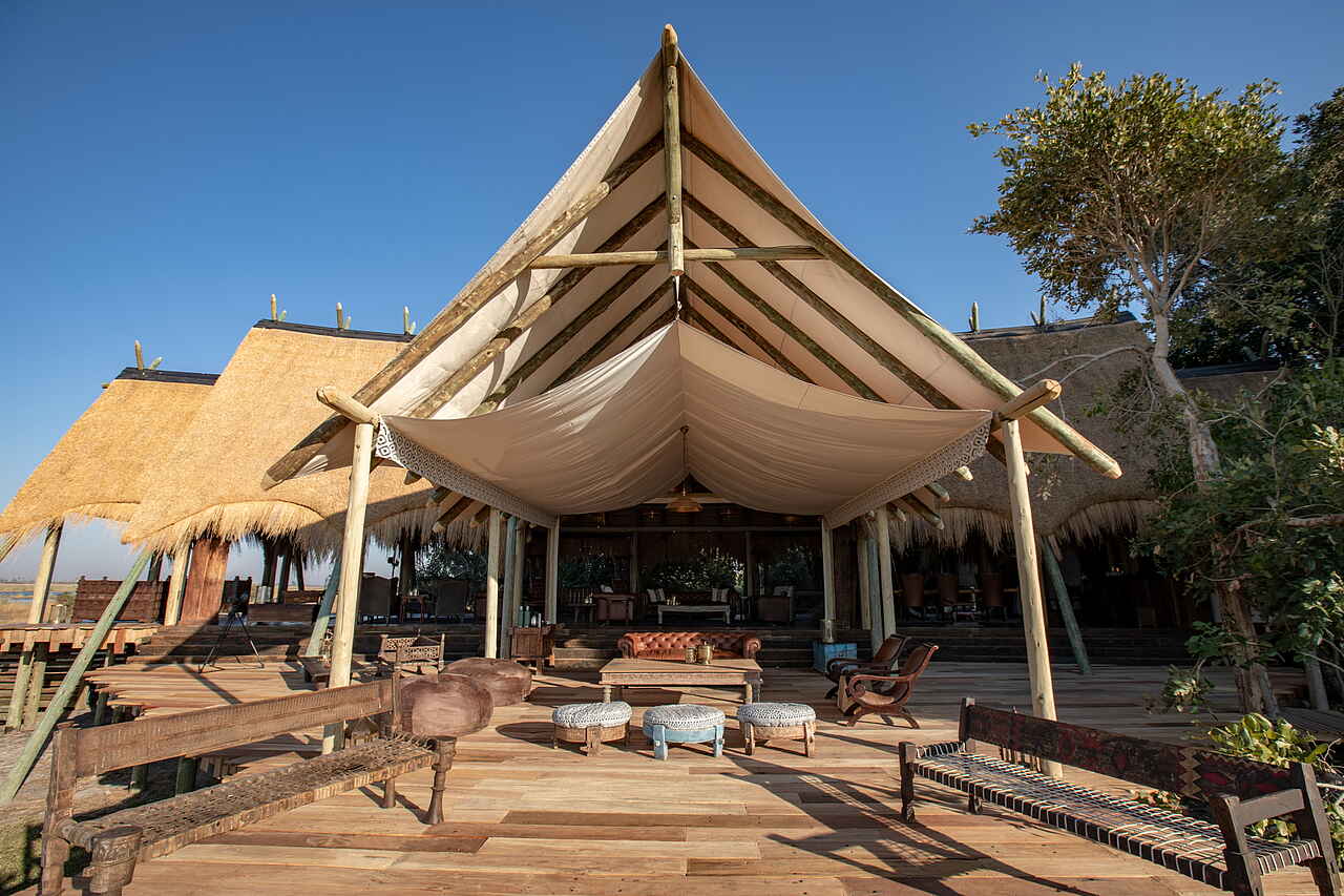 Das Haupthaus steht erhöht auf einer Holzplattform. Auf dem über 5 Stufen abgesenkten, großen Deck finden alte Eisenbahnschwellen eine neue Verwendung. Ein Teil des Decks wird von einem mit Seidentüchern abgehangenen Schattendach geschützt. Der gesamte Bau ist sehr offen gehalten. Überall kann man hinaus auf die Savannen am Spillway blicken. Ein Beobachtungsfernrohr steht auf dem Deck bereit.